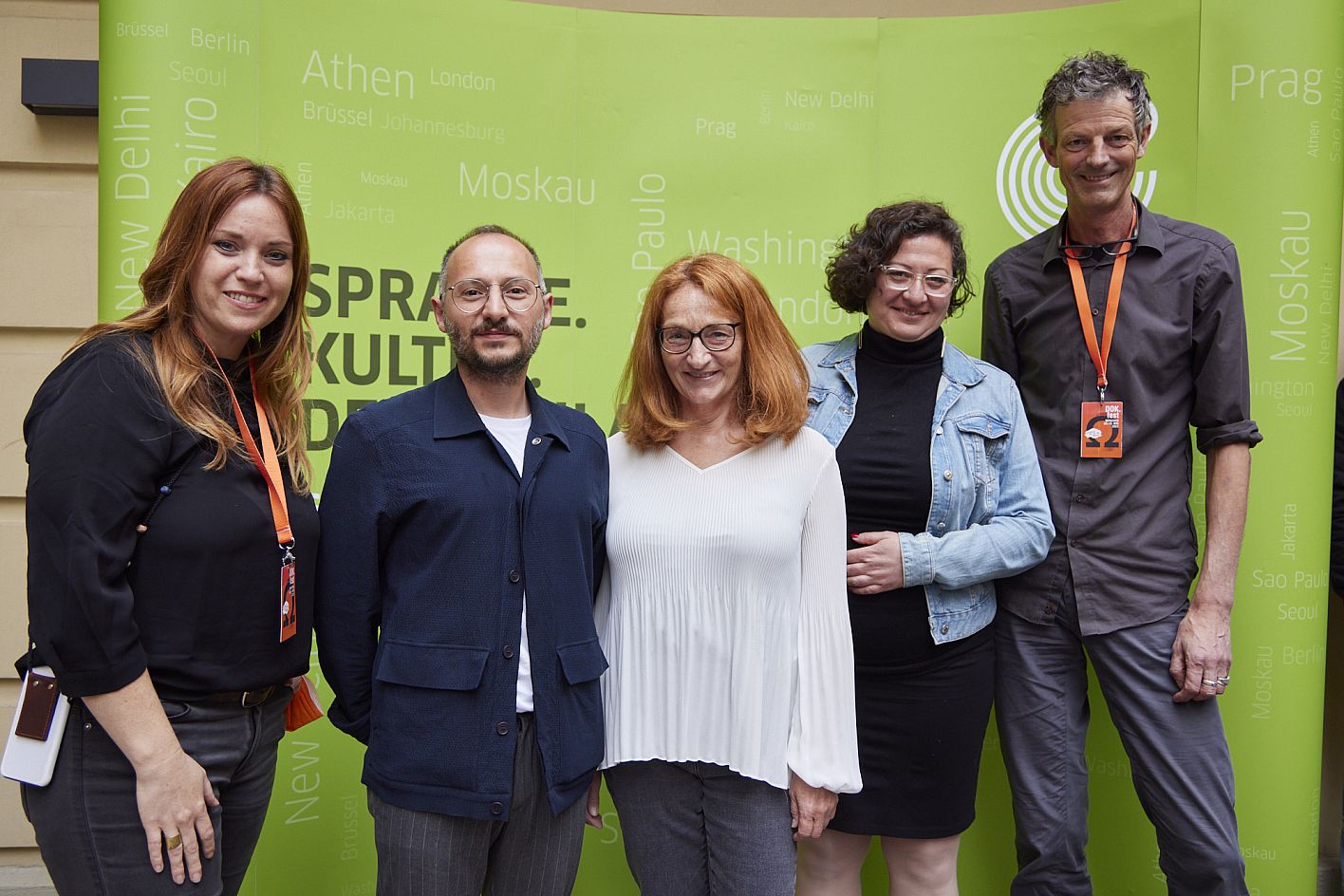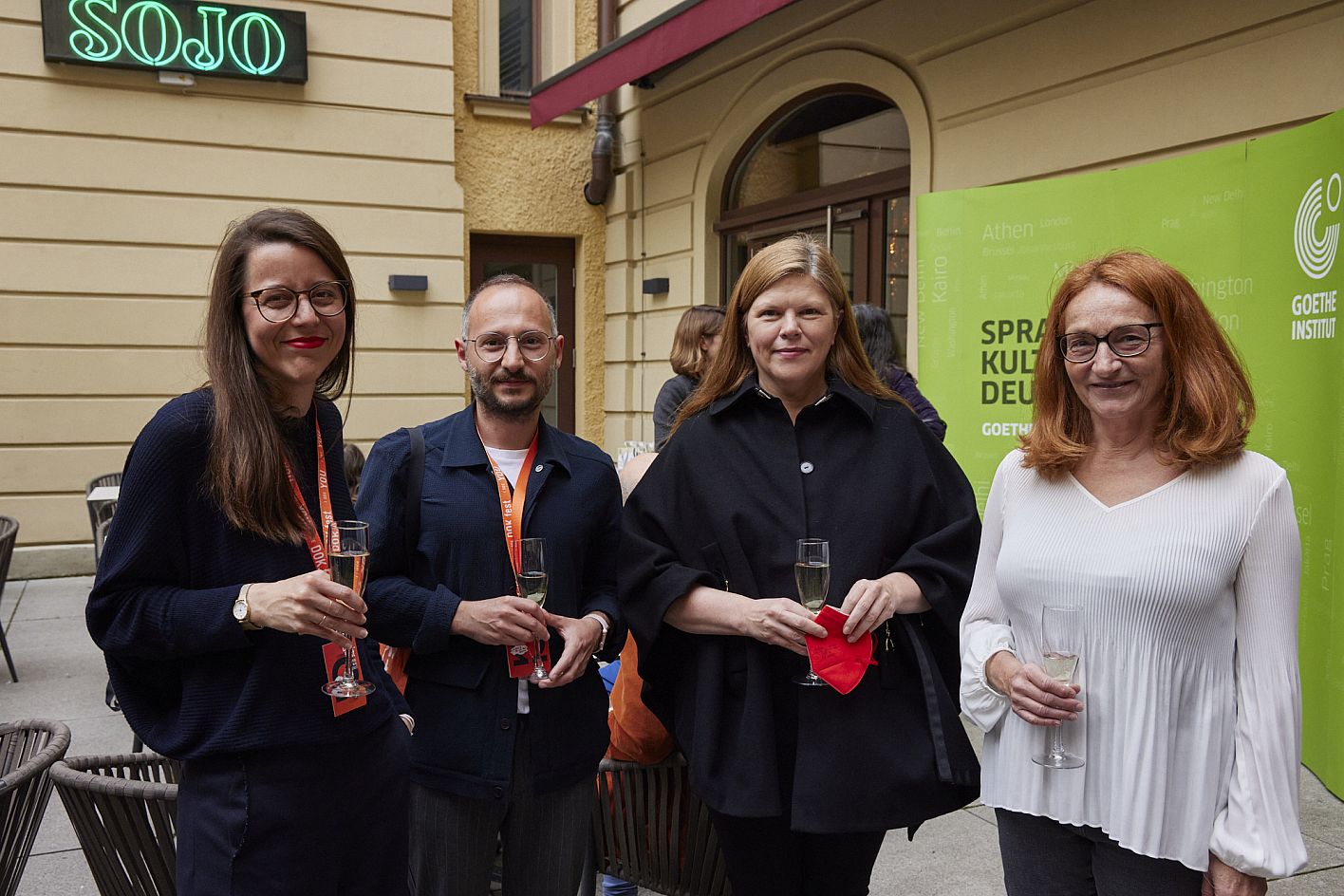 Empfang des Goethe-Instituts, Adele Kohout (Festivalleitung), Ameer Masoud (Jury), Eva Lautenschlager (Goethe-Institut, Jury), Diana El Jeiroudi (Jury), Daniel Sponsel (Festivalleitung) (c) DOK.fest München