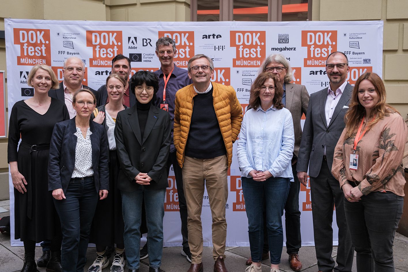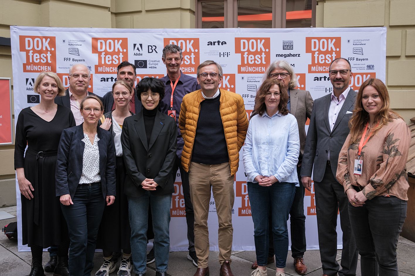 • Weltpremiere UNSERE HERZEN EIN KLANG, Simone Dobmeier (Regie, links), Torsten Striegnitz (Regie, 2.v.l. hinten), Simon Halsey (Protagonist, Chorleiter, Mitte), Hyunju Kwon (Protagonistin, Chorleiterin, 2.v.l. vorne), Daniel Sponsel (DOK.fest München, hinten Mitte), Adele Kohout (DOK.fest München, rechts) (c) DOK.fest München