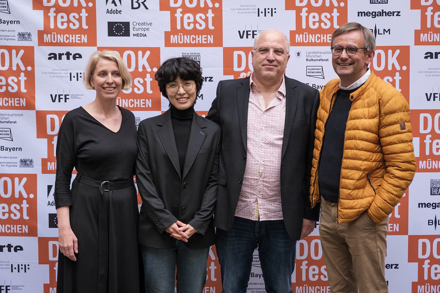 • Weltpremiere UNSERE HERZEN EIN KLANG, Simone Dobmeier (Regie, links), Hyunju Kwon (Protagonistin, Chorleiterin), Torsten Striegnitz (Regie, 2.v.l.), Simon Halsey (Protagonist, Chorleiter, Mitte) (c) DOK.fest München