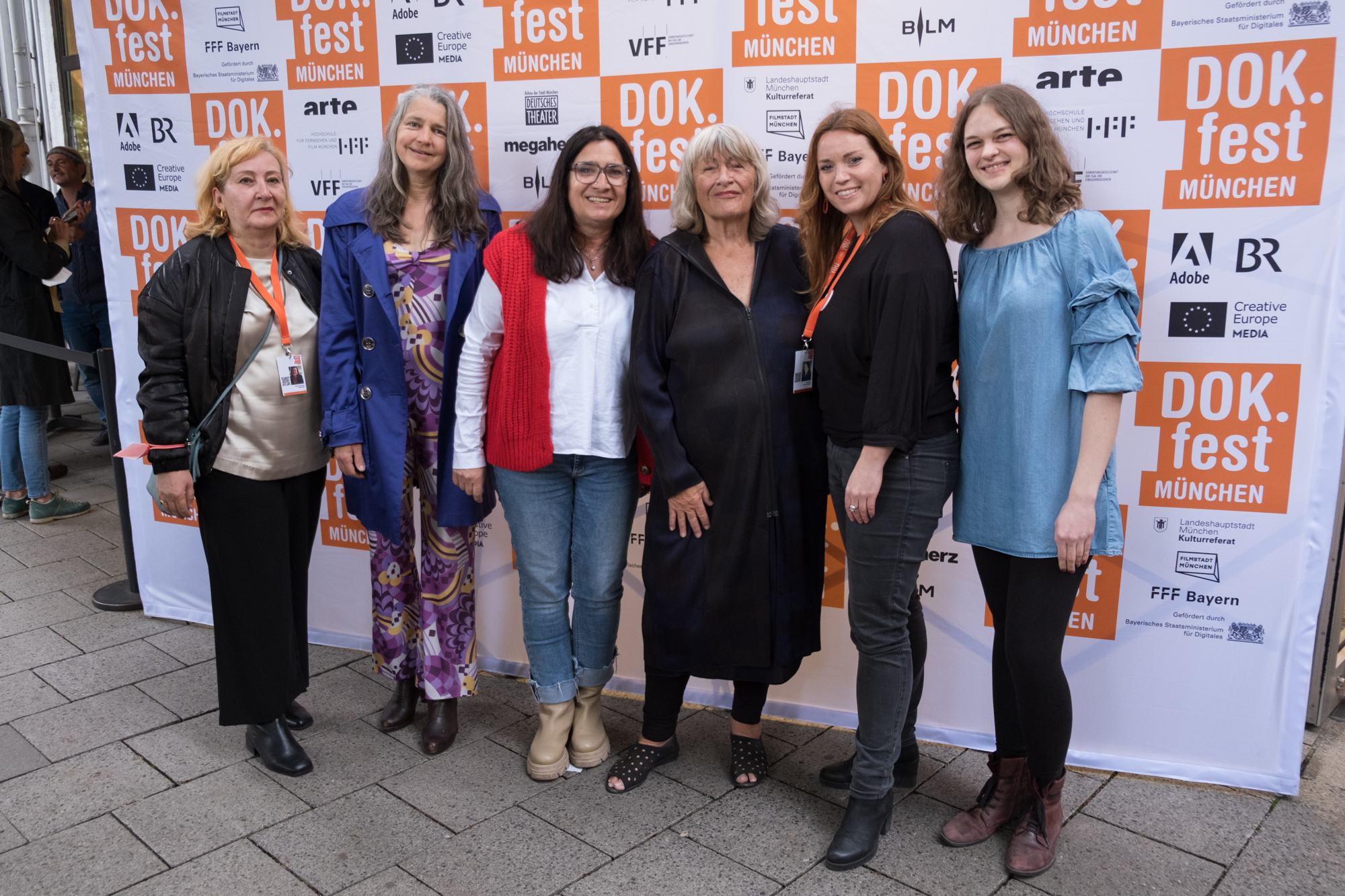 • Internationale Premiere ALICE SCHWARZER, Sabine Derflinger (Regie, 3.v.l.), Alice Schwarzer (Protagonistin, Mitte) & Filmteam, Adele Kohout (DOK.fest München, 3.v.r.), Christina Wolf (rechts) (c) DOK.fest München