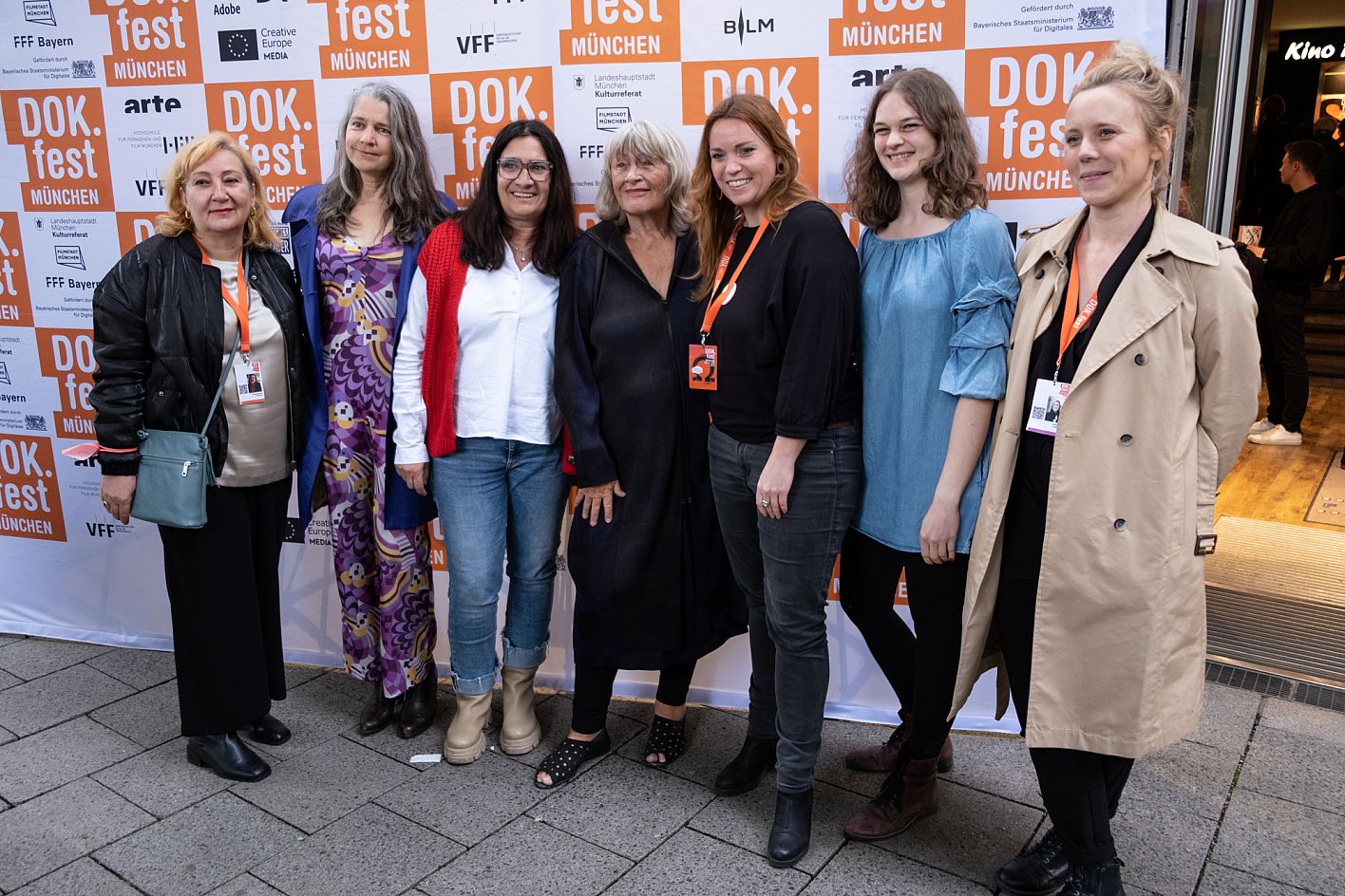 Internationale Premiere ALICE SCHWARZER, Sabine Derflinger (Regie, 3.v.l.), Alice Schwarzer (Protagonistin, Mitte) & Filmteam, Adele Kohout (DOK.fest München, 3.v.r.), Christina Wolf (rechts) (c) DOK.fest München