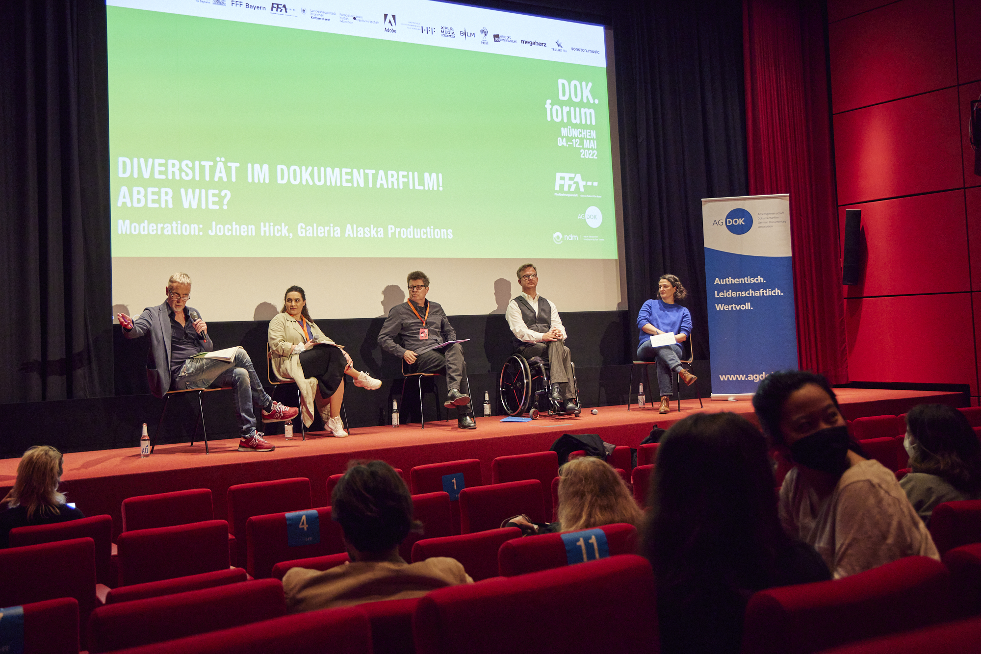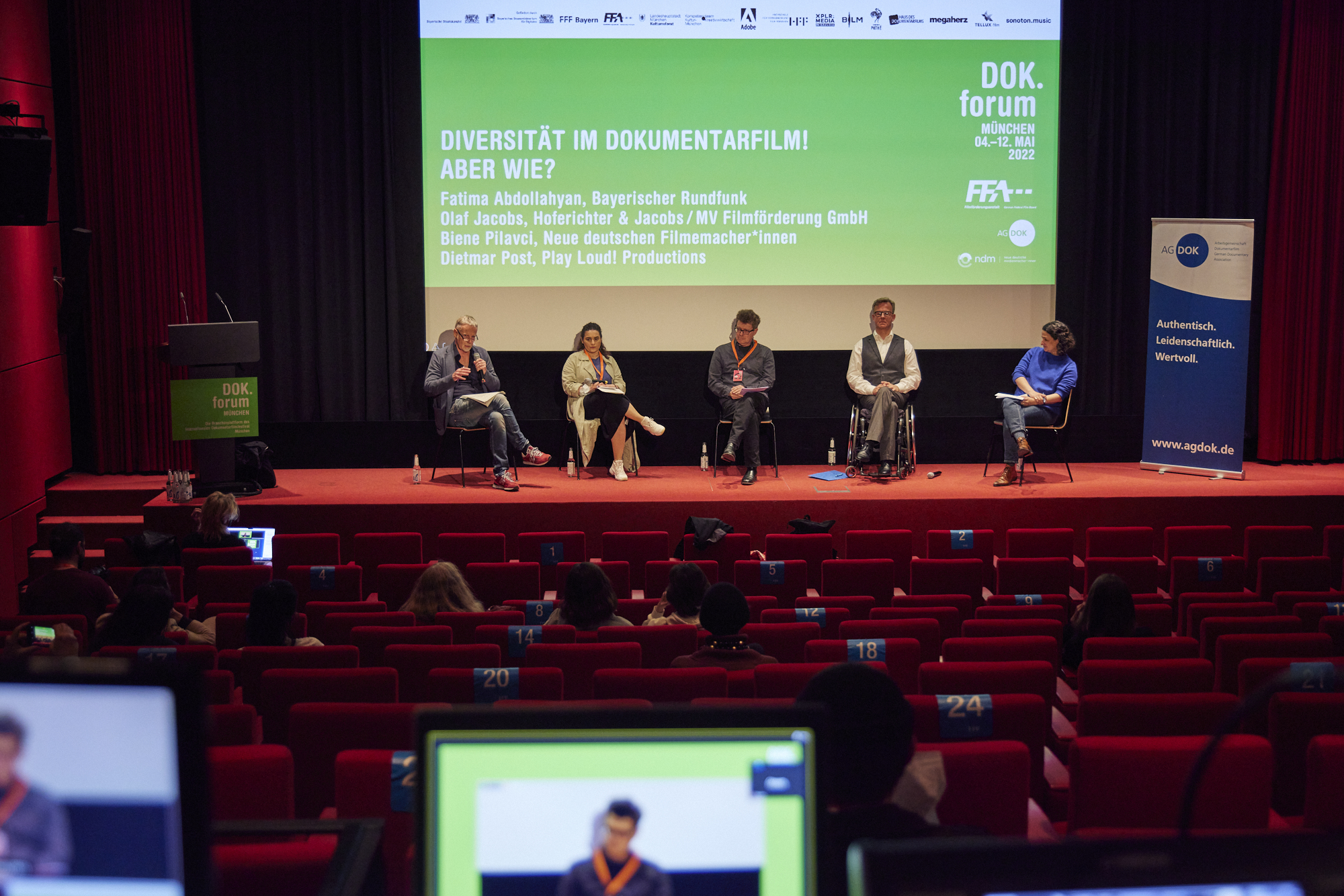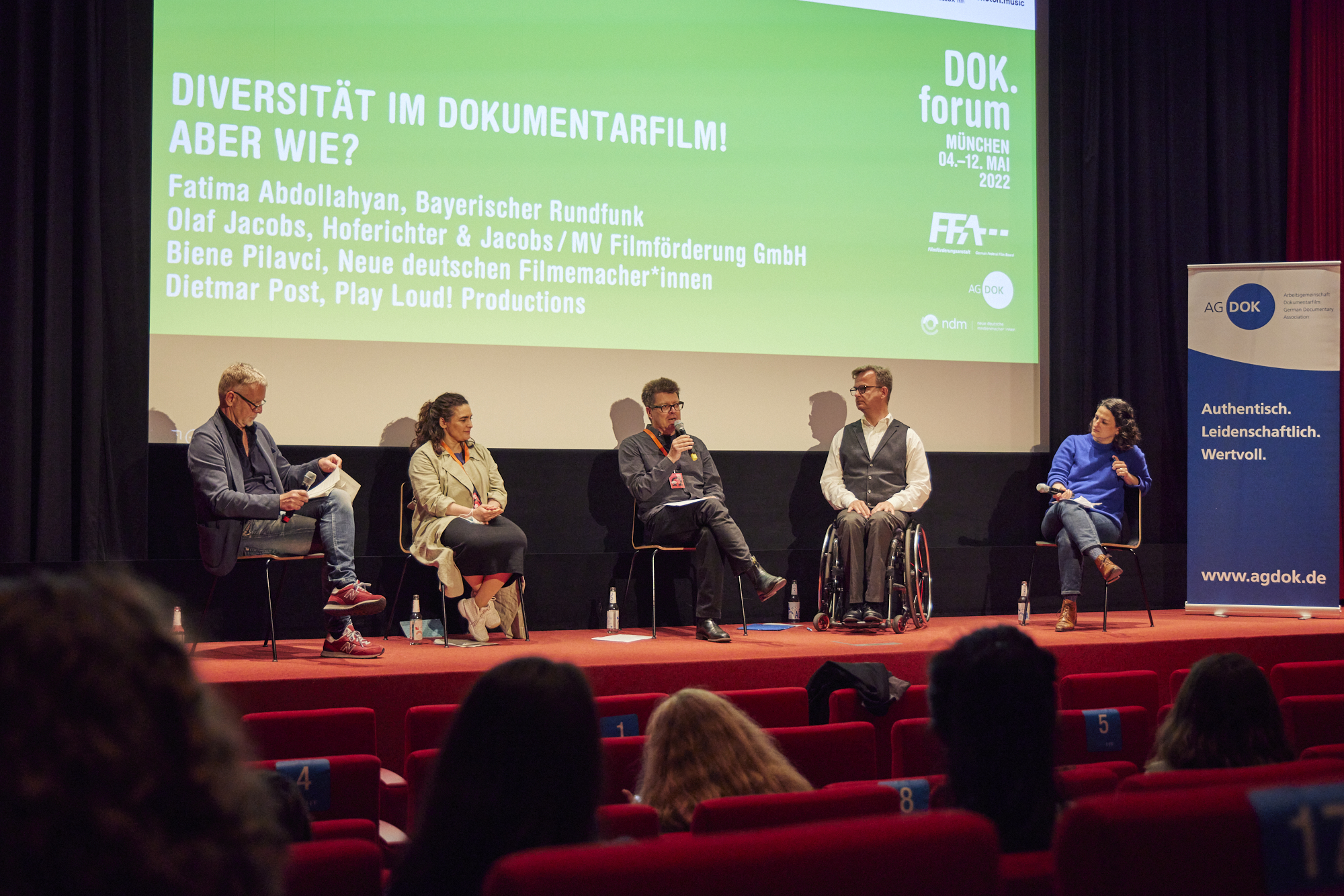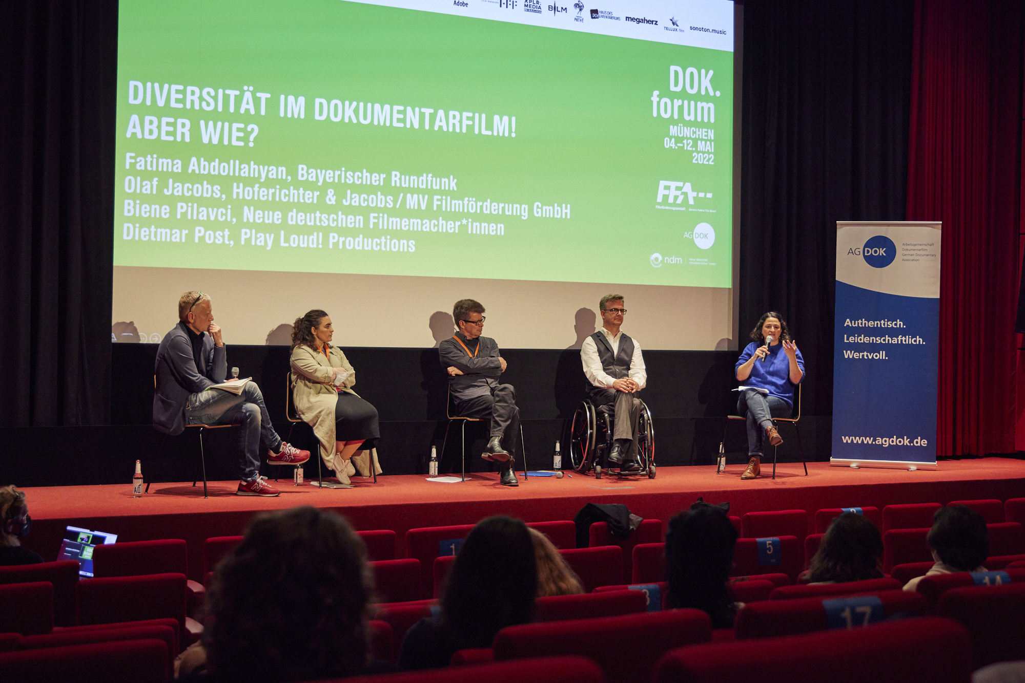 • Diversität im Dokumentarfilm! Aber wie?, Fatima Abdollahyan BR, Olaf Jacobs MV Filmförderung GmbH, Biene Pilavci Neue deutschen Medienmacher*innen, Dietmar Post Play Loud! Productions, Moderator Jochen Hick, (c) DOK.fest München.