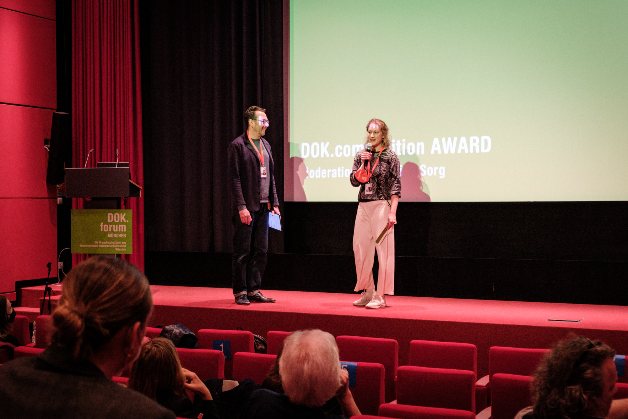 DOK.composition Award Pitchings, Moderator Sebastian Sorg und Sina Weber Leiterin DOK.forum Marktplatz, (c) DOK.fest München.