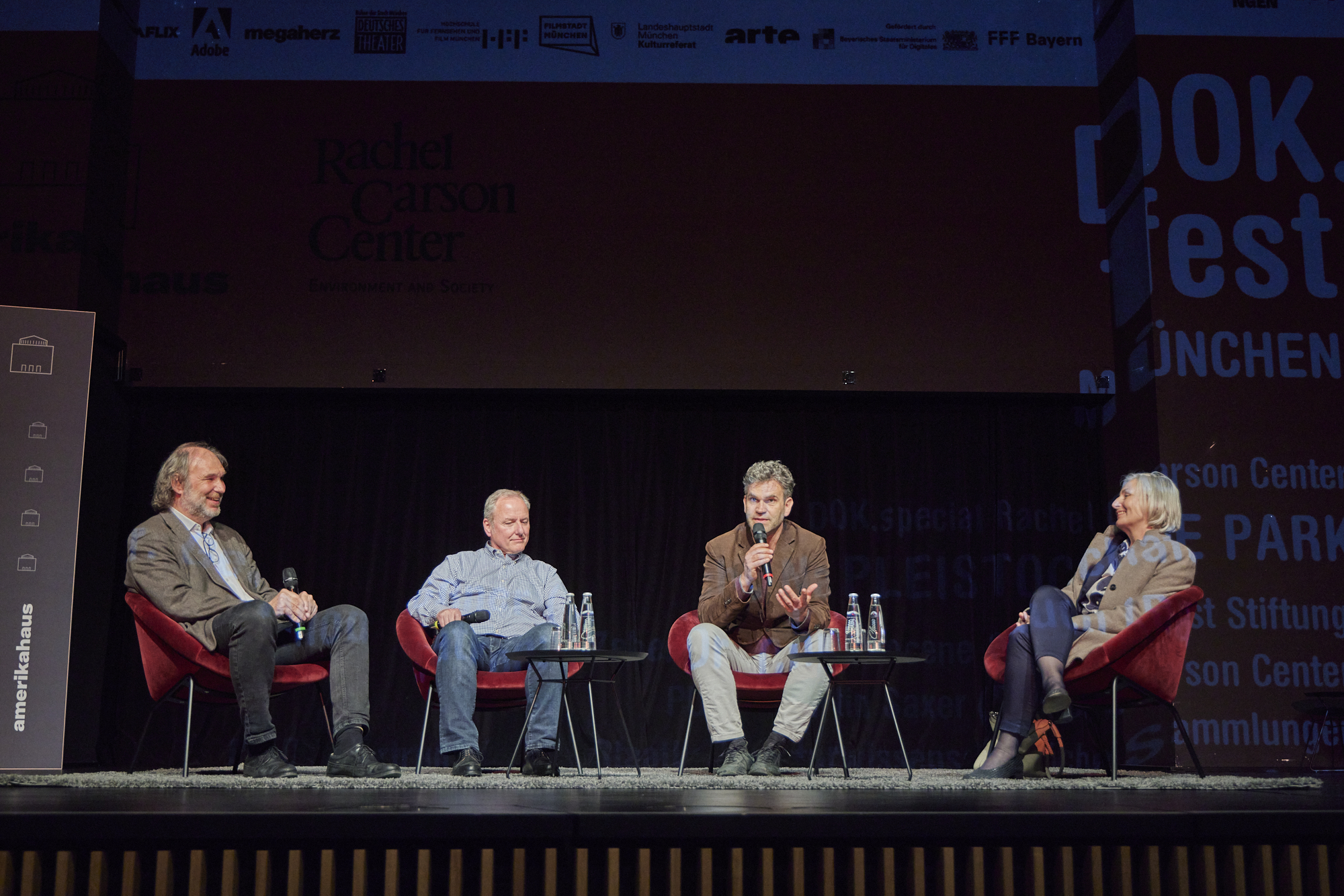 DOK.special PLEISTOCENE PARK, Dr. Christof Mauch (Moderation/RCC), Bernd Zehentbauer (Pleistocene & Permafrost Stiftung), Dr. Martin Saxer (RCC), Dr. Gertrud Rößner (Staatliche Naturwissenschaftliche Sammlungen)(c) DOK.fest München.
