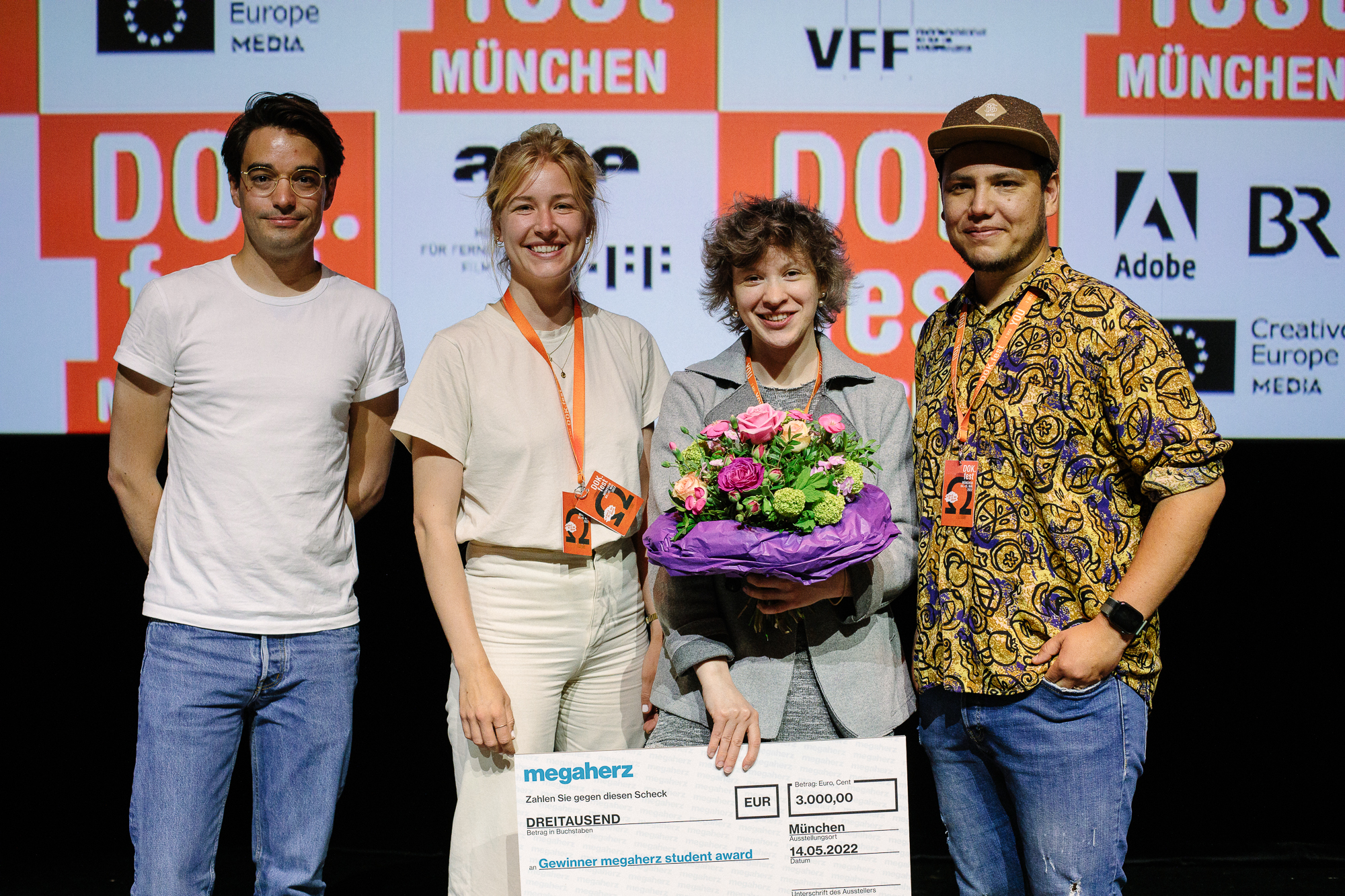 Hauptpreisverleihung 37. DOK.fest München, Robert Mayer (megaherz), Marie Wald (Jury Student Award), Lesia Kordonets (Preisträgerin megaherz Student Award), Camilo Berstecher Barrero (Jury Student Award) (c) DOK.fest München