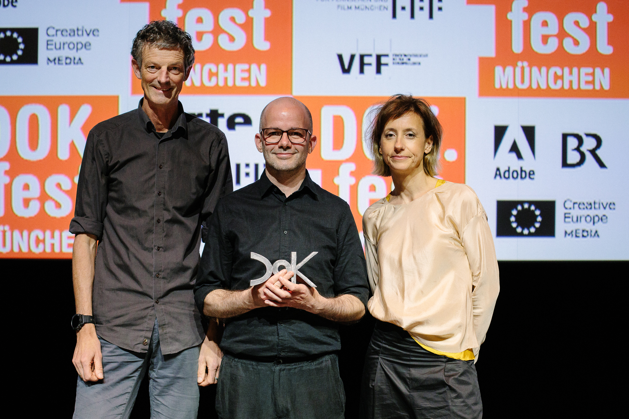 Hauptpreisverleihung 37. DOK.fest München, Daniel Sponsel (Festivalleiter), Felix Klee (Preisträger FFF Färderpreis Dokumentarfilm), Saskia Wagner (FFF Bayern) (c) DOK.fest München