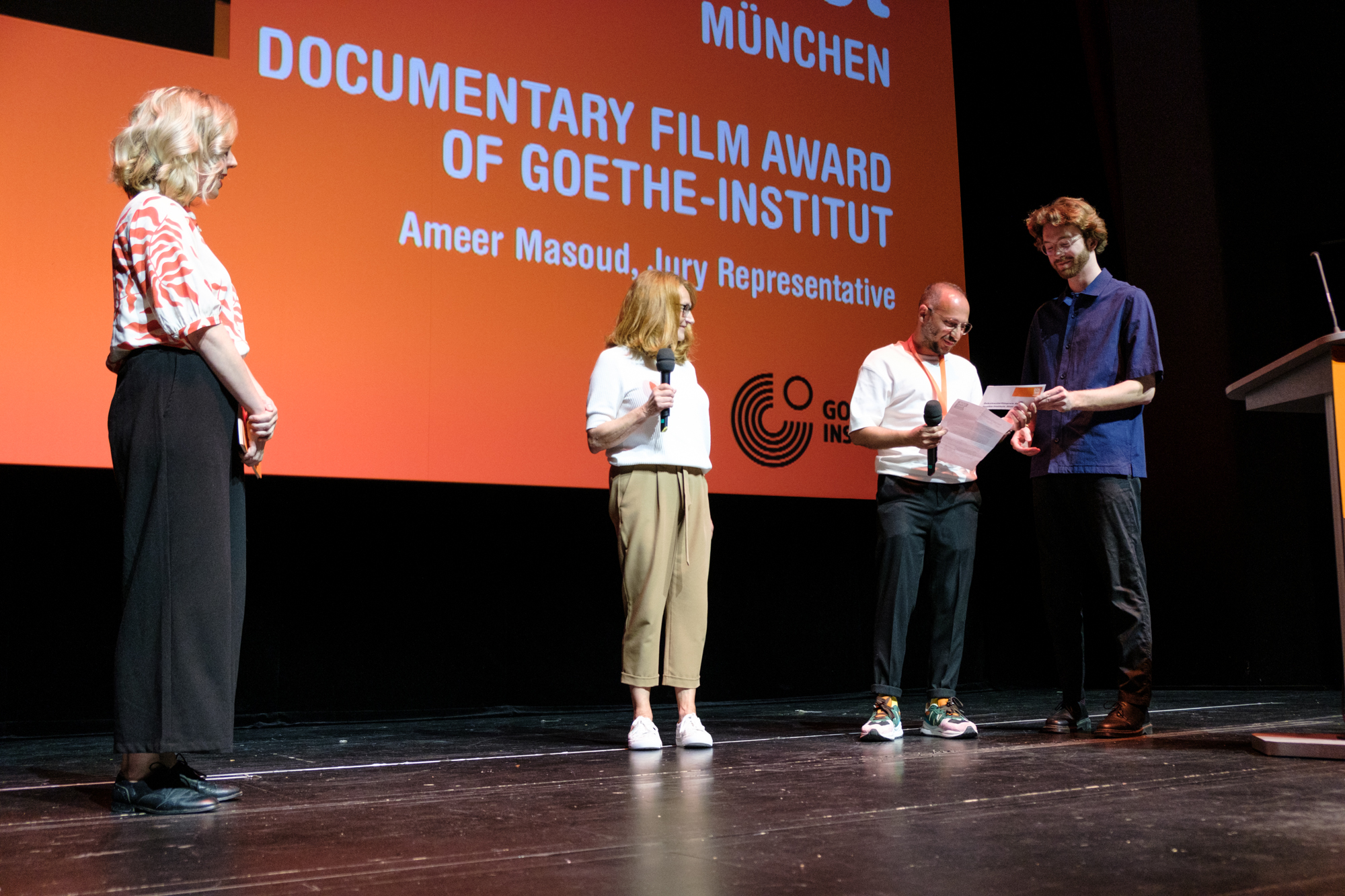 Hauptpreisverleihung 37. DOK.fest München im Deutschen Theater, Daniel Sponsel (Festivalleiter), Eva Lautenschlager (Goethe-Institut), Ameer Masoud (Jury) (c) DOK.fest München