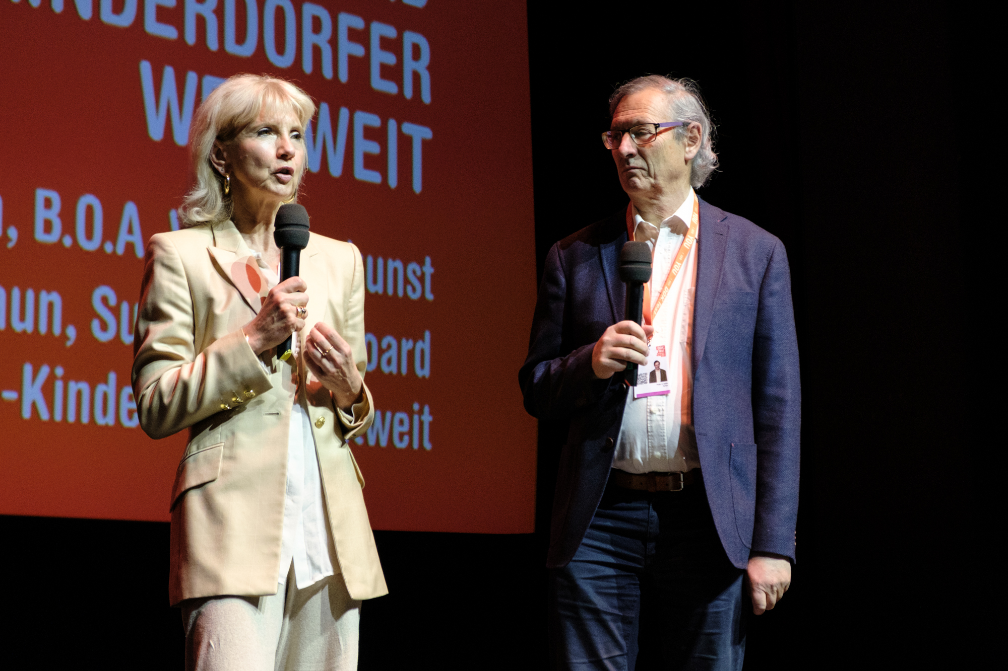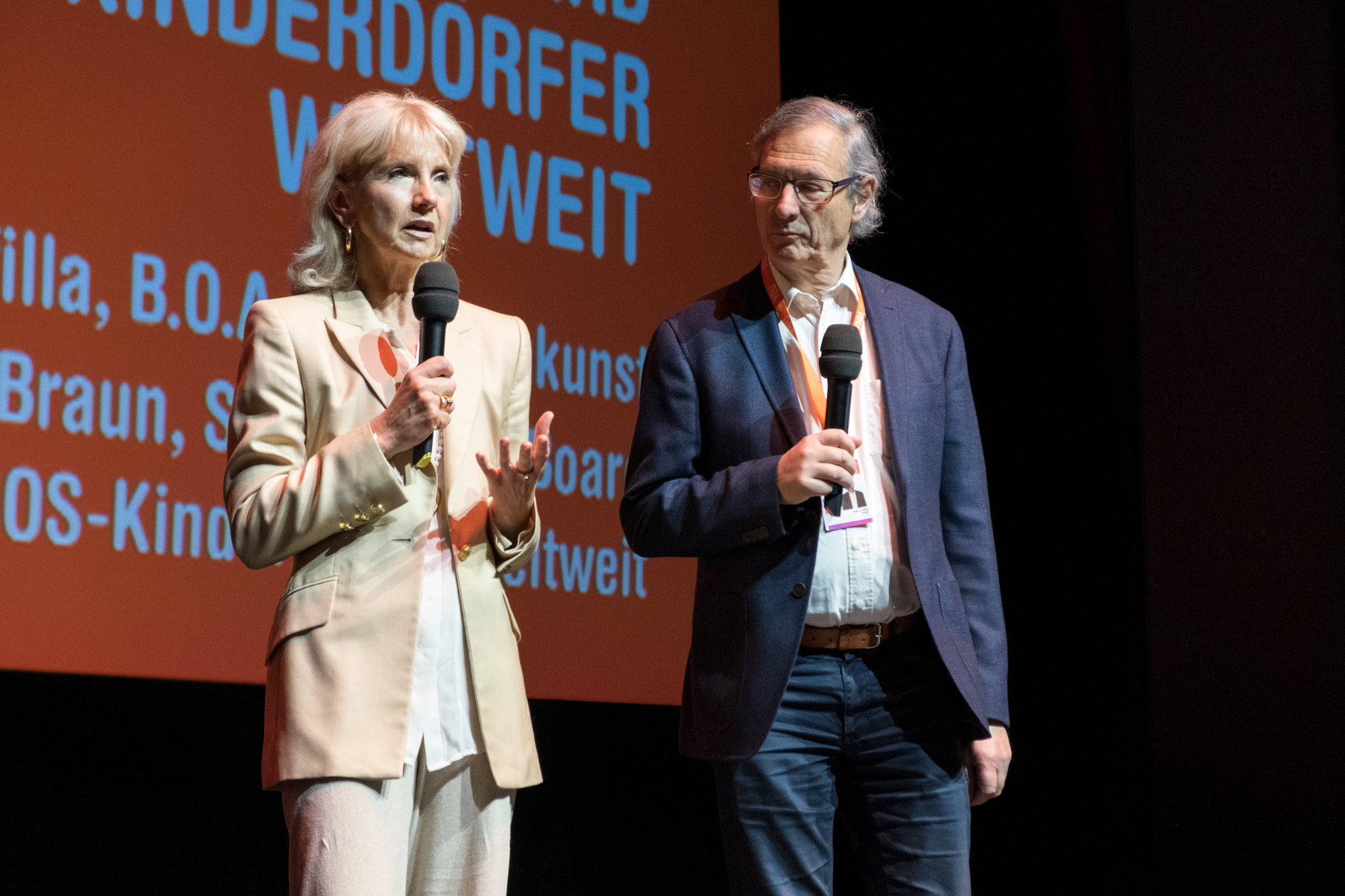 Hauptpreisverleihung 37. DOK.fest München, Prof. Michaela Braun (SOS-Kinderdörfer weltweit), Peider A. Defilla (B.O.A. Videofilmkunst) (c) DOK.fest München