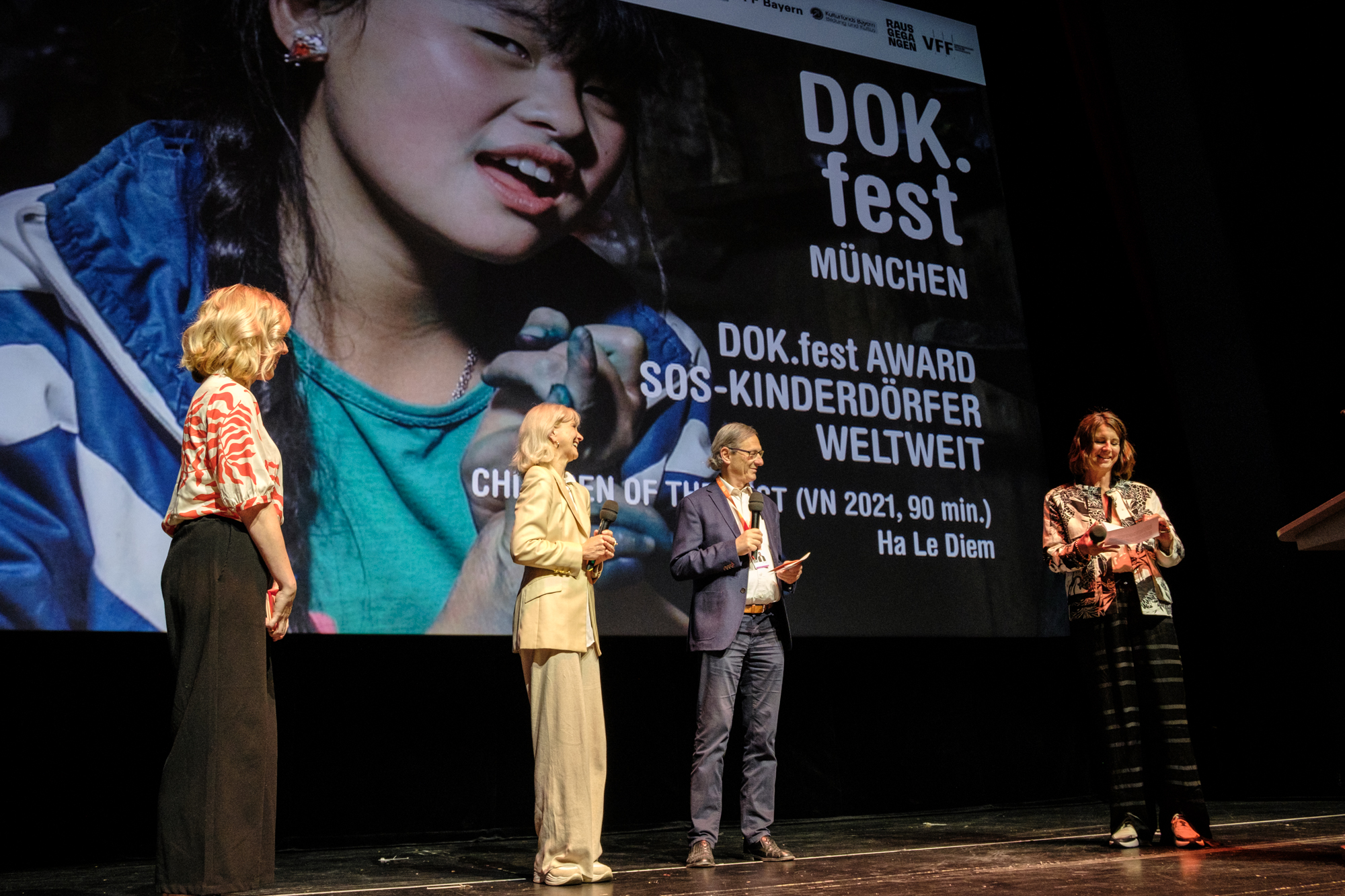 Hauptpreisverleihung 37. DOK.fest München, Christina Wolf (Moderatorin), Prof. Michaela Braun (SOS-Kinderdörfer weltweit), Peider A. Defilla (B.O.A. Videofilmkunst), Sophie von Uslar (Jury) (c) DOK.fest München