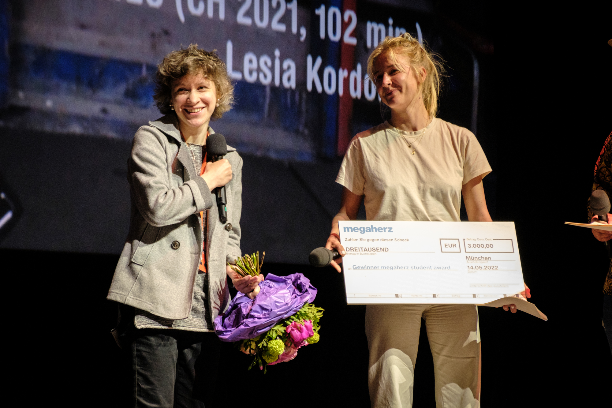 Hauptpreisverleihung 37. DOK.fest München, Lesia Kordonets (Preisträgerin megaherz Student Award), Marie Wald (Jury) (c) DOK.fest München