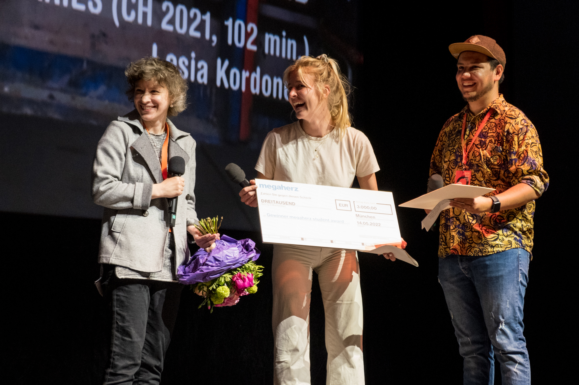 Hauptpreisverleihung 37. DOK.fest München, Lesia Kordonets (Preisträgerin megaherz Student Award), Marie Wald (Jury), Camilo Berstecher Barrero (Jury) (c) DOK.fest München