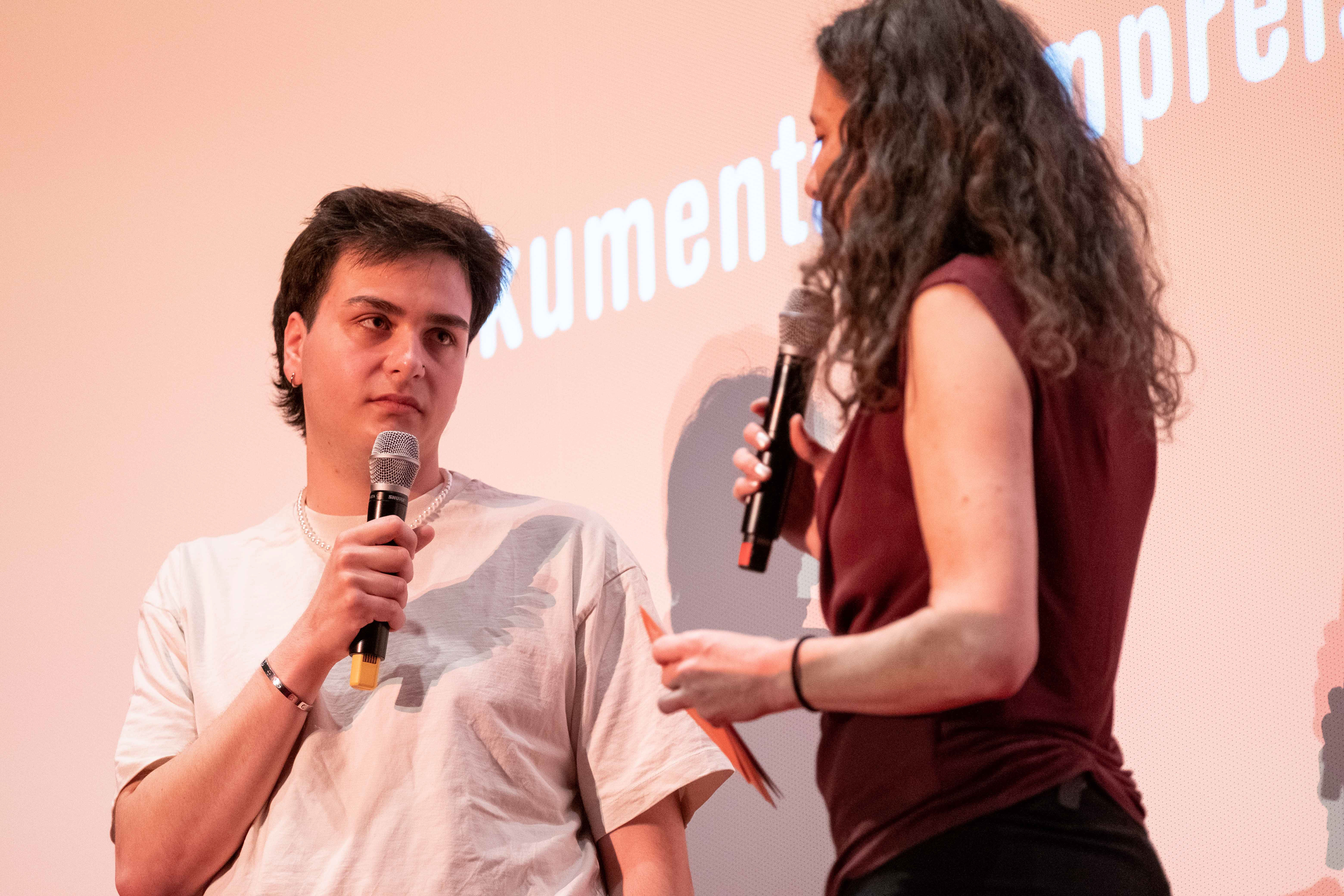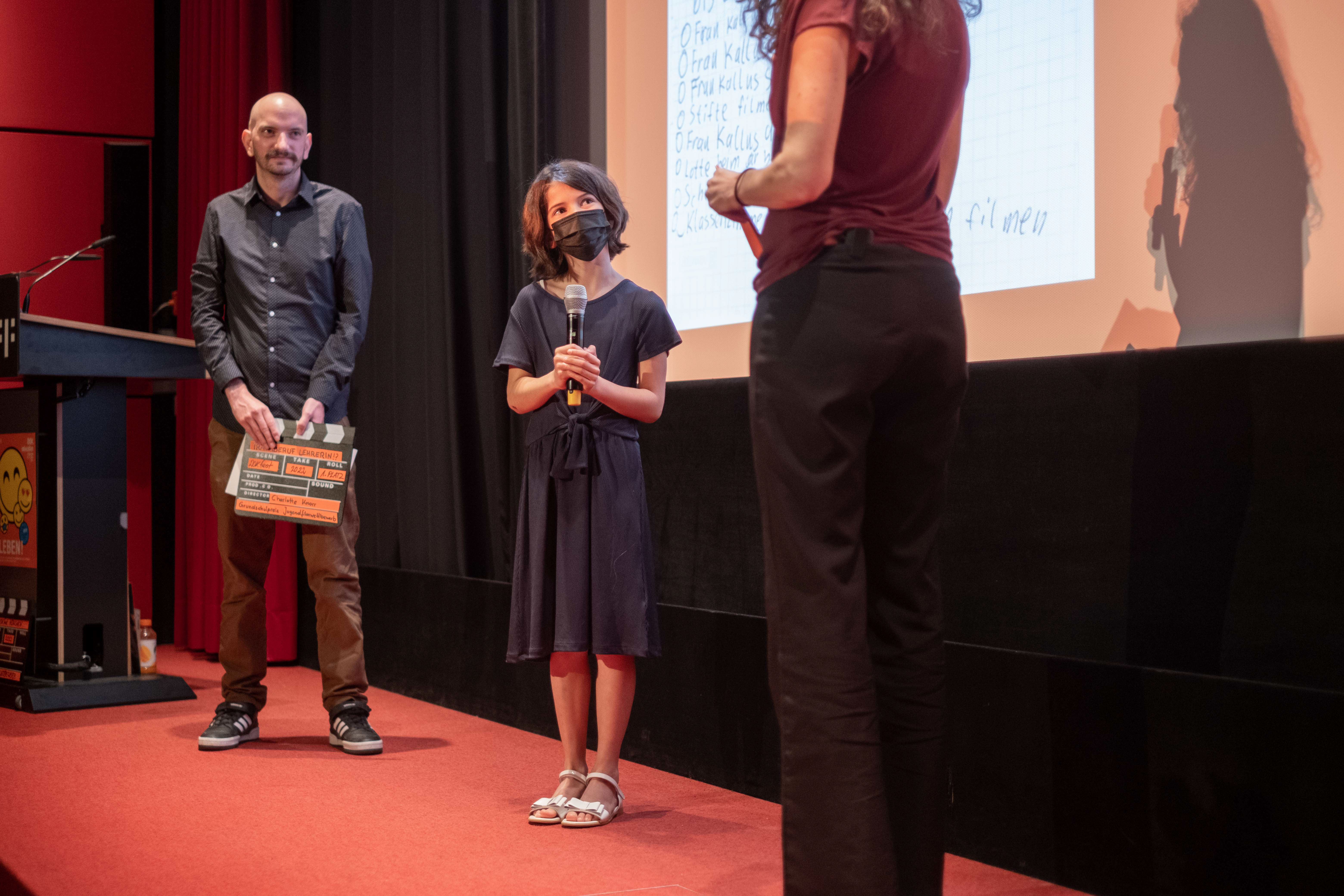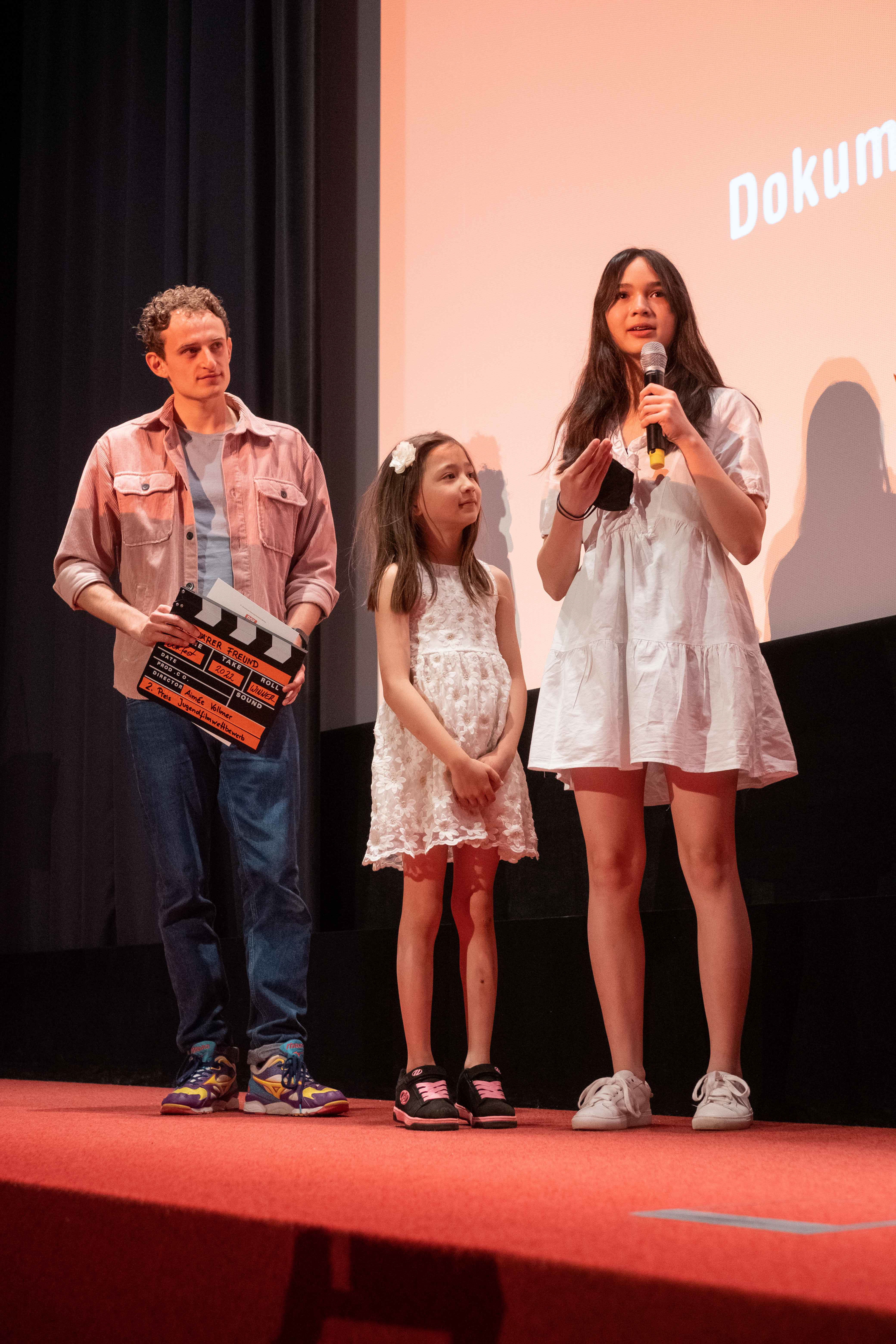 Preisverleihung Jugendfilmwettbewerb 2022, Louis Höllenreiner (Mitte), Maya Reichert (Moderatorin) (c) DOK.fest München/ Jan Roeder