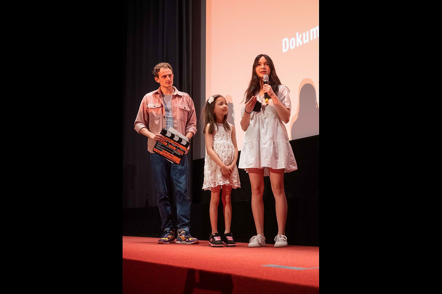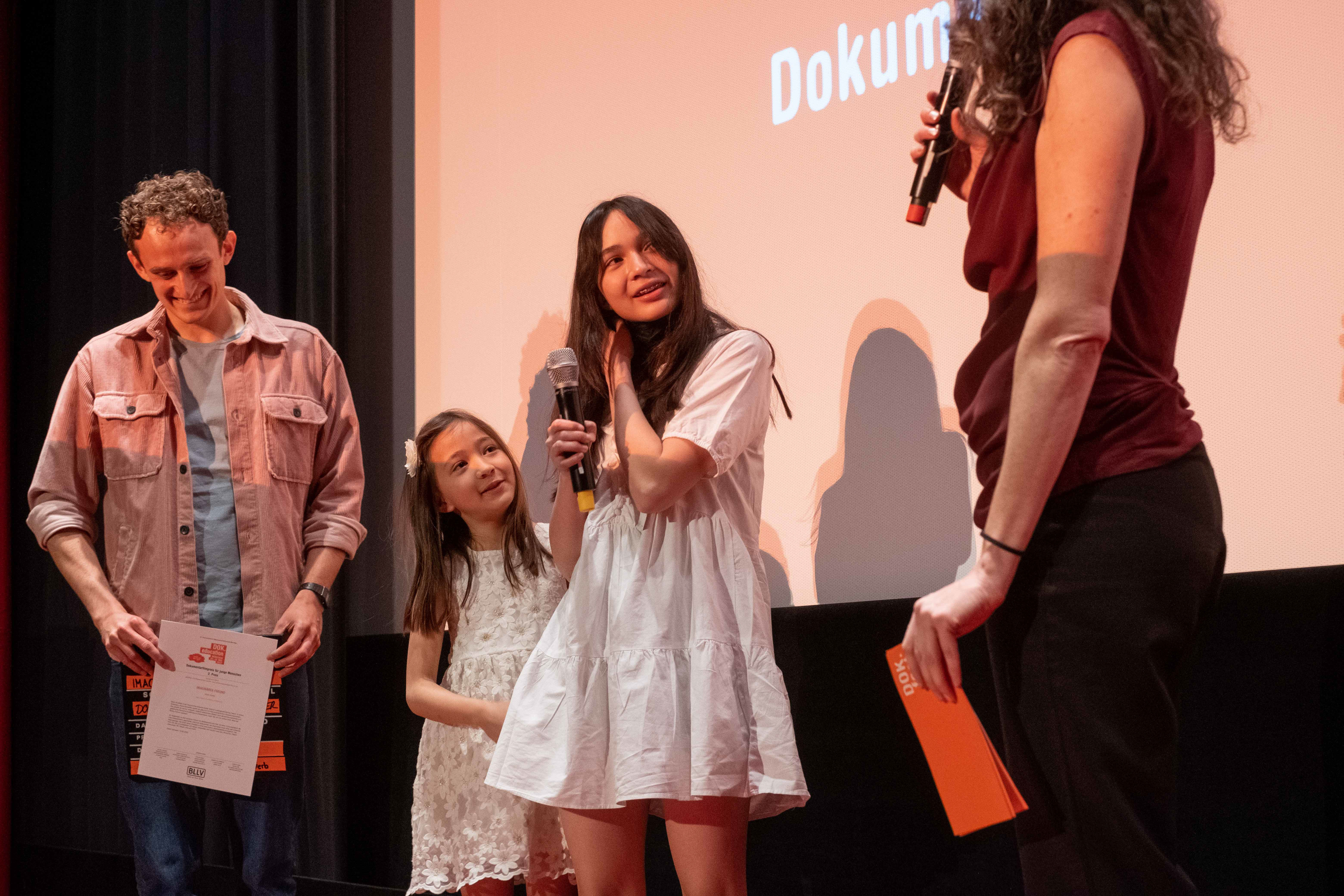 Preisverleihung Jugendfilmwettbewerb 2022, Julian Janssen alias Checker Julian (links), Anette und Aimée Vollmer (Preisträgerinnen) (c) DOK.fest München/ Jan Roeder