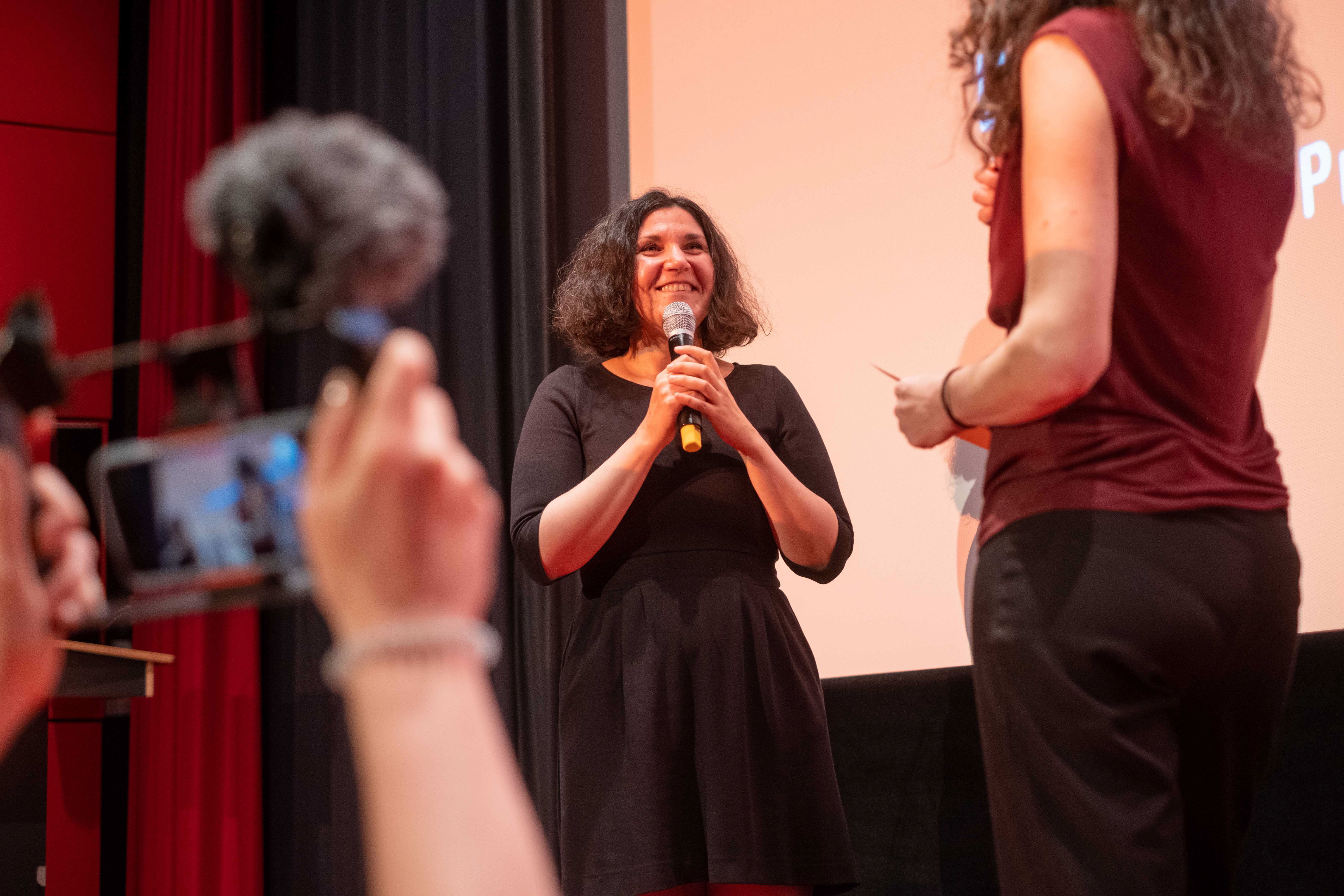 Preisverleihung Jugendfilmwettbewerb 2022, Shirin Kasraeian (links), Maya Reichert (Moderatorin, rechts) (c) DOK.fest München/ Jan Roeder