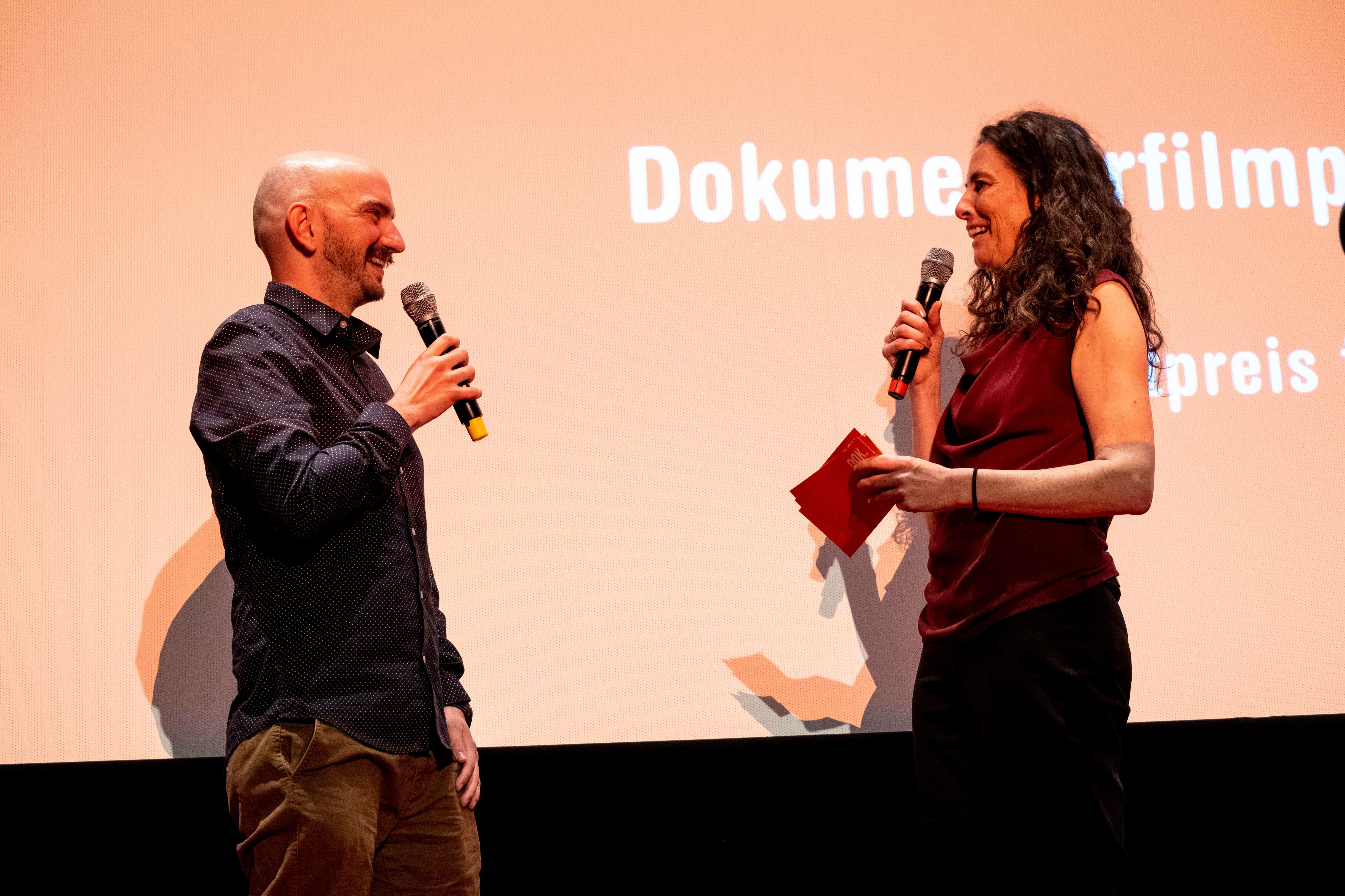 Preisverleihung Jugendfilmwettbewerb 2022, Philipp Aubel (Bundesverband Jugend und Film), Maya Reichert (Moderatorin) (c) DOK.fest München/ Jan Roeder