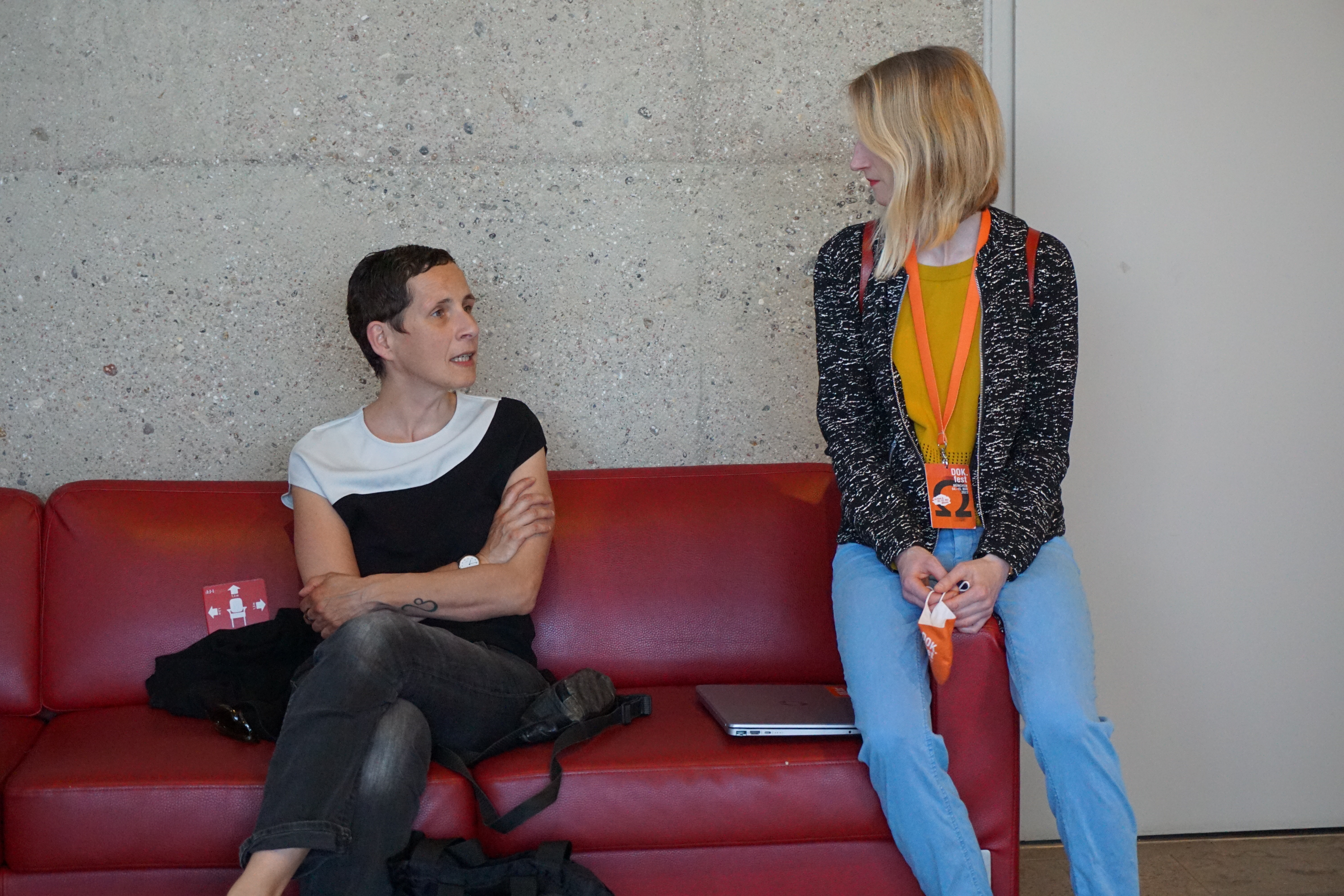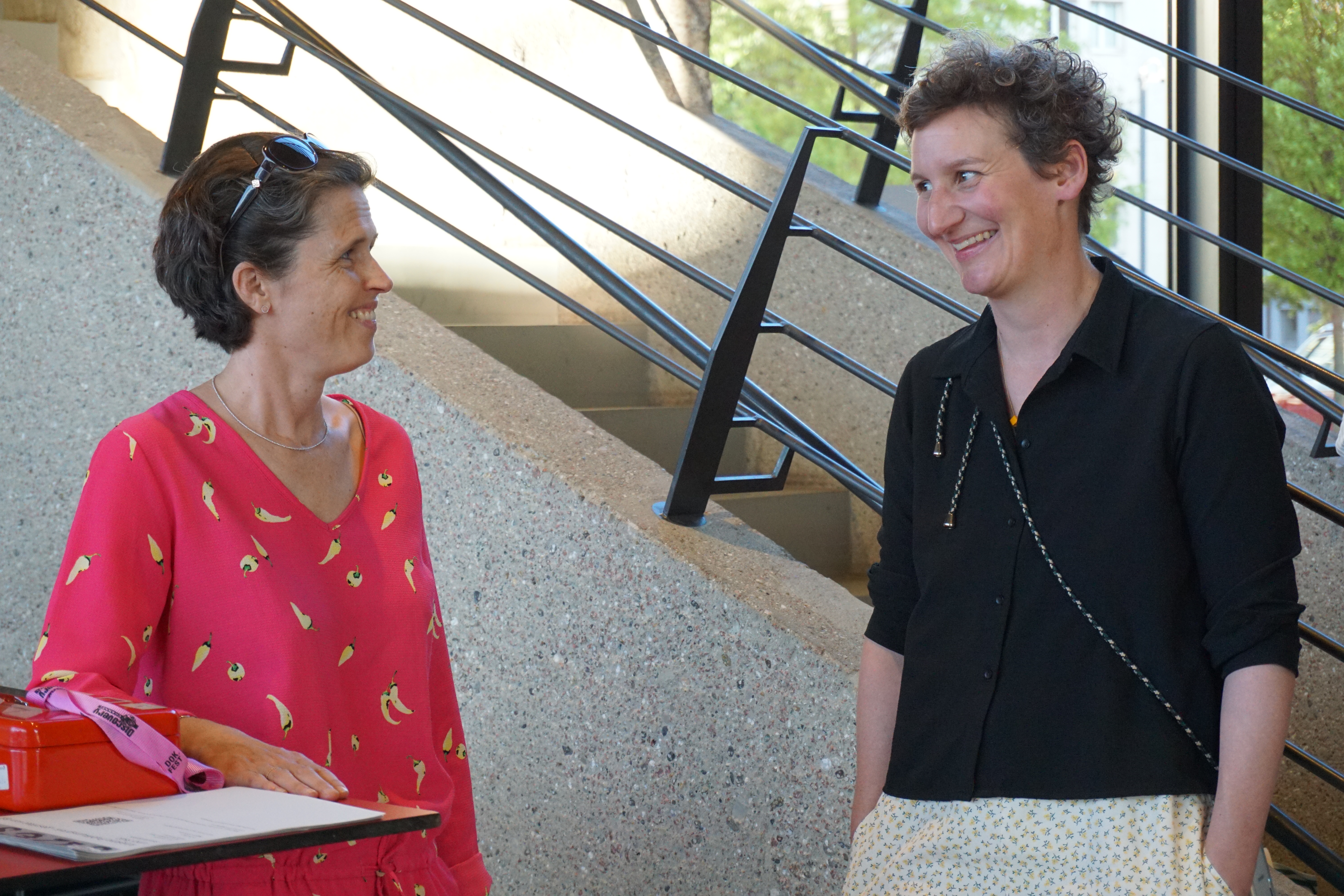 Verleihung kinokino Publikumspreis – gestiftet von BR und 3sat 2022 im HFF Audimax, Christina Wolf (Moderatorin), Adele Kohout (Stellv. Festivalleitung) (c) DOK.fest München