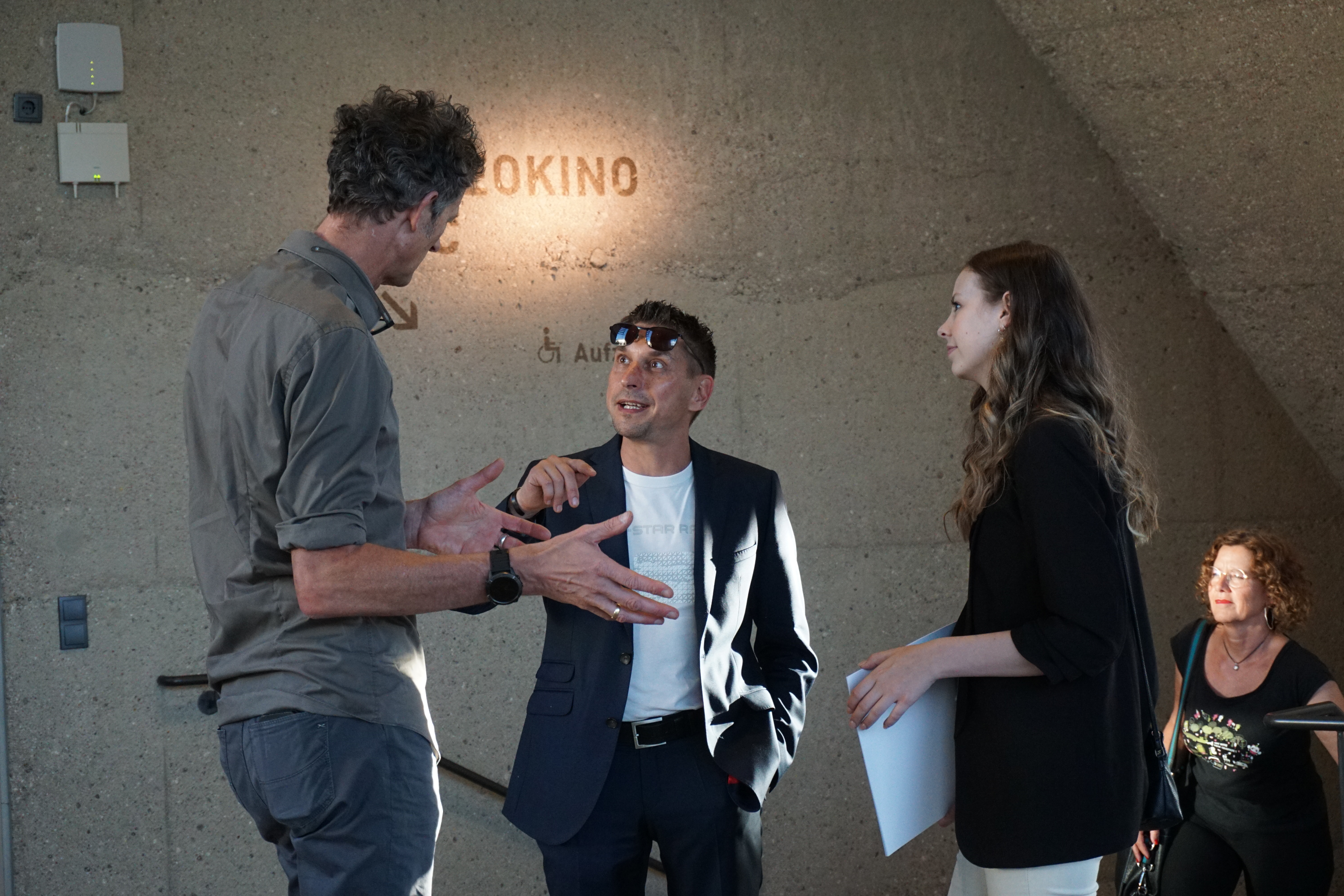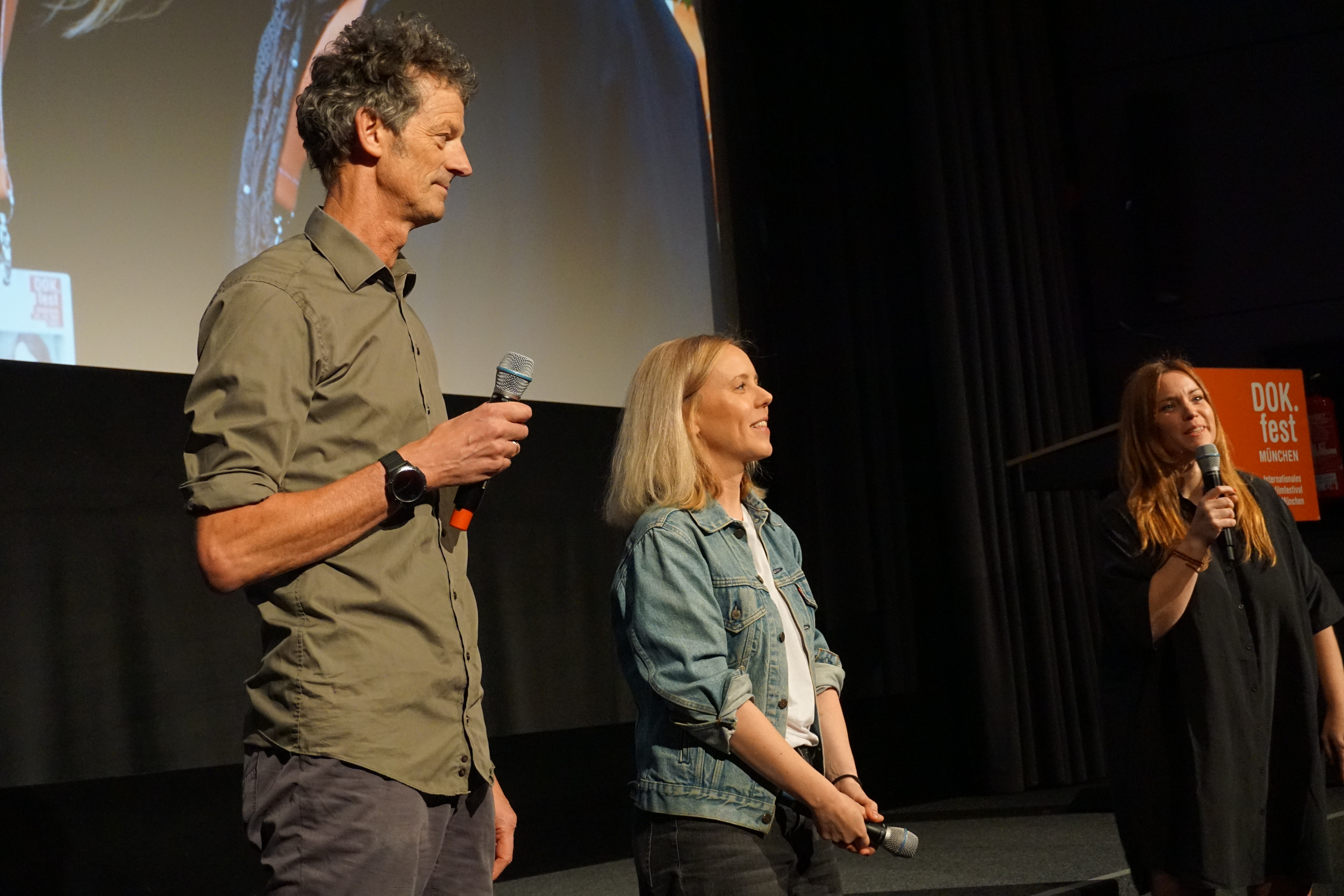 Verleihung kinokino Publikumspreis – gestiftet von BR und 3sat 2022 im HFF Audimax, Daniel Sponsel (Festivalleiter), Christina Wolf (Moderatorin), Adele Kohout (Stellv. Festivalleitung) (c) DOK.fest München