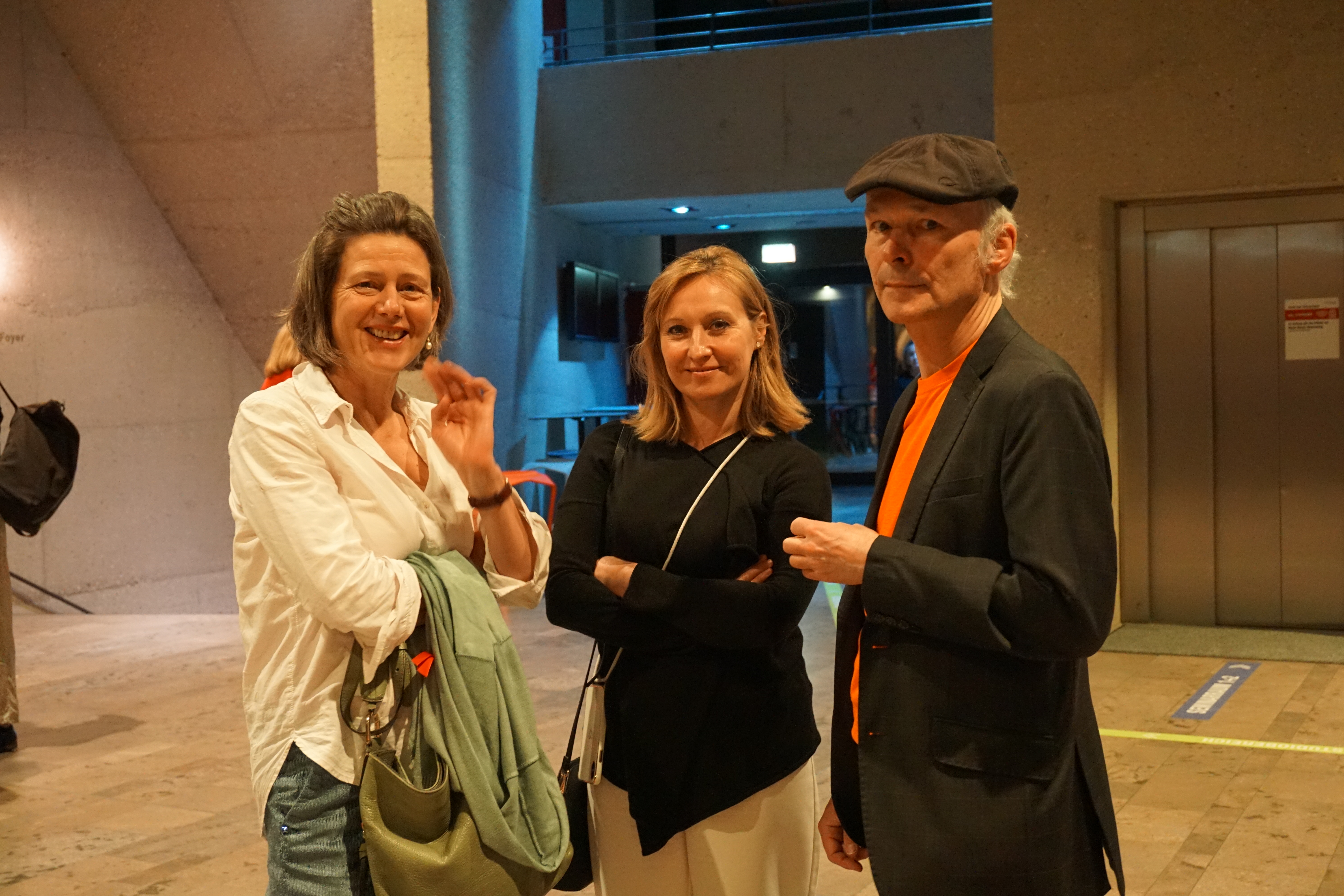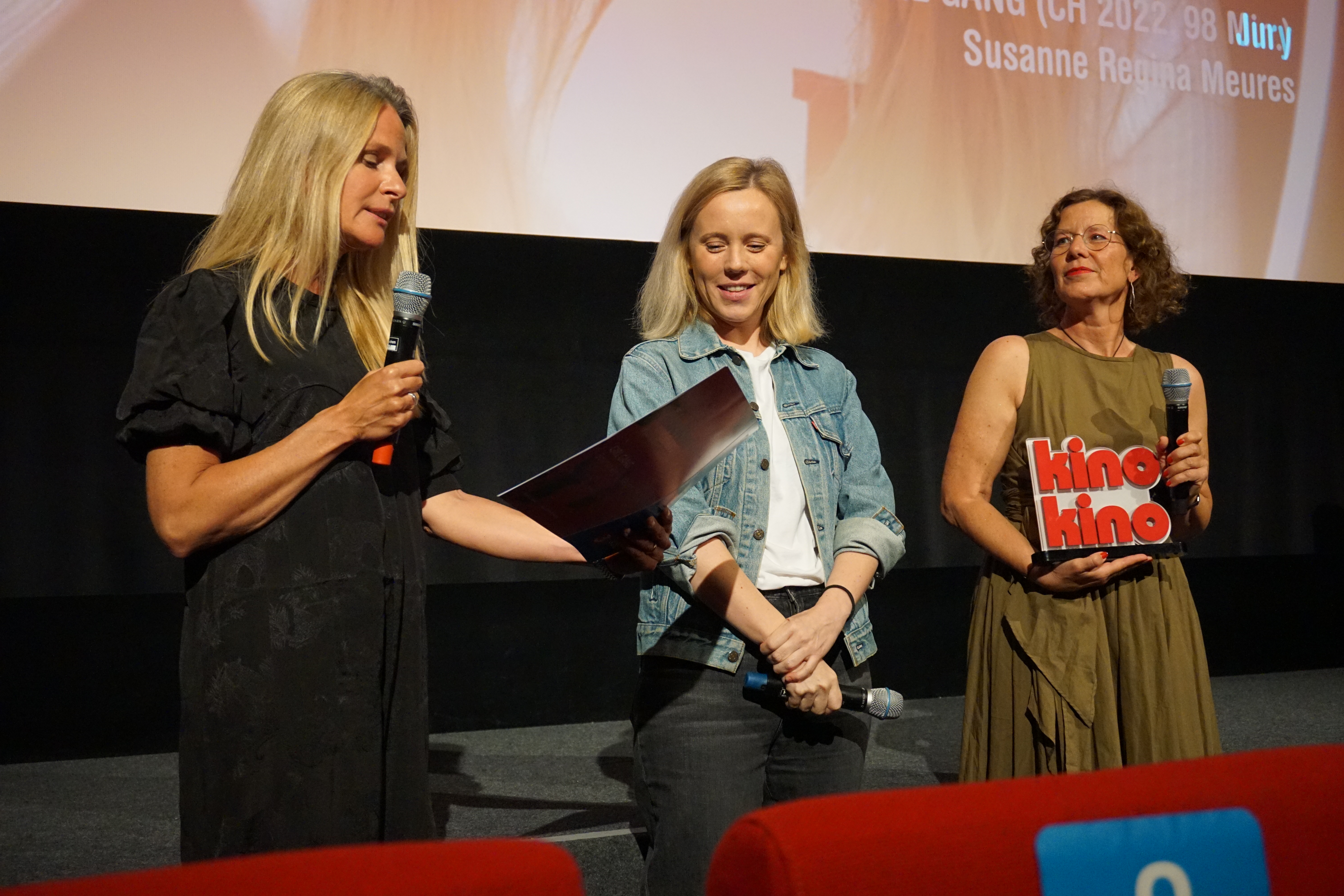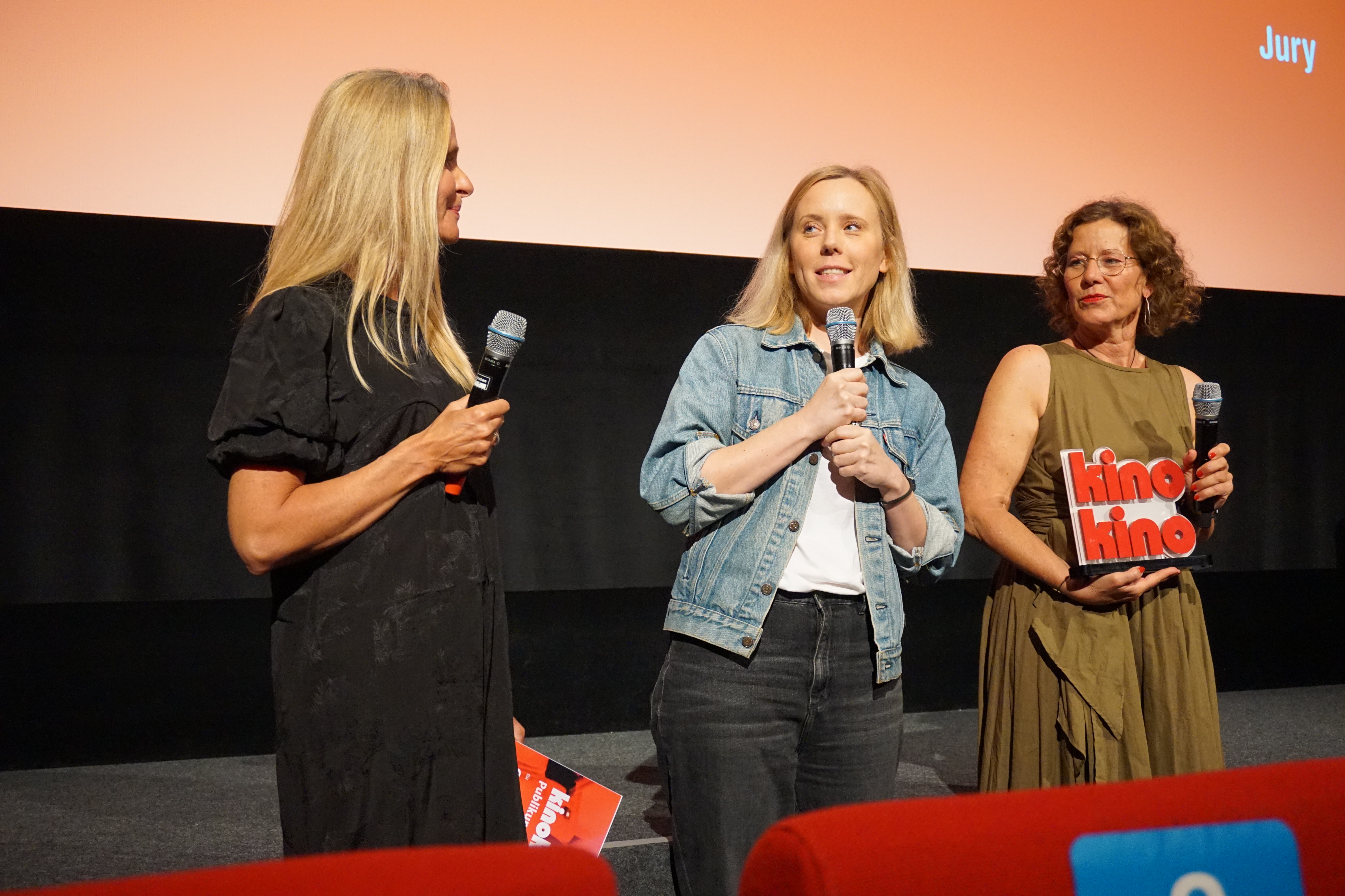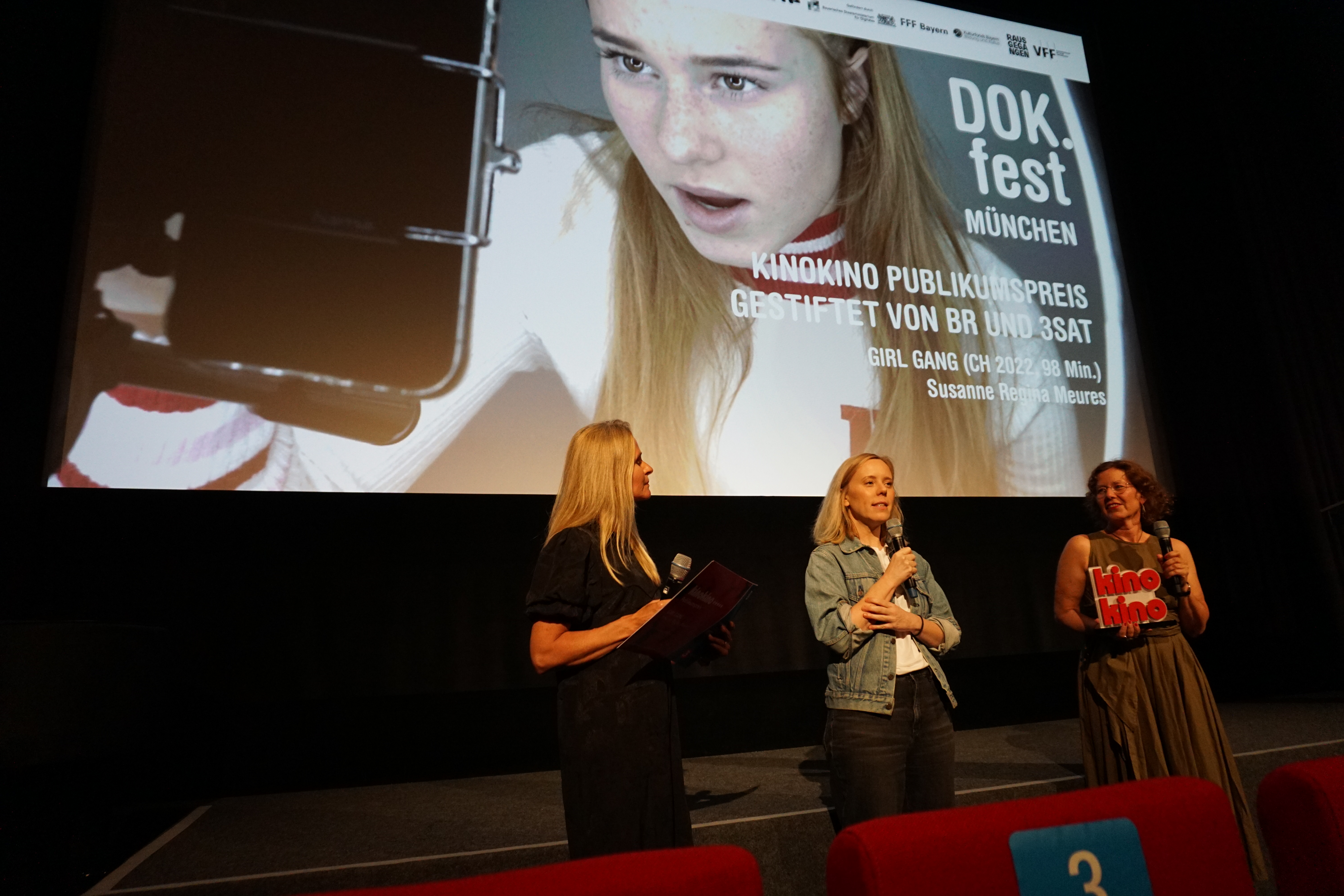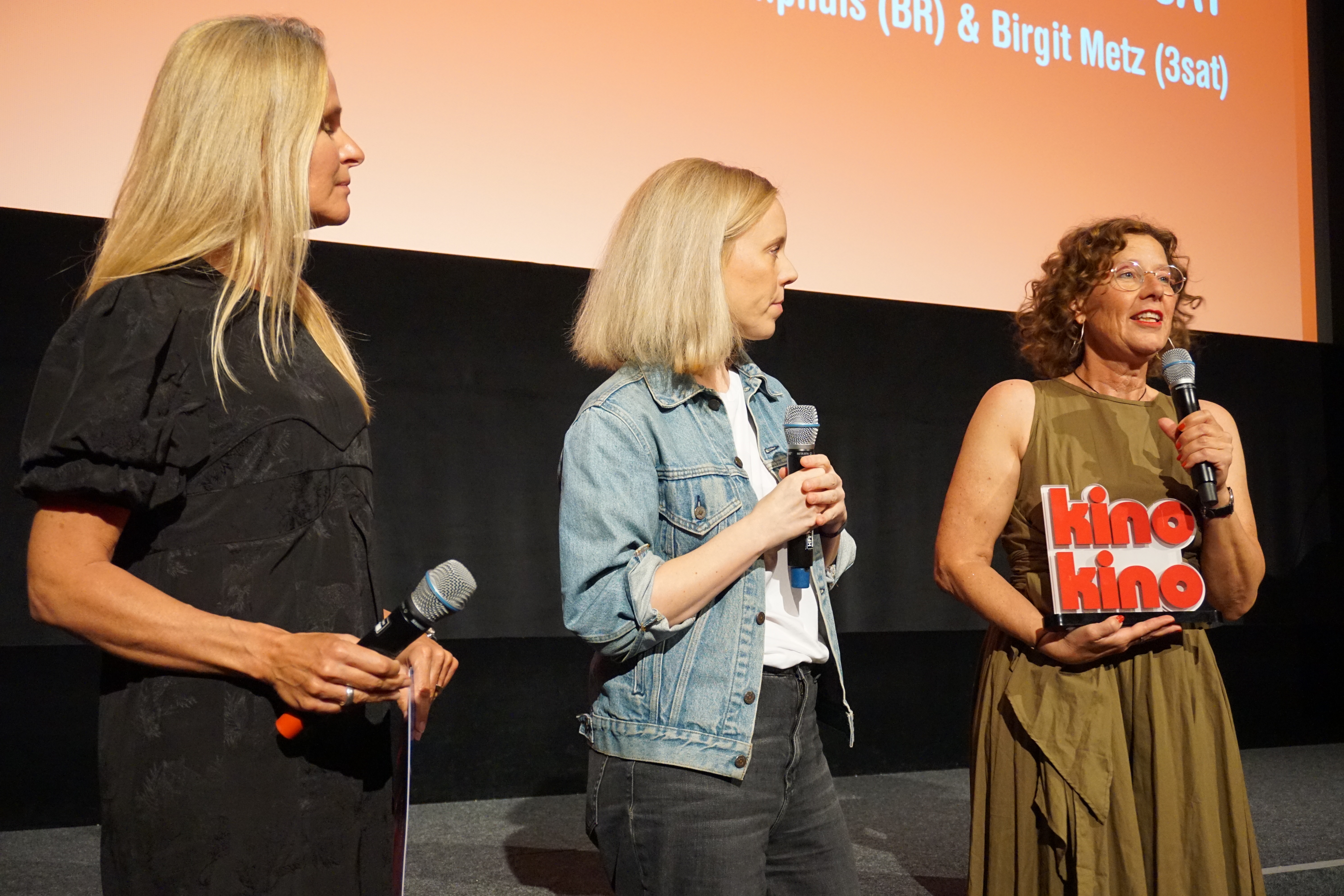 Verleihung kinokino Publikumspreis – gestiftet von BR und 3sat 2022 im HFF Audimax, Birgit Metz (3sat), Christina Wolf (Moderatorin), Saskya Kamphuis (BR) (c) DOK.fest München