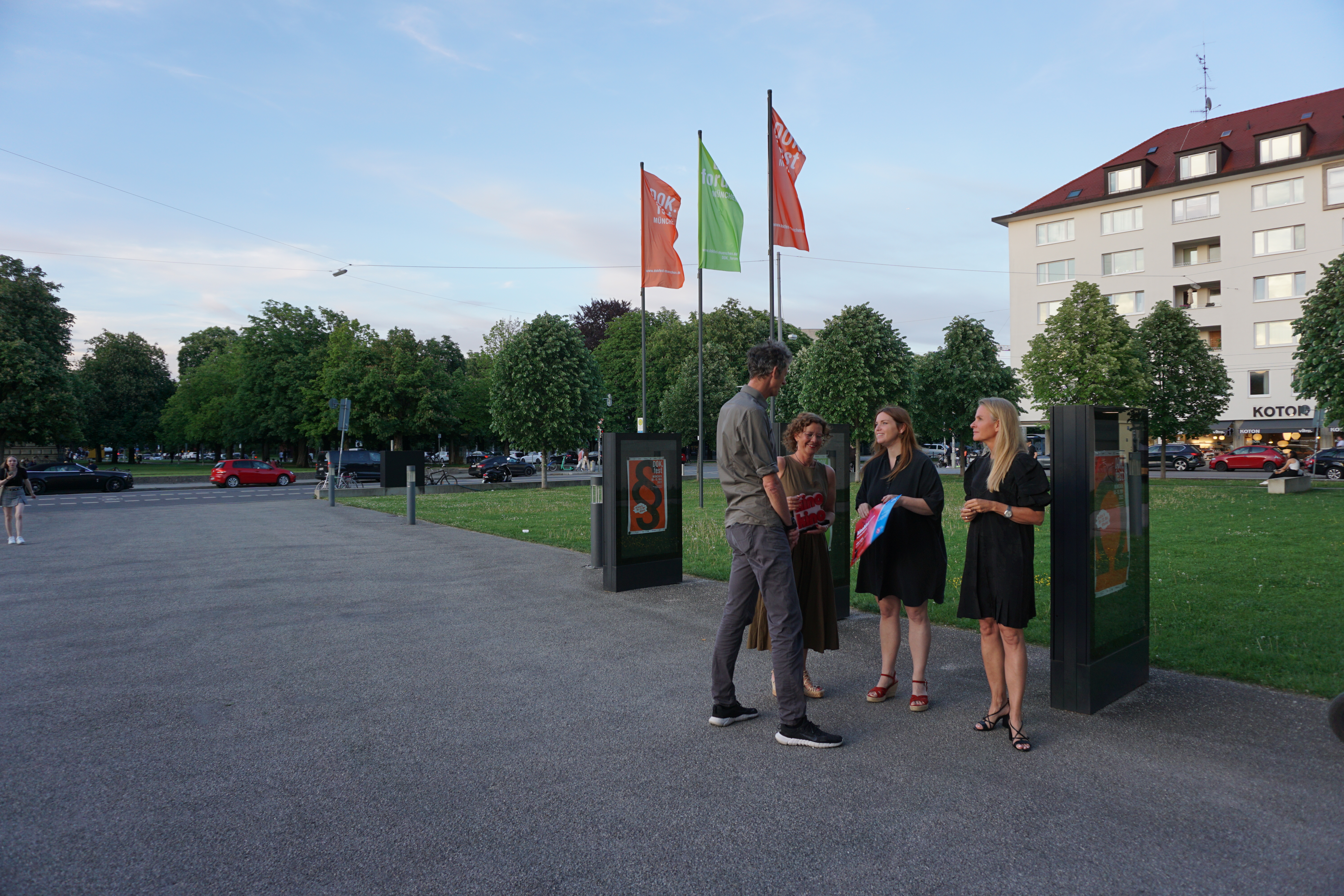 Verleihung kinokino Publikumspreis – gestiftet von BR und 3sat 2022 im HFF Audimax, Daniel Sponsel (Festivalleitung), Saskya Kamphuis (BR), Adele Kohout (Stellv. Festivalleitung), Birgit Metz (3sat) (c) DOK.fest München