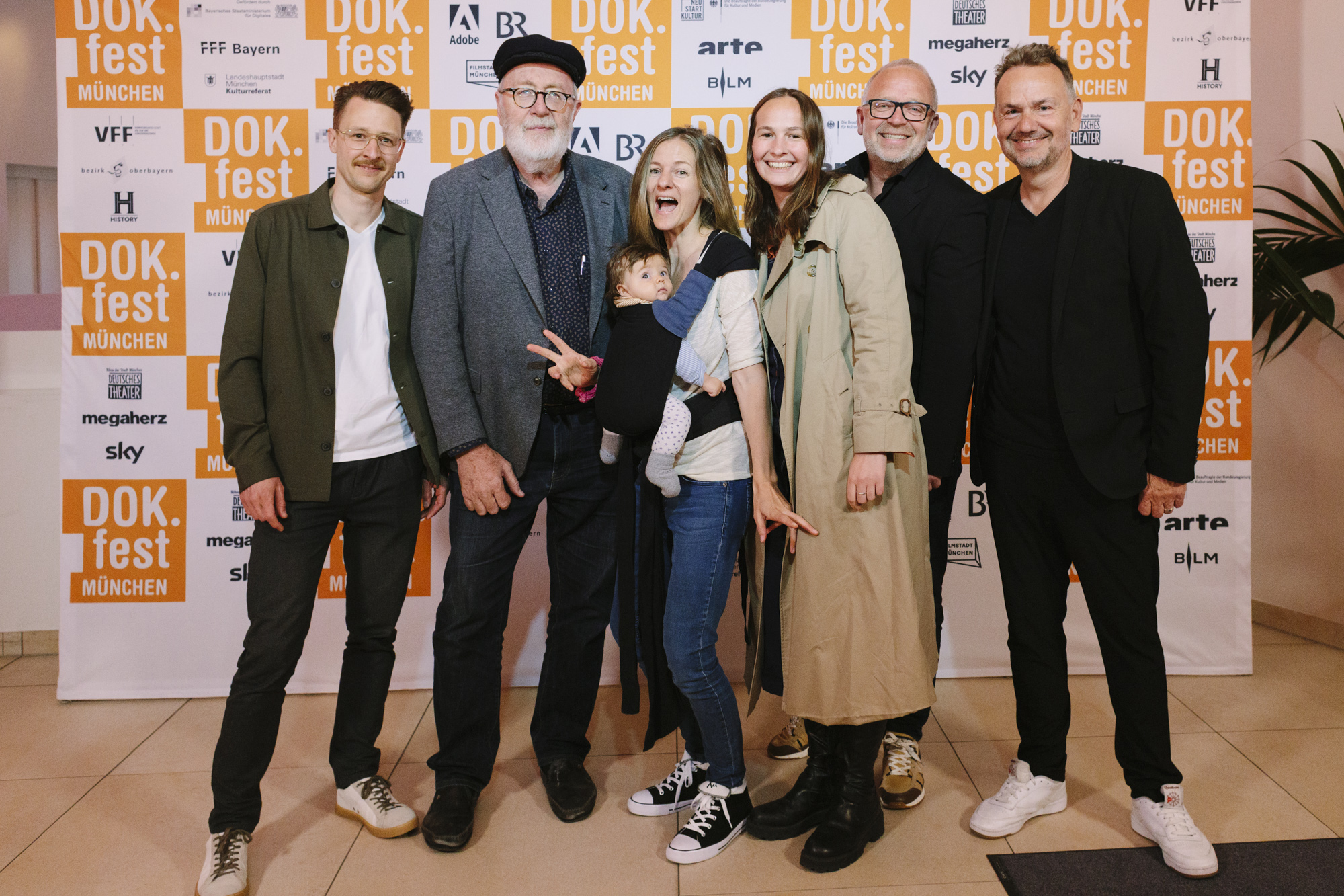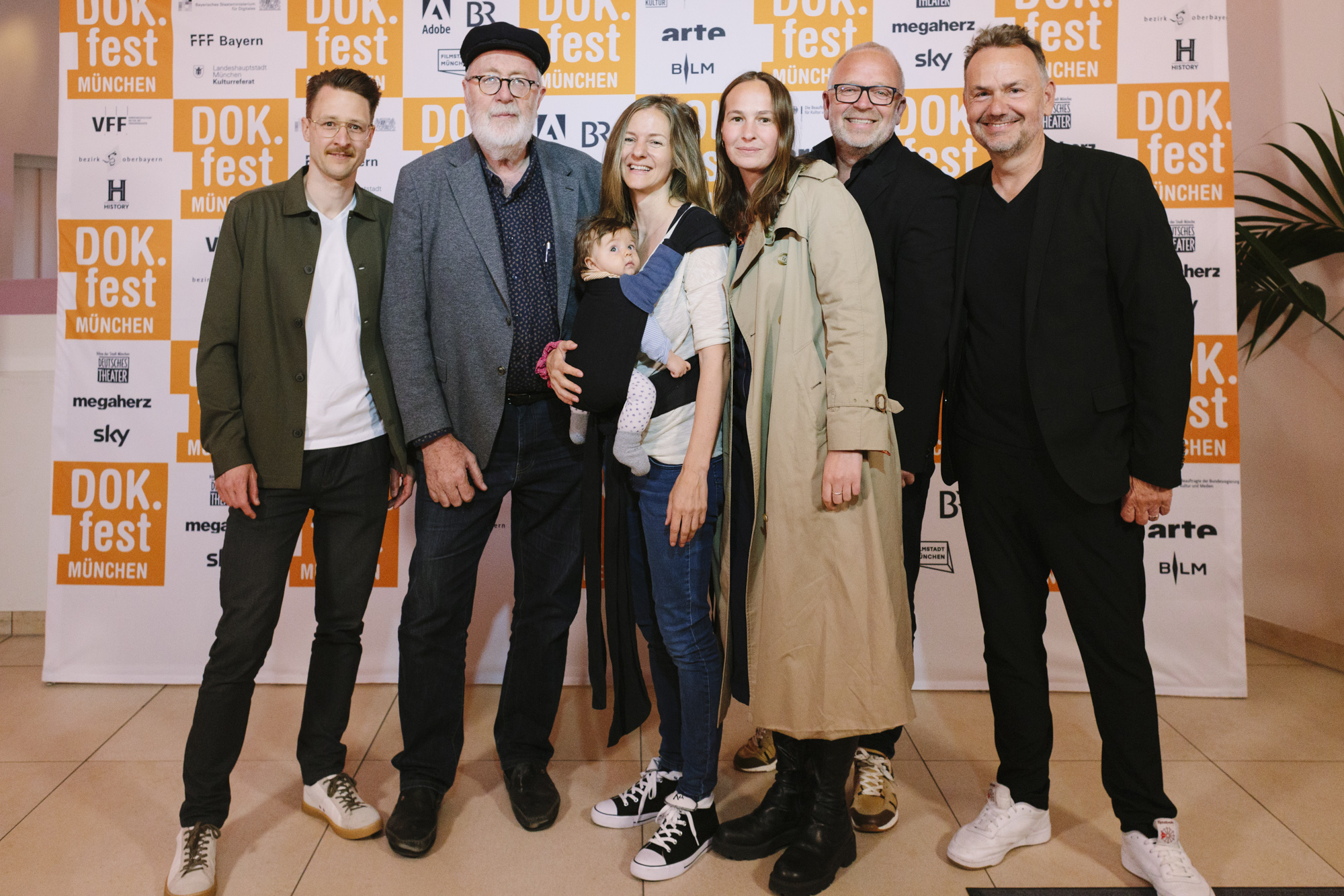 JUAN CARLOS – LIEBE, GELD, VERRAT im Deutschen Theater: Felix Kempter (ganz links, Sky), Pedro Barbadillo (2.v.r. Autor JUAN CARLOS), Anne von Petersdorff (3.v.l. Regisseurin JUAN CARLOS), Lea-Marie Körner (Produktion JUAN CARLOS), Christian Beetz (6. v.r., gebrüder beetz filmproduktion), Christian Asanger (5. v.l. Vice President Sky Deutschland) (c) DOK.fest München 2023