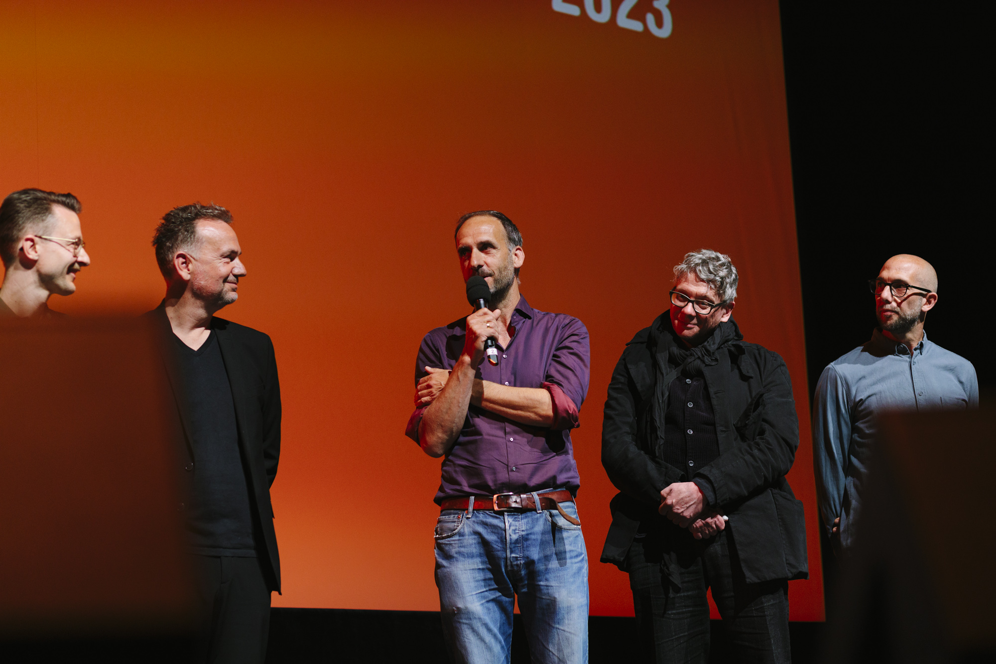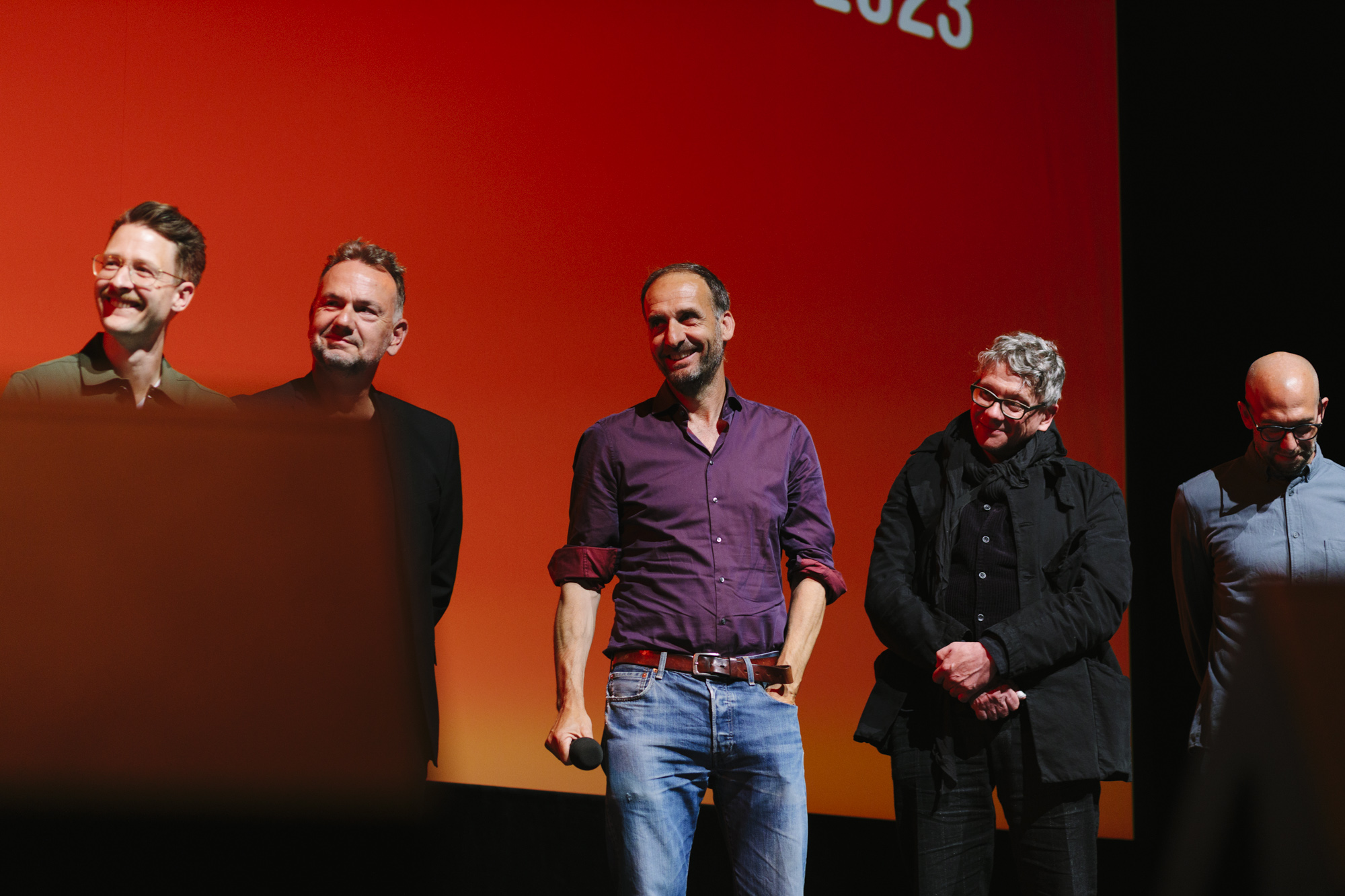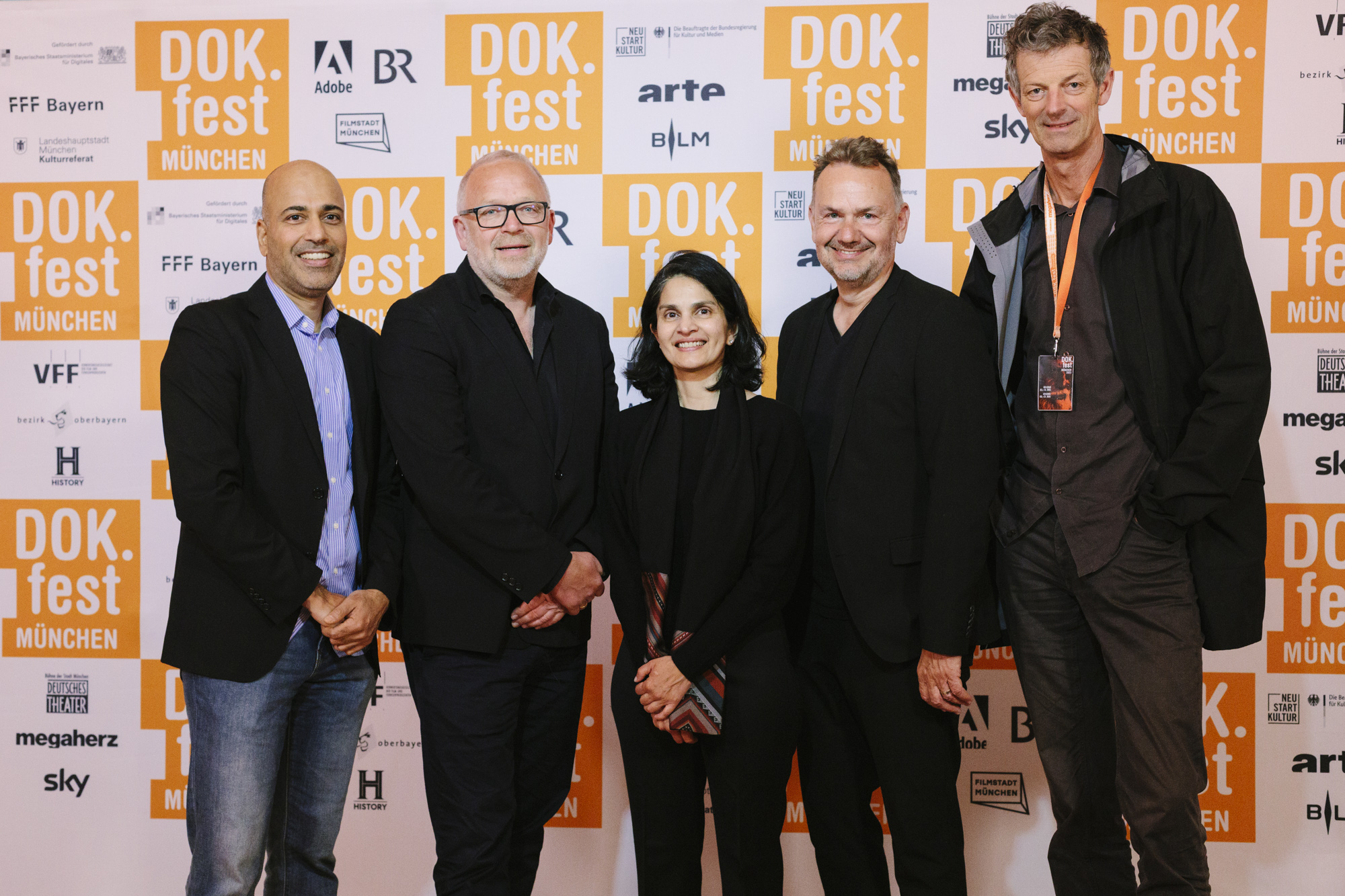 JUAN CARLOS – LIEBE, GELD, VERRAT im Deutschen Theater: Devesch Raj (ganz links CEO of Sky), Christian Beetz (2. v.l. christian beetz filmproduktion), Christian Asanger (2. v.r., Vice President Sky Deutschland), Daniel Sponel (ganz rechts, Festivalleiter) (c) DOK.fest München 2023(c) DOK.fest München 2023