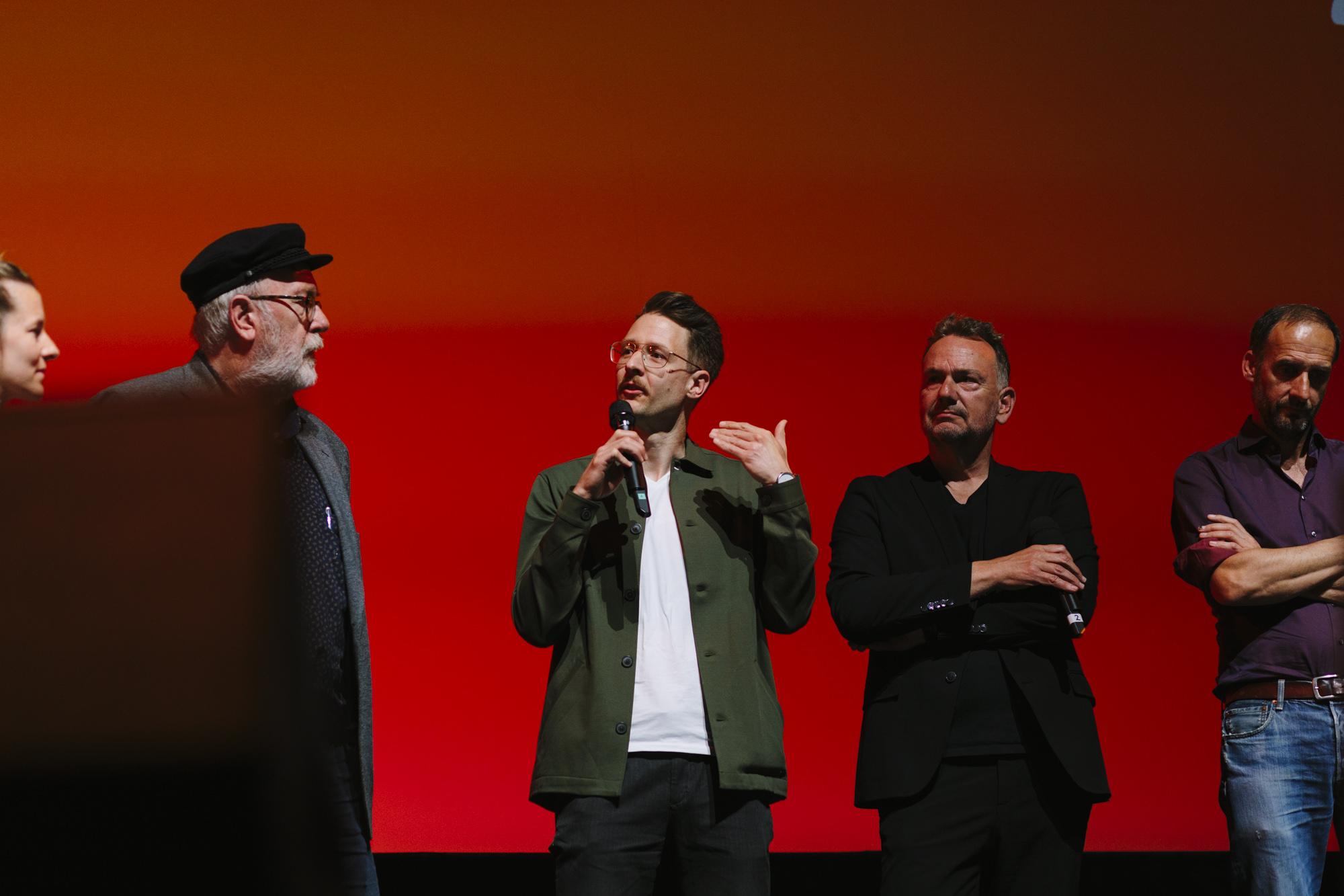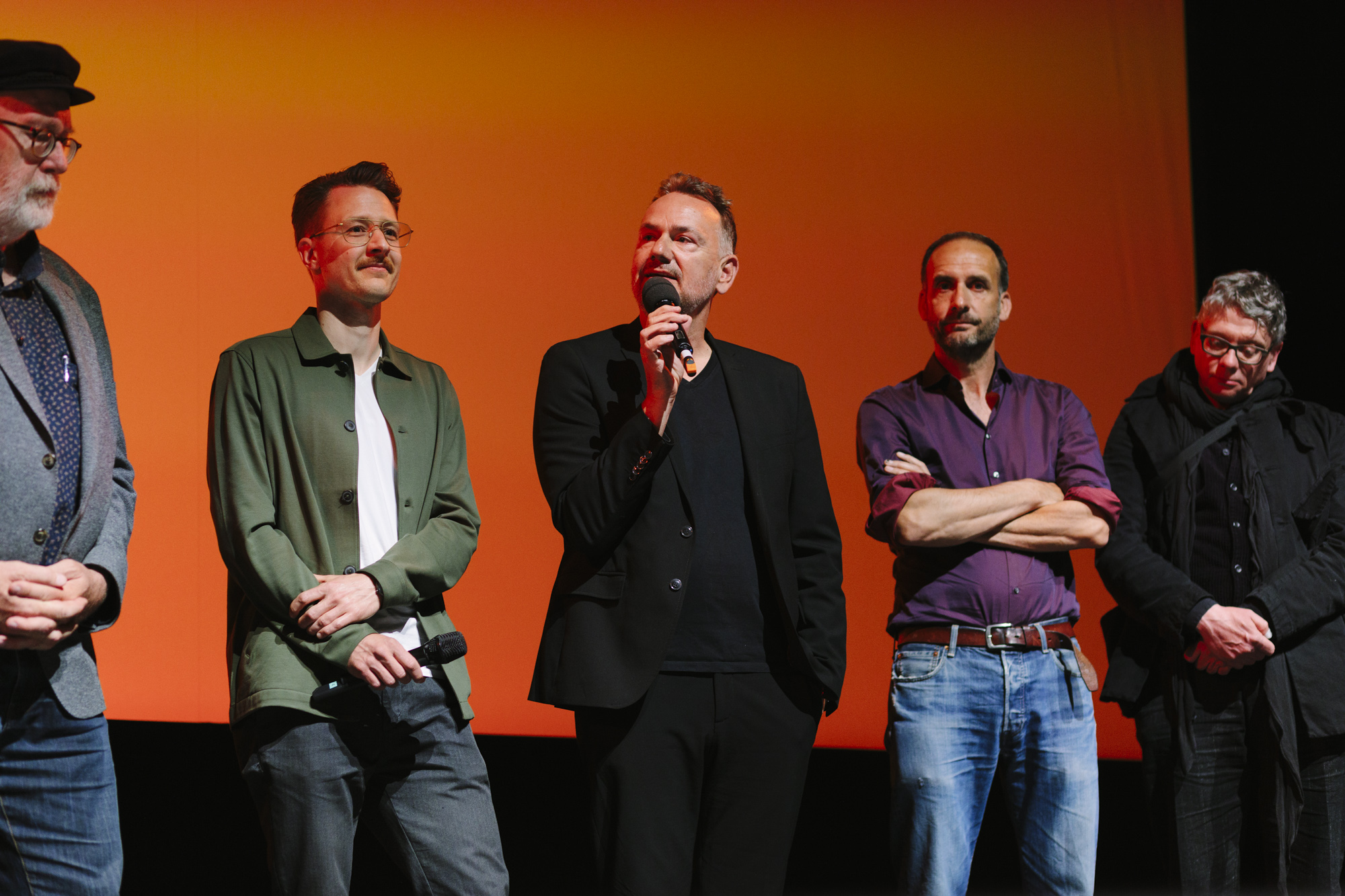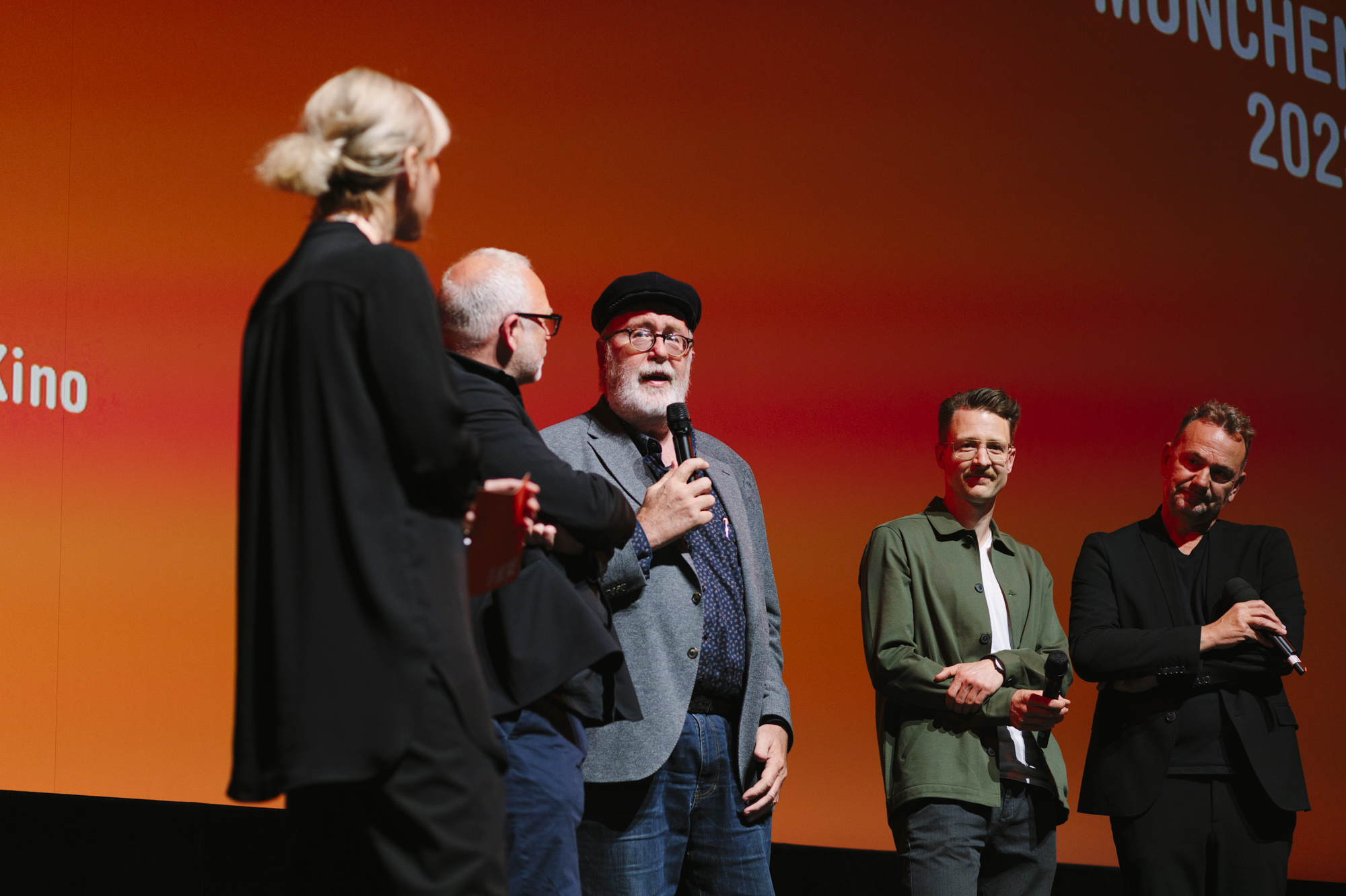 JUAN CARLOS – LIEBE, GELD, VERRAT im Deutschen Theater: Devesch Raj (ganz links CEO of Sky), Christian Beetz (2. v.l. christian beetz filmproduktion), Christian Asanger (2. v.r., Vice President Sky Deutschland), Daniel Sponel (ganz rechts, Festivalleiter) (c) DOK.fest München 2023(c) DOK.fest München 2023