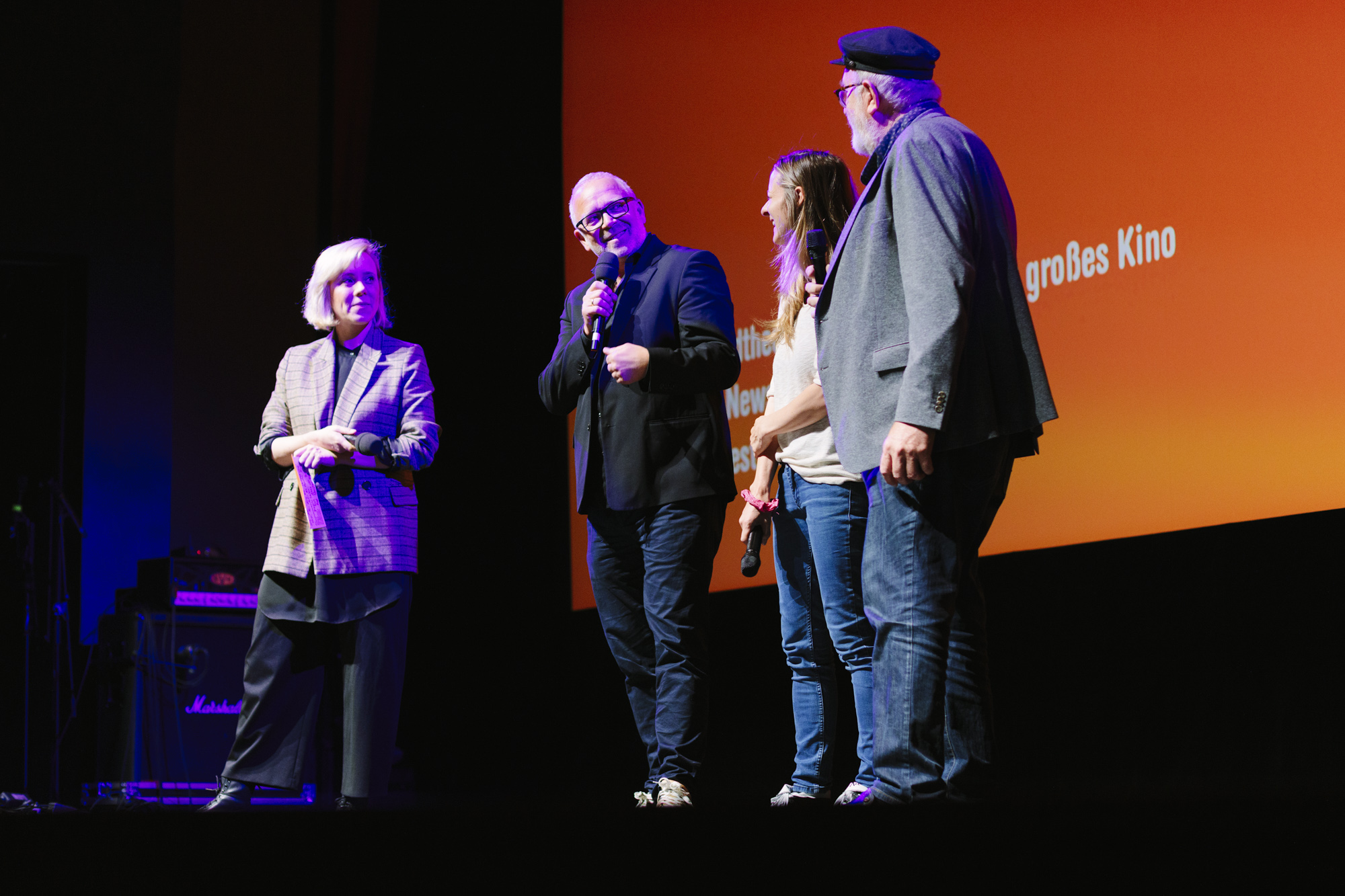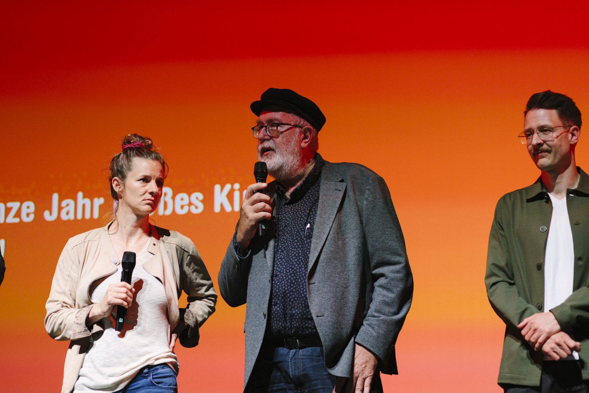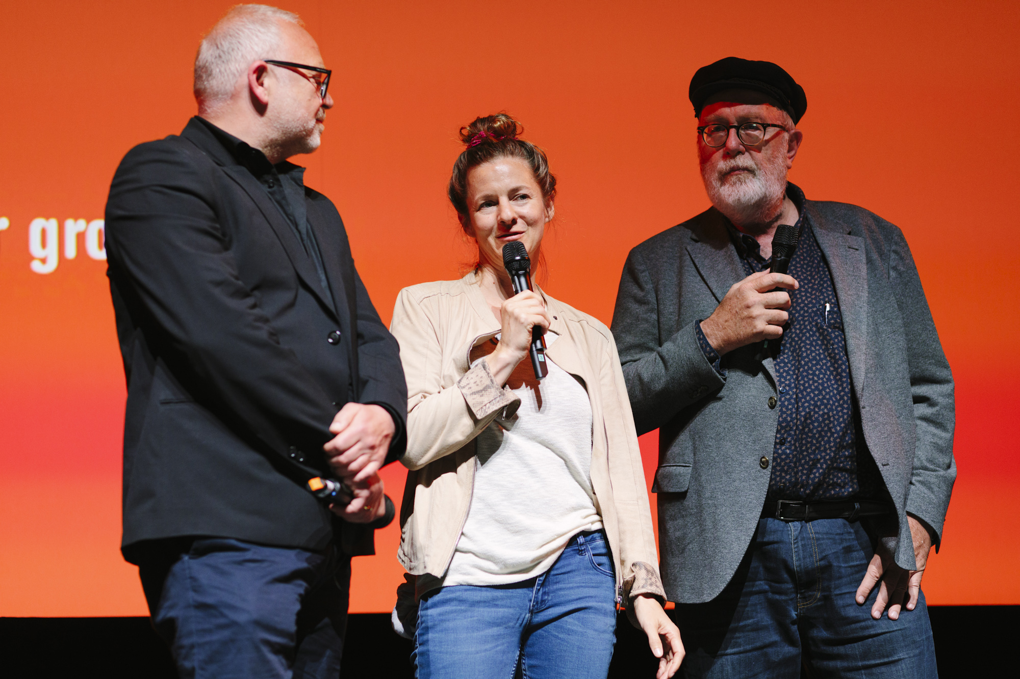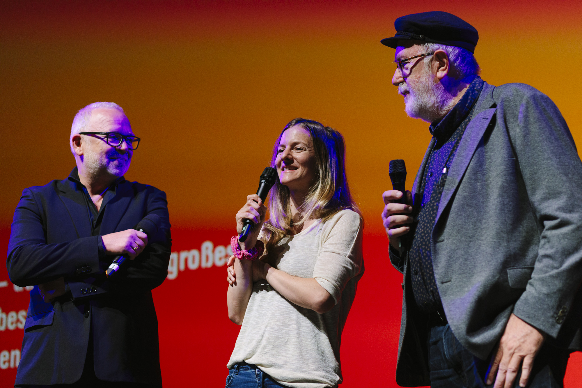 JUAN CARLOS – LIEBE, GELD, VERRAT im Deutschen Theater: Pedro Barbadillo (Autor JUAN CARLOS), Anne von Petersdorff (Regisseurin JUAN CARLOS), Christian Beetz (gebrüder beetz filmproduktion) (c) DOK.fest München 2023(c) DOK.fest München 2023
