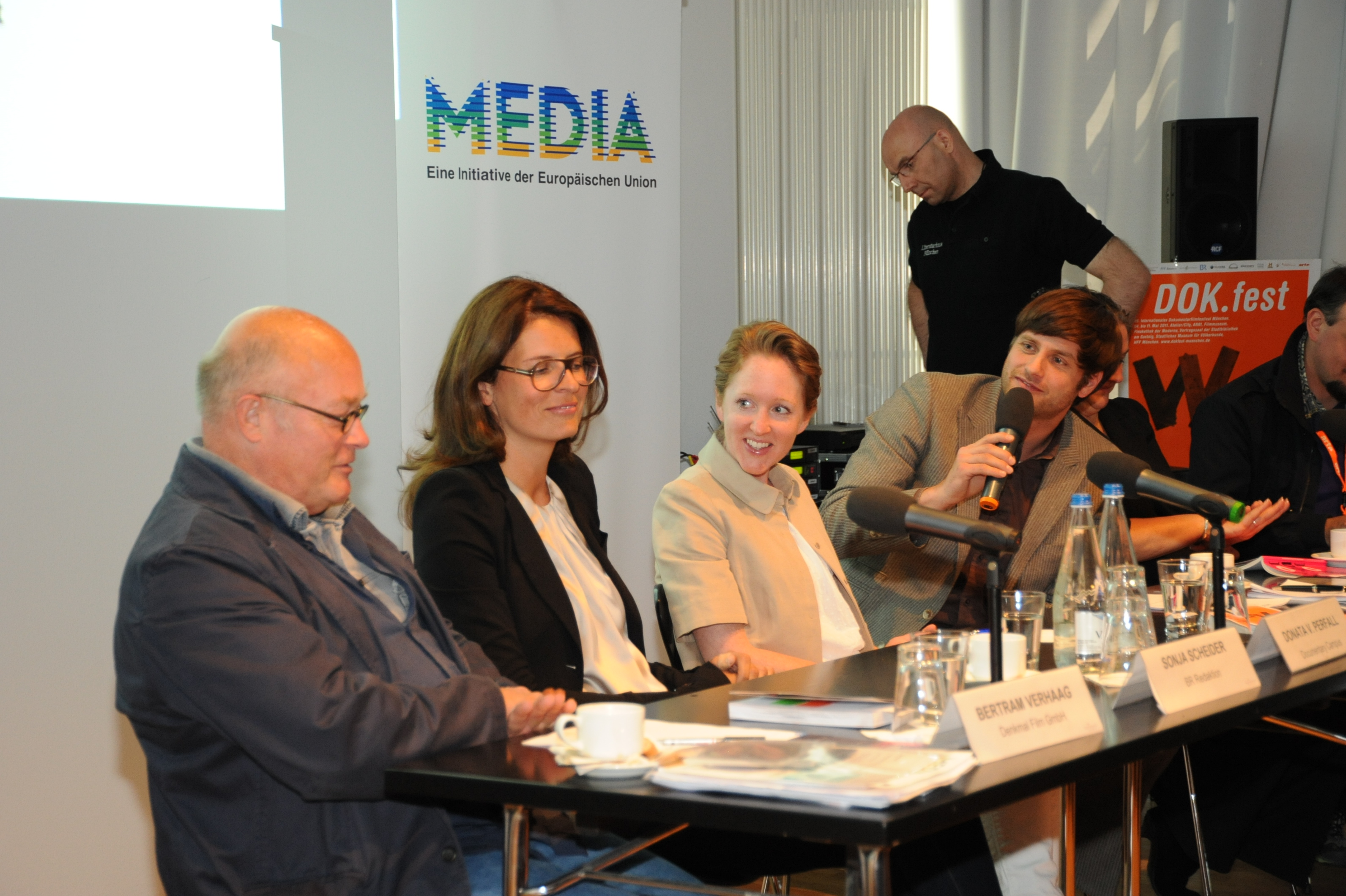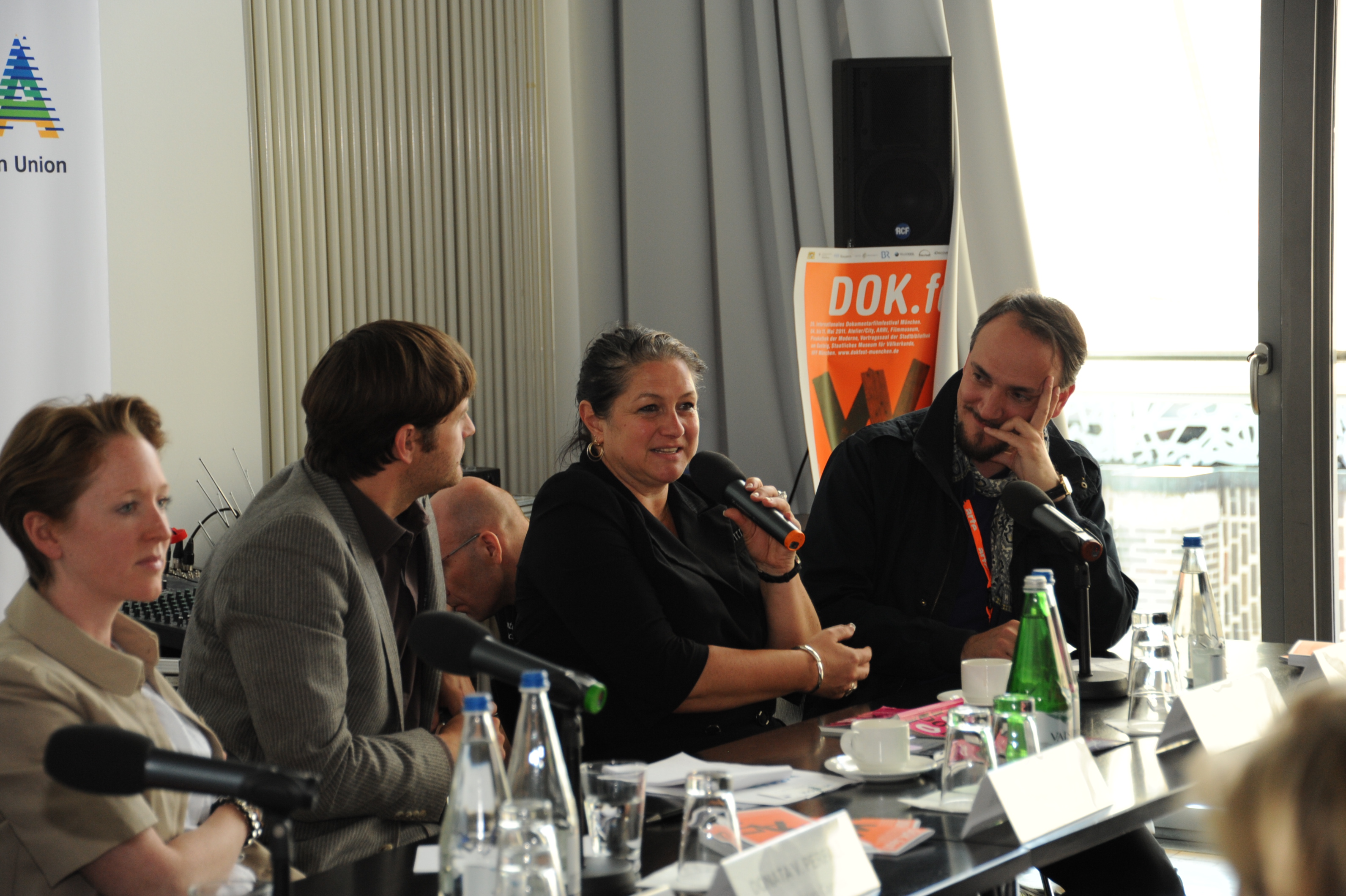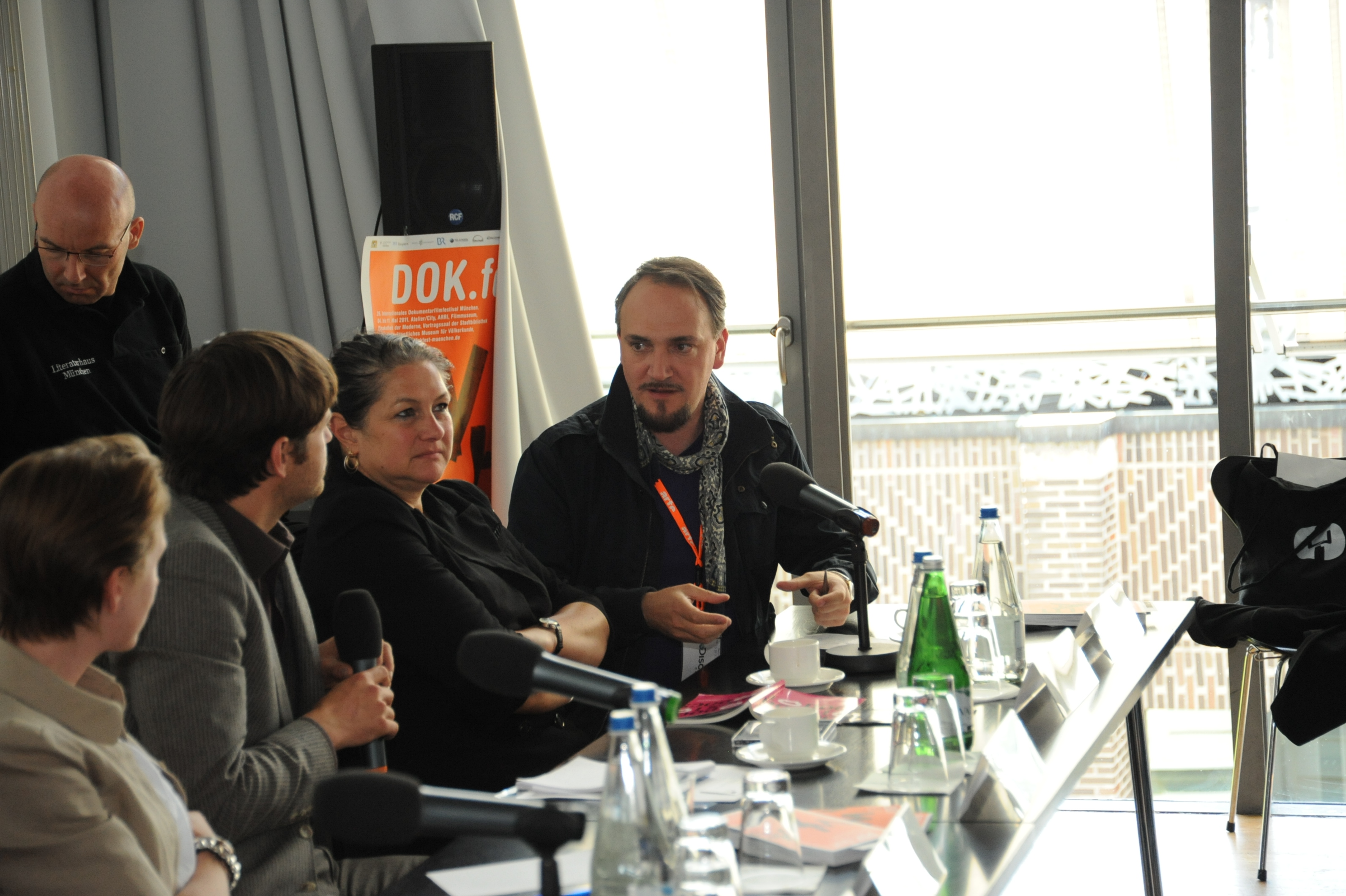 v.l.n.r.: Bertram Verhaag (Denkmal Film), Sonja Scheider (BR), Donata v. Perfall (Documentary Campus) und Michael Watzke (Deutschlandradio) / Copyright DOK.fest - Lucius Grossheim