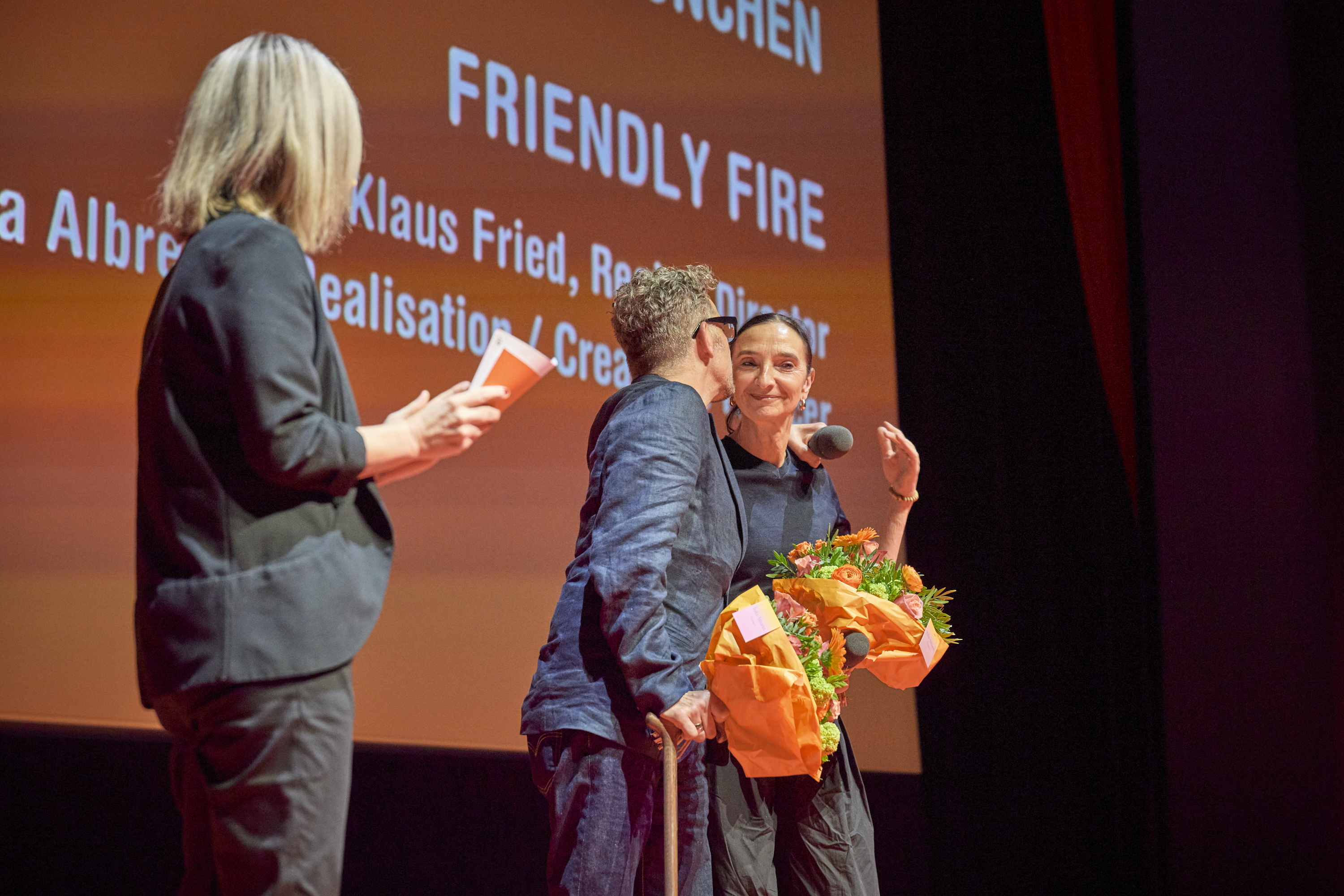 • Moderatorin Christina Wolf, Filmemacherin Julia Albrecht und Regisseur Klaus Fried von FRIENDLY FIRE / Eröffnung 40. DOK.fest München (c) DOK.fest München