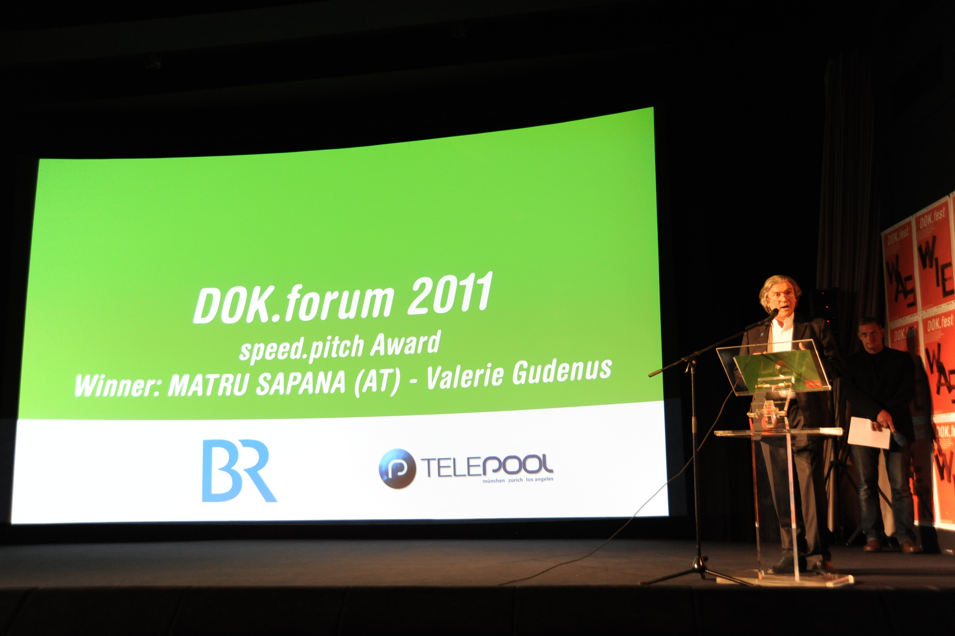 Preisvergabe speed.pitch Award durch Dr. Thomas Weymar (Telepool) / Copyright DOK.fest - Maren Bornemann