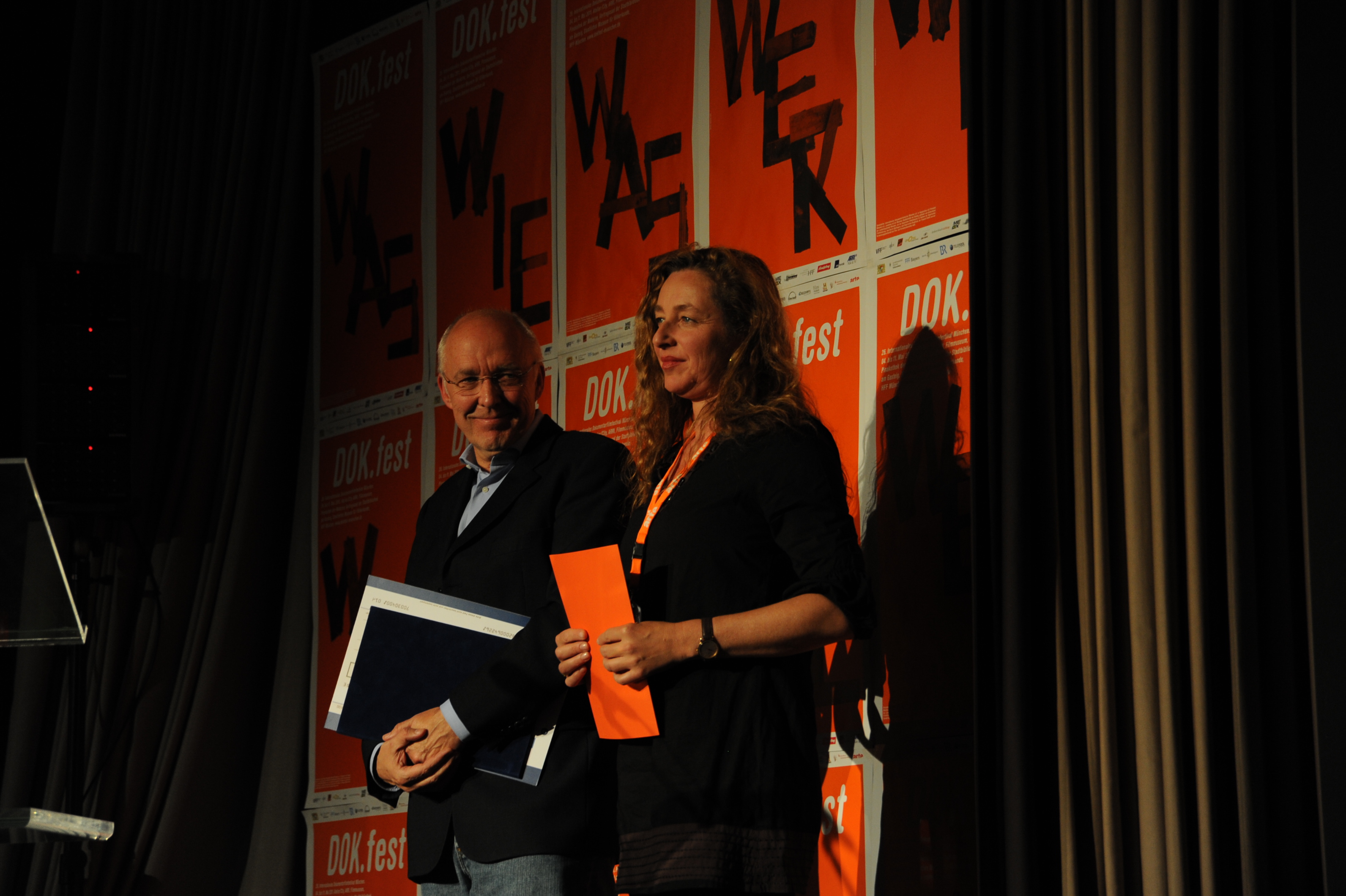 Gewinner DOK.deutsch Regisseur Dieter Schumann (WADANS WELT, li.) und Diana Iljine (Jury DOK.international) / Copyright DOK.fest - Maren Bornemann