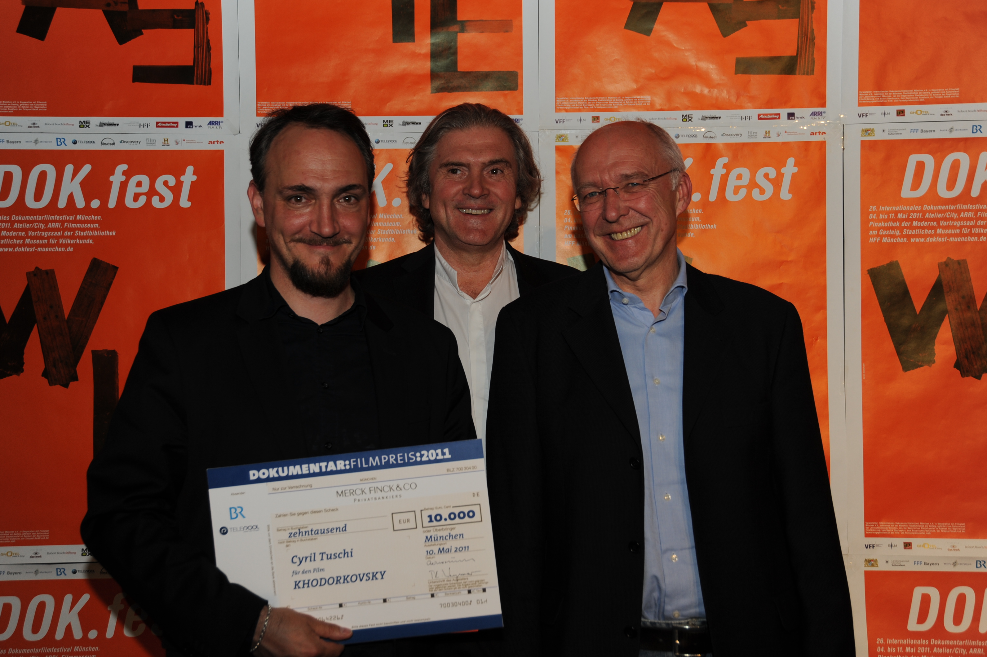v.l.n.r.: Gewinner DOK.international Regsisseur Cyril Tuschi (KHODORKOVSKY), Dr. Thomas Weymar (Telepool) und Hubert von Spreti (BR Film und Teleclub) / Copyright DOK.fest - Maren Bornemann