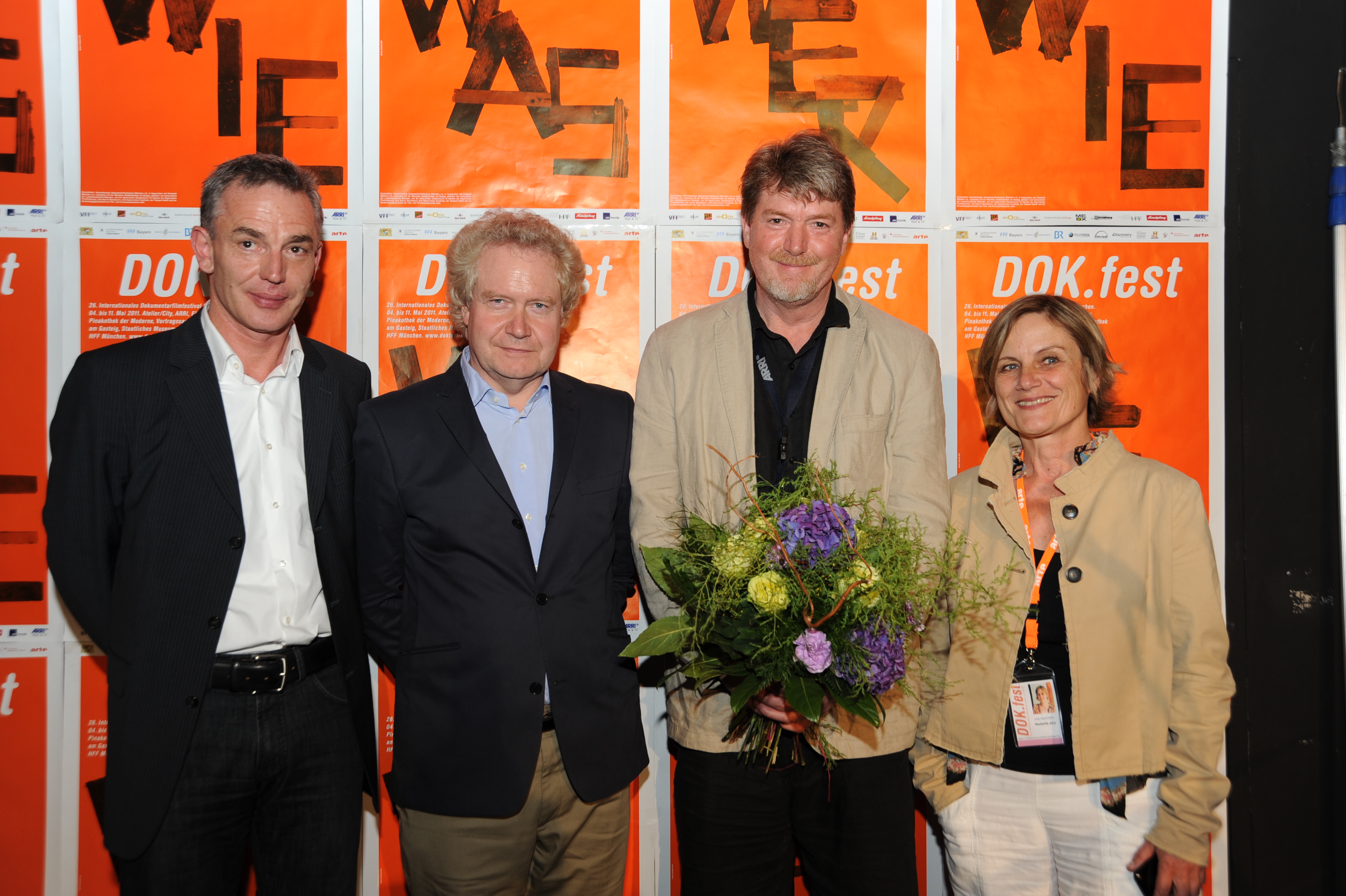 v.l.n.r.: Gewinner DOK.international Regsisseur Cyril Tuschi (KHODORKOVSKY), Dr. Thomas Weymar (Telepool), Hubert von Spreti (BR Film und Teleclub) und Festivalleiter Daniel Sponsel / Copyright DOK.fest - Maren Bornemann