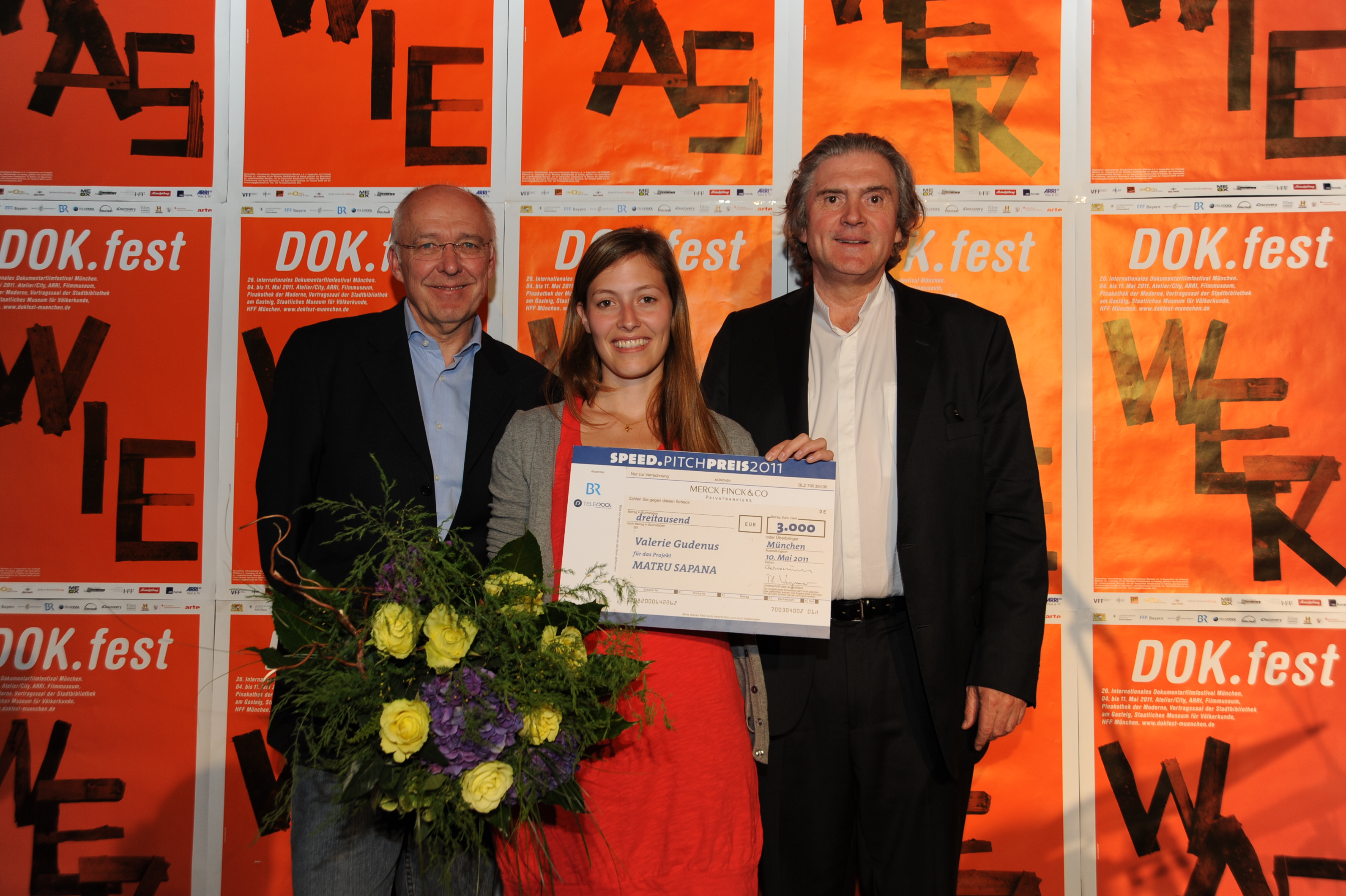 v.l.n.r.: Hubert von Spreti (BR - Film und Teleclub), Gewinnerin speed.pitch Award Valerie Gudenus und Dr. Thomas Weymar (Telepool) / Copyright DOK.fest - Maren Bornemann