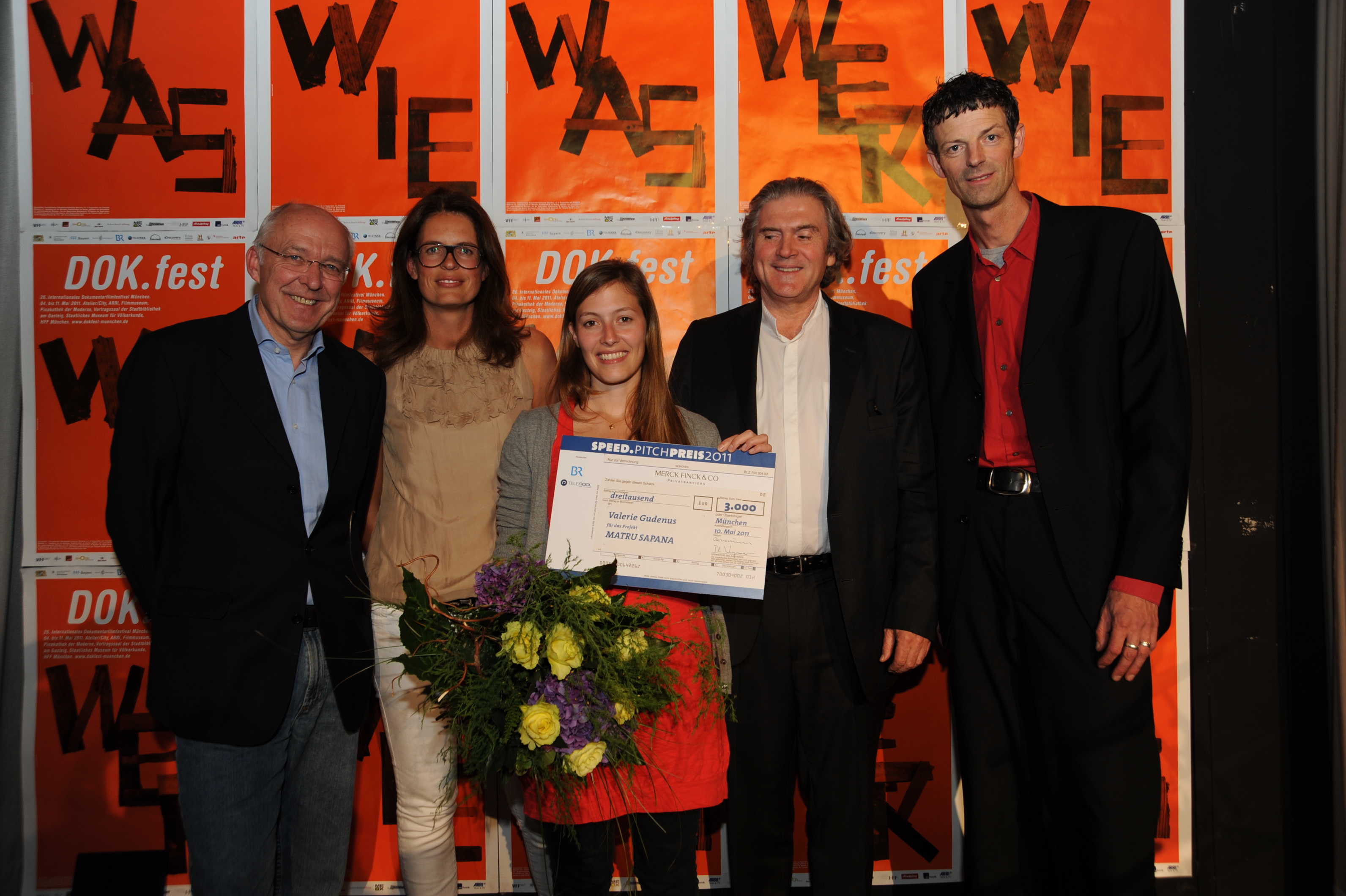 v.l.n.r.: Hubert von Spreti (BR - Film und Teleclub), Sonja Scheider (Jury speed.pitch Award), Gewinnerin speed.pitch Award Valerie Gudenus, Dr. Thomas Weymar (Telepool) und Daniel Sponsel (Festivalleiter) / Copyright DOK.fest - Maren Bornemann