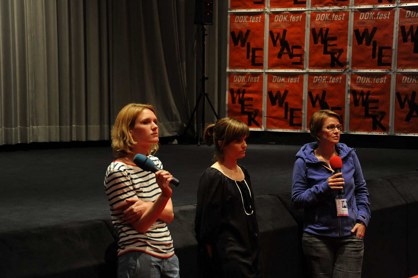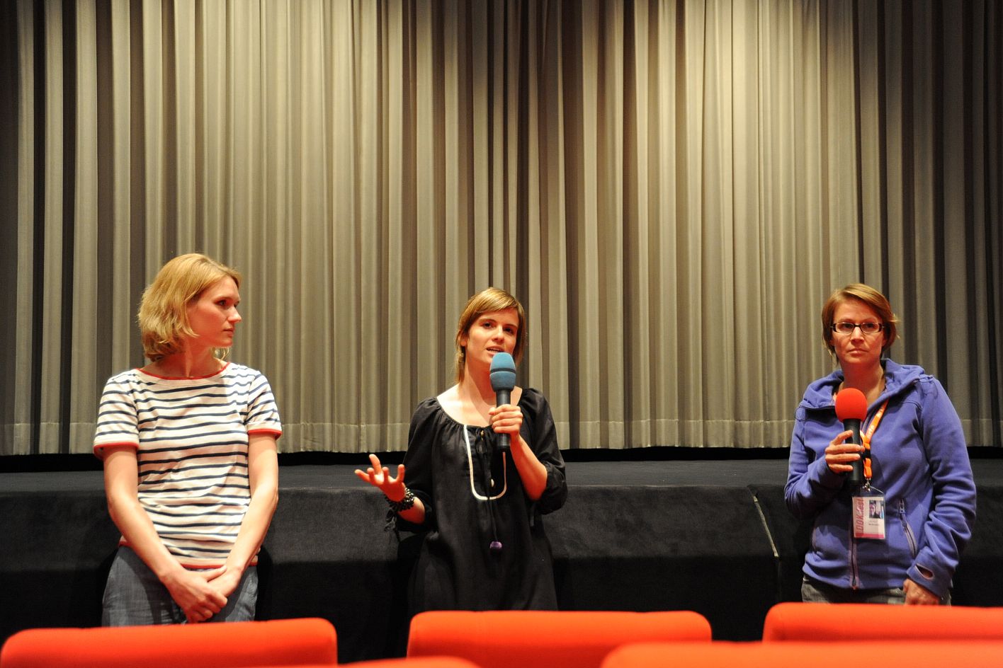 v.l.n.r.: Regisseurinnen Mareille Klein (AUF TEUFEL KOMM RAUS), Julie Kreuzer (AUF TEUFEL KOMM RAUS) und Moderatorin Julia Bayer (DOK.fest) / Copyright DOK.fest - Maren Bornemann