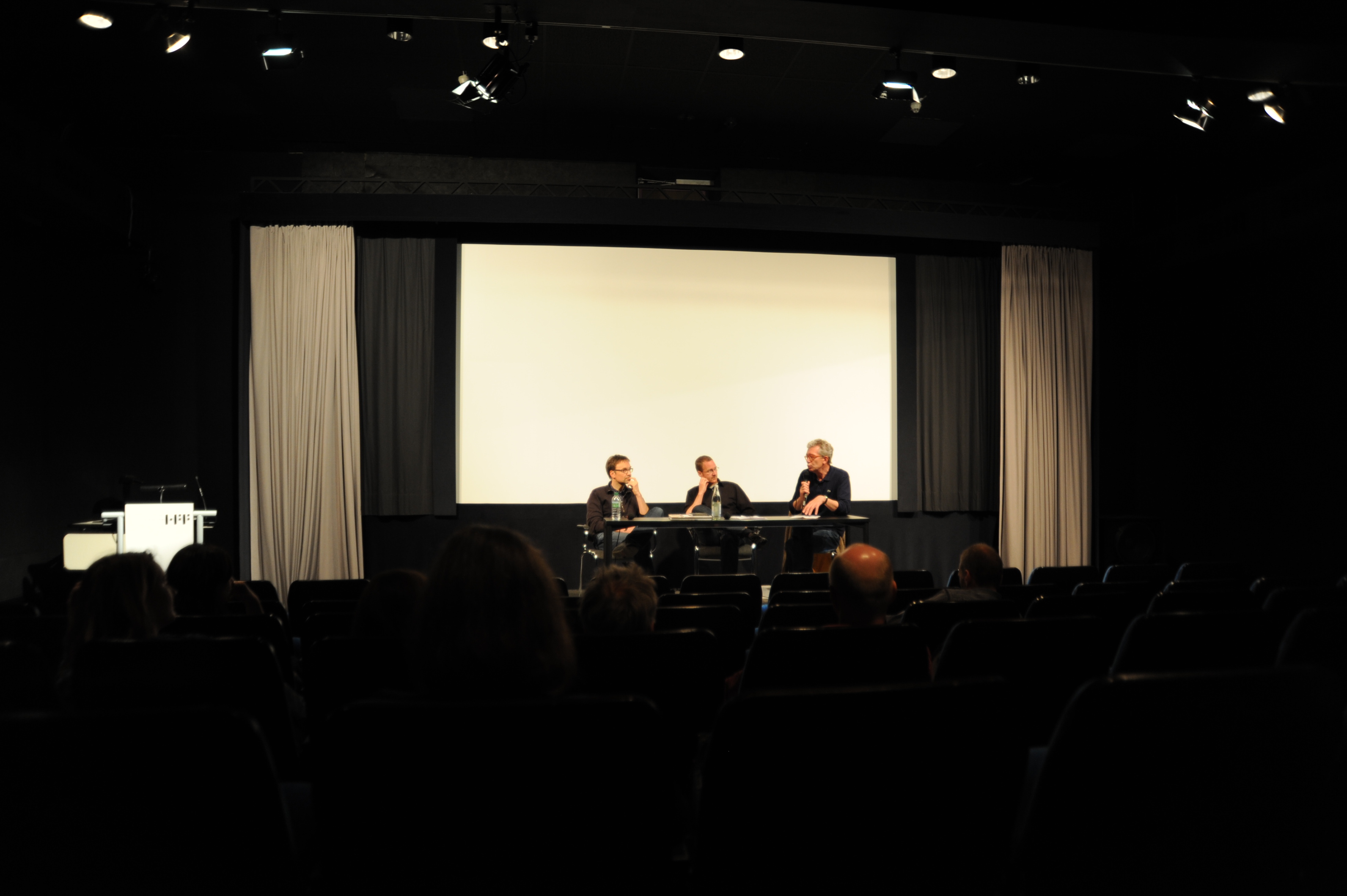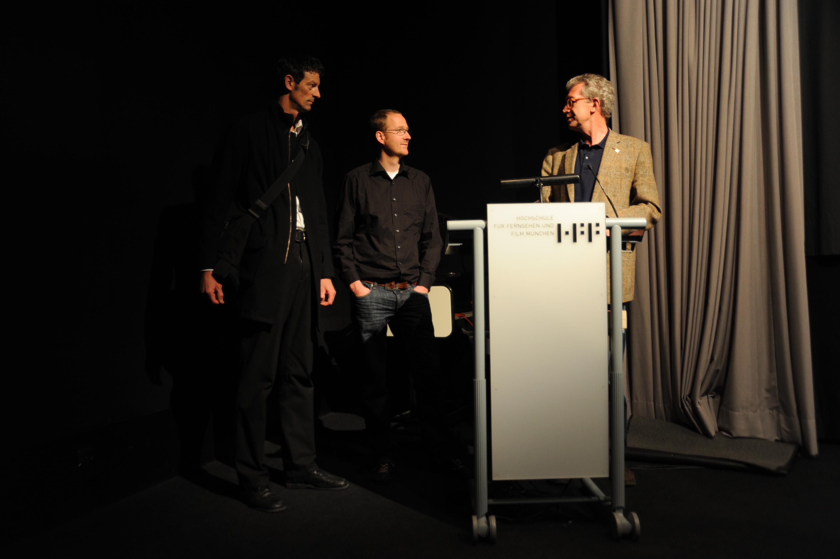 filmschool.forum HFF-Atelier v.l.n.r.: Regisseur Jörg Adolph (HOW TO MAKE A BOOK WITH STEIDL), Regisseur Gereon Wetzel (HOW TO MAKE A BOOK WITH STEIDL) und Prof. Heiner Stadler (HFF) / Copyright DOK.fest - Maren Bornemann