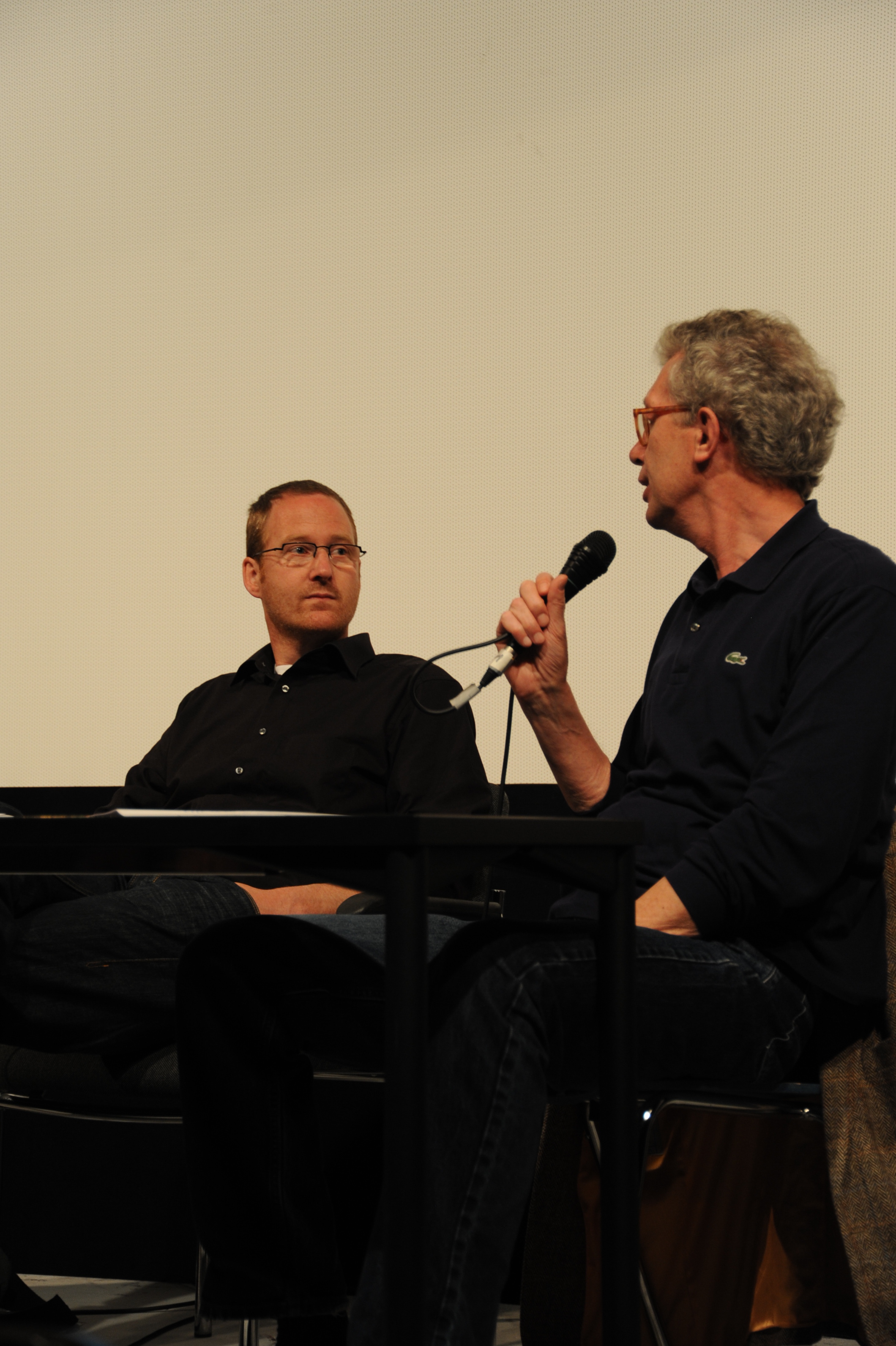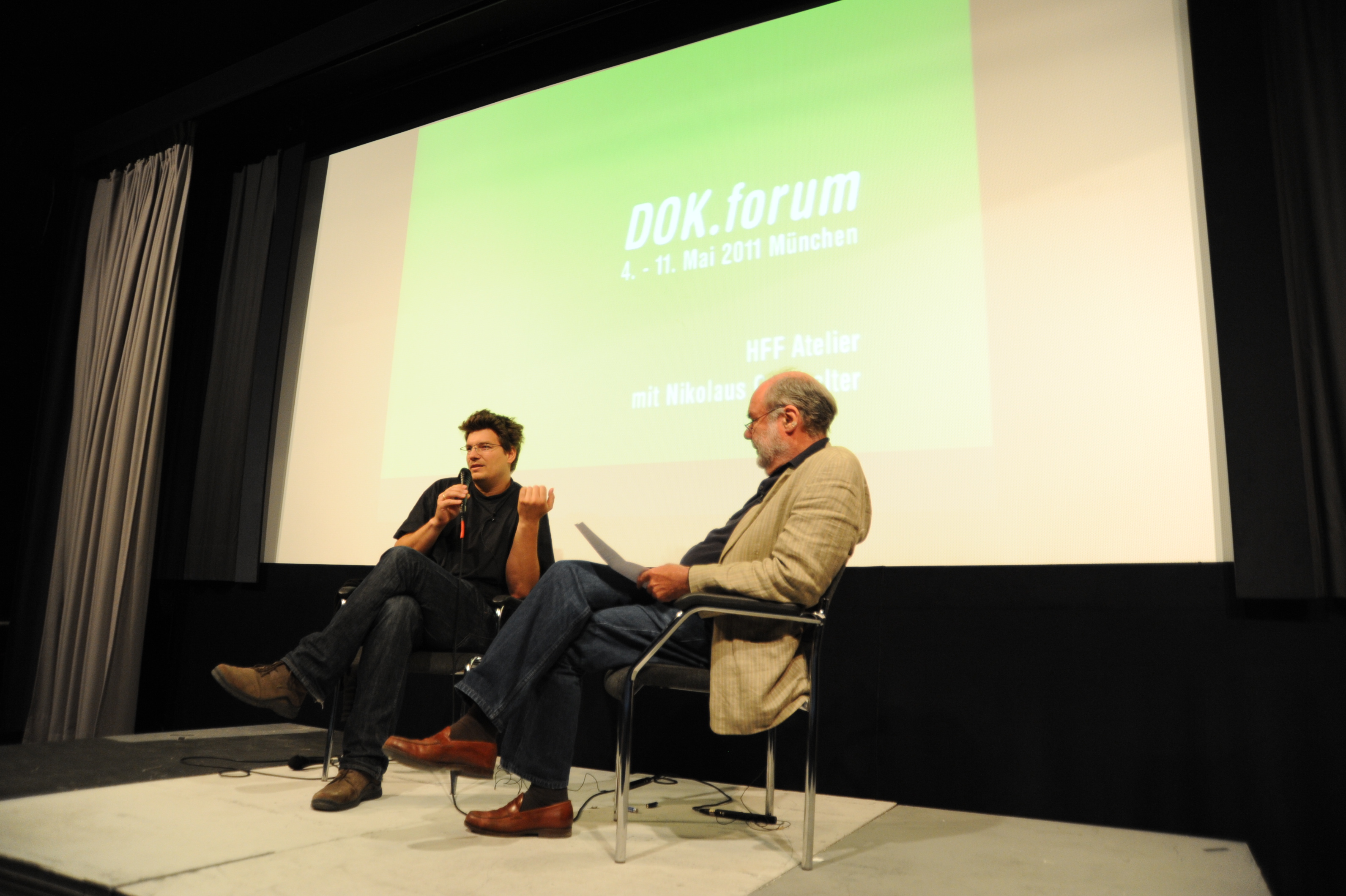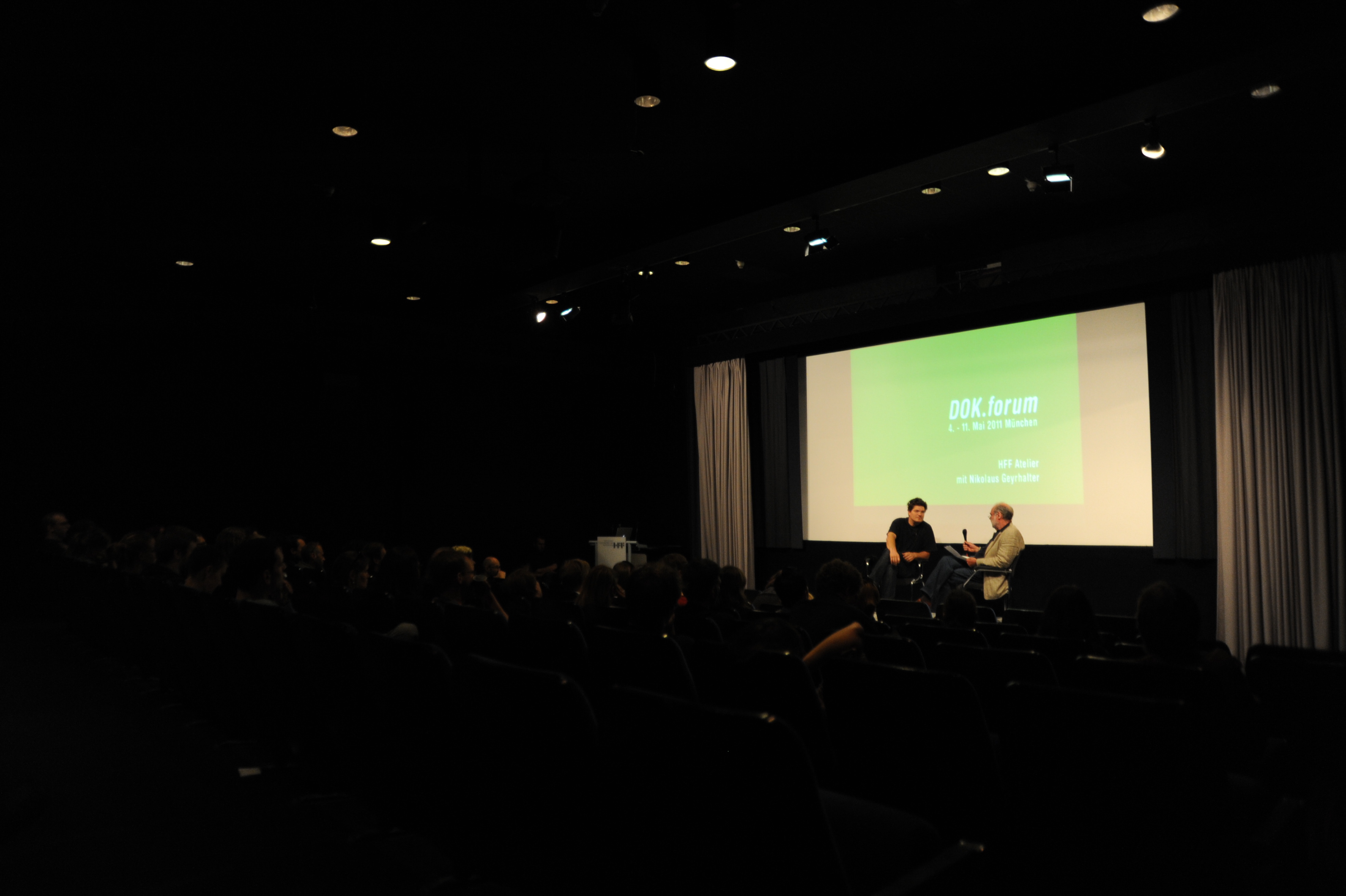 filmschool.forum HFF-Atelier mit Regisseur Nikolaus Geyrhalter (ABENDLAND, li.) und Prof. Alex Block (HFF, re.) / Copyright DOK.fest - Maren Bornemann