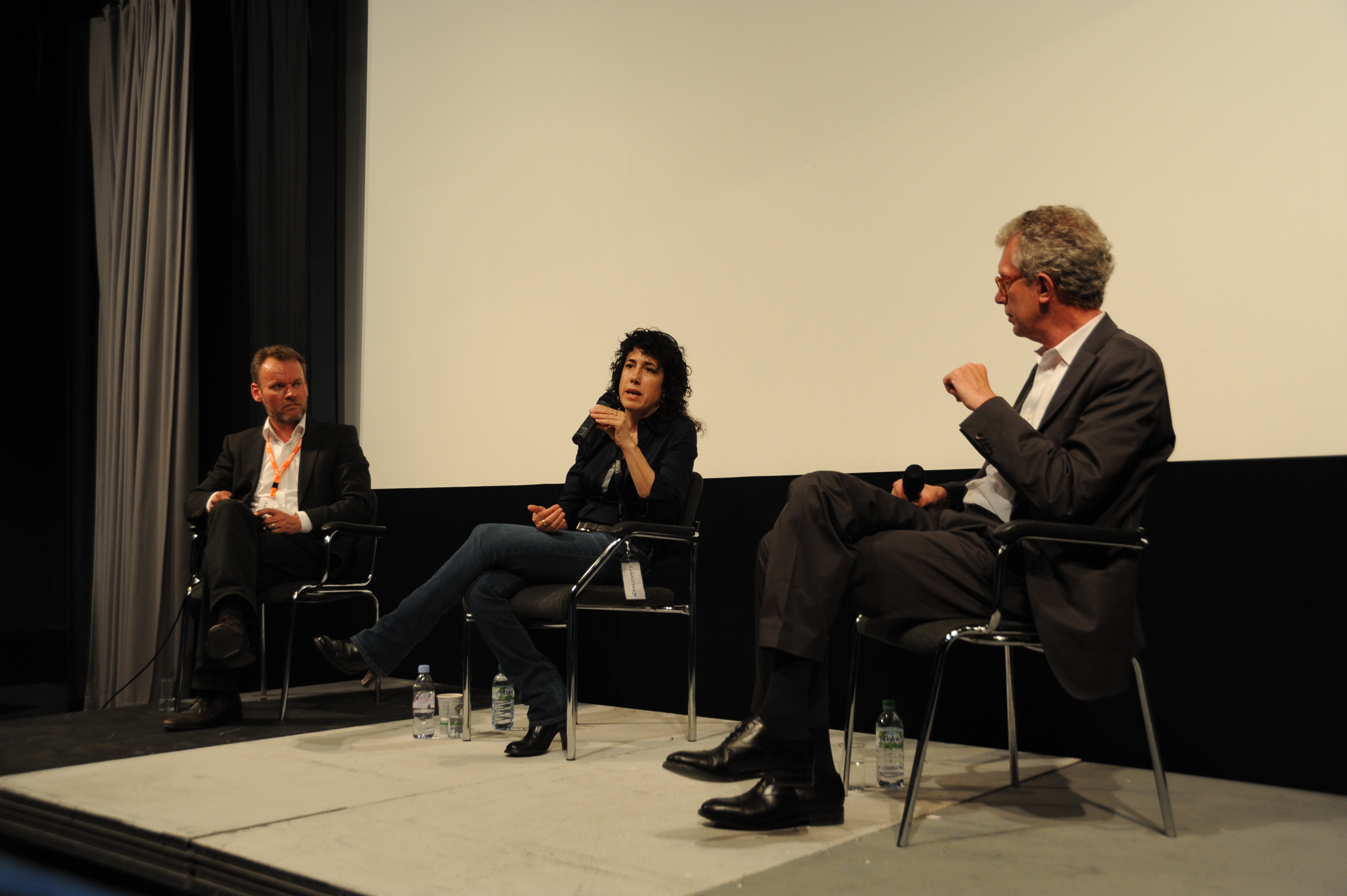 filmschool.forum HFF-Atelier v.l.n.r. mit Jan Sebening (DOK.fest), Regisseurin Jennifer Fox (MY REINCARNATION) und Prof. Heiner Stadler (HFF) / Copyright DOK.fest - Maren Bornemann