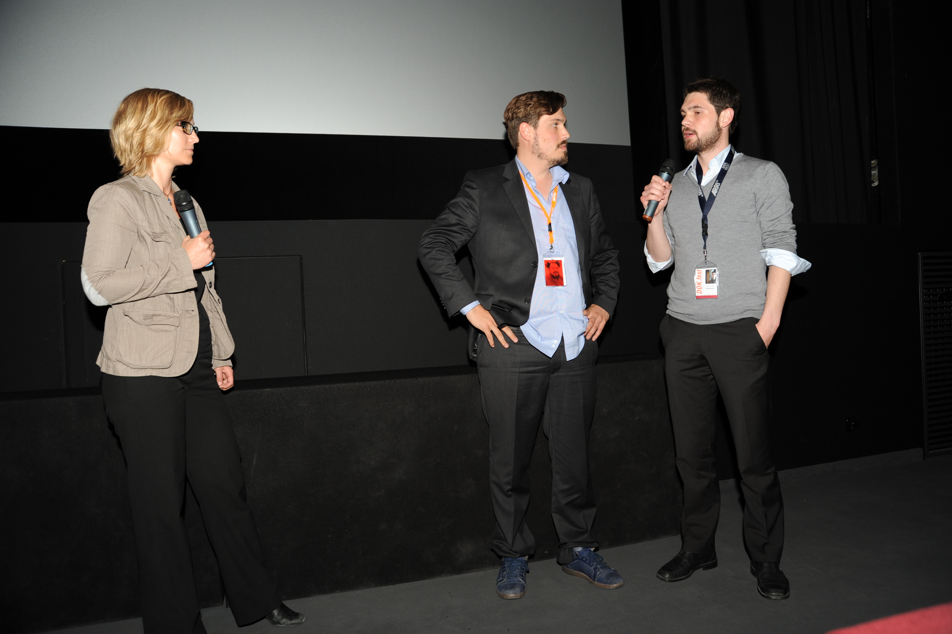 v.l.n.r.: Moderatorin Kathrin John (DOK.fest), Regisseur Moritz Binder (LAGEÄNDERUNG) und Regisseur Korbinian Dufter (LAGEÄNDERUNG) beim filmschool.forum HFF-Screening / Copyright DOK.fest - Maren Bornemann