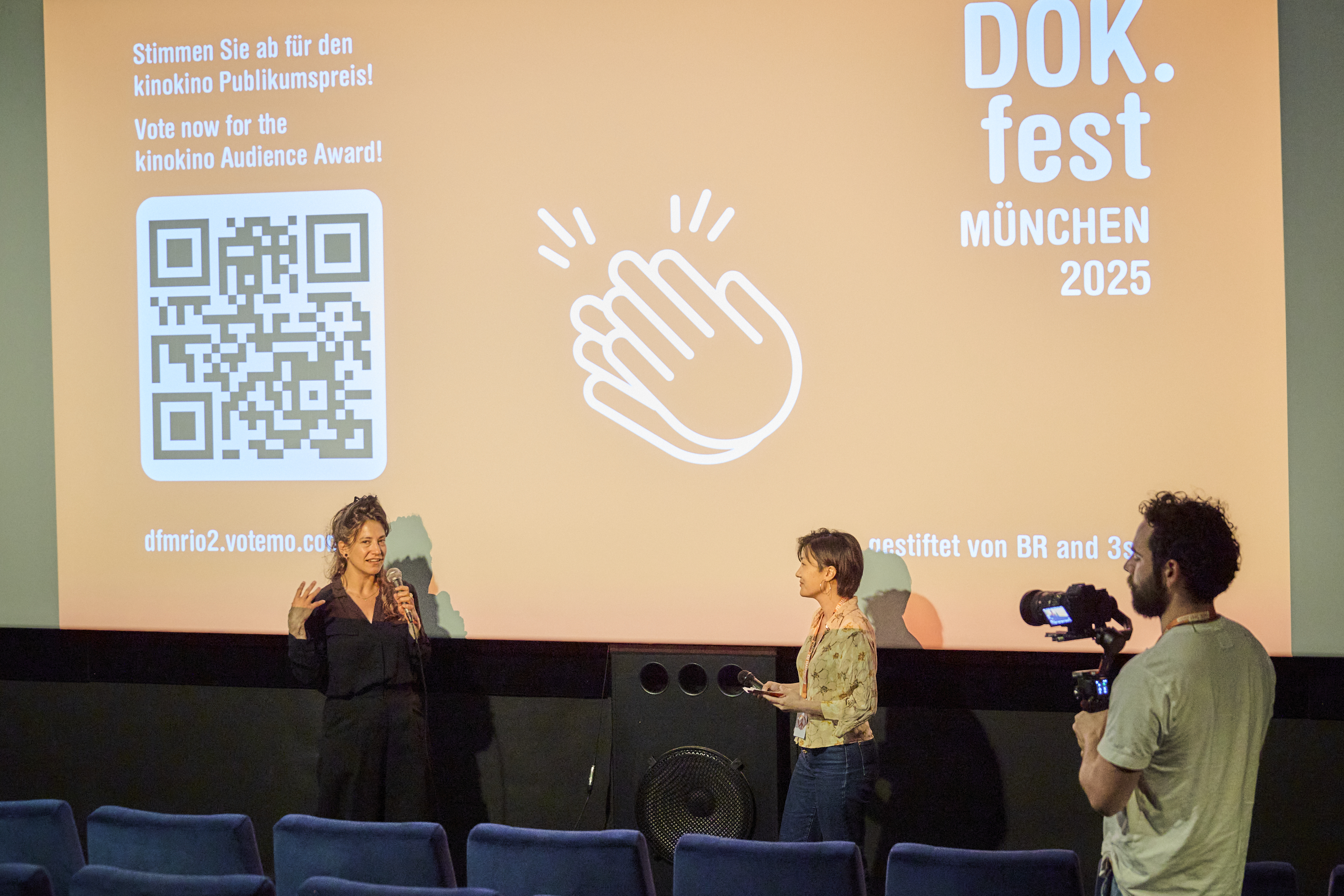 Filmemacherin Shakked Auerbach, Moderatorin Azem Bekturova und Videograf Ben Reiss / (c) Screening STRANGE BIRDS DOK.fest München 2025