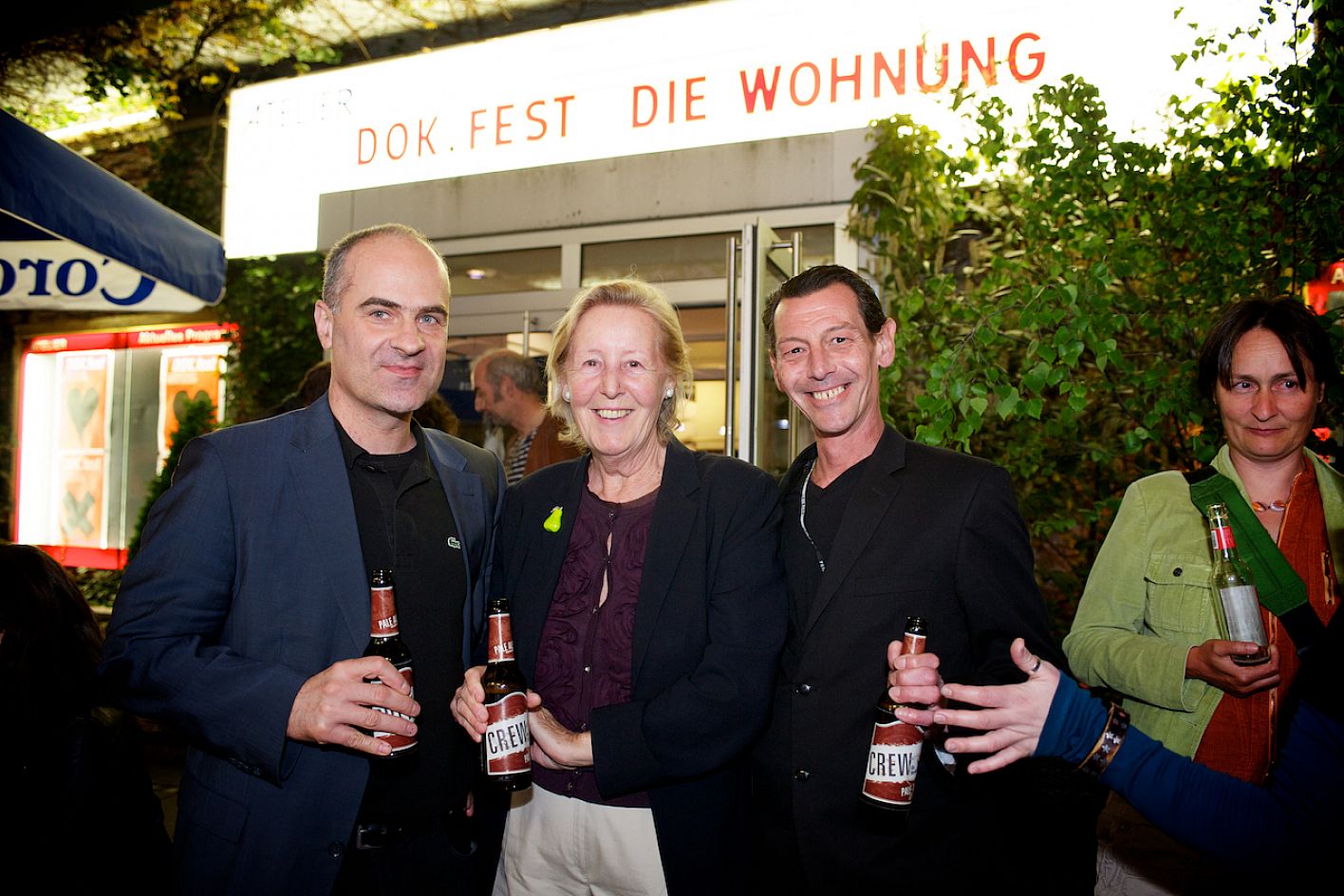 Eröffnung DOK.fest 2012, Innenhof City Kinos, Sabine Kastius (BR), Martin Gessecker (Bildender Künstler) und Moritz Holfelder (DOK.fest/BR) mit Begleitung / Copyright DOK.fest - Rainer Möller