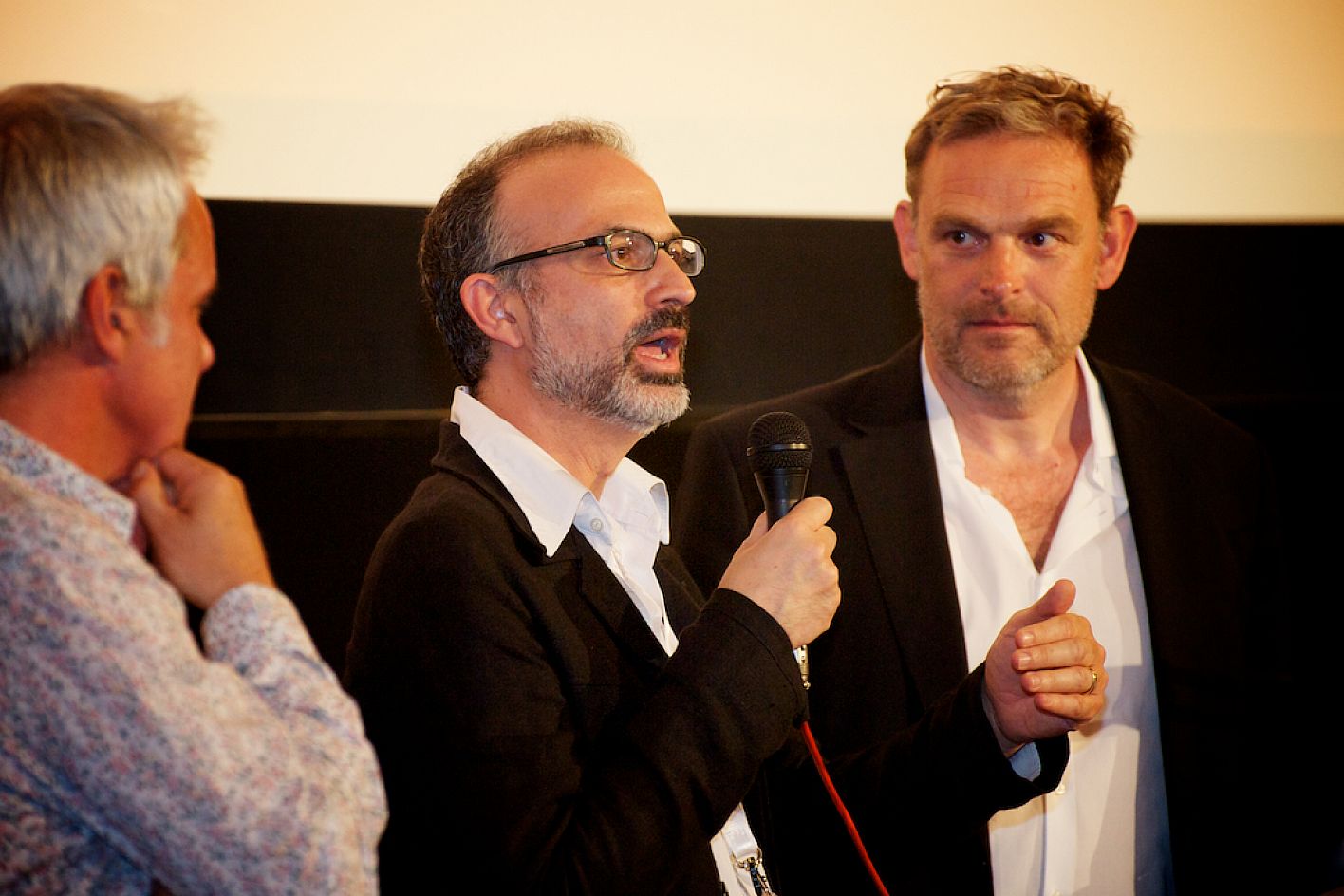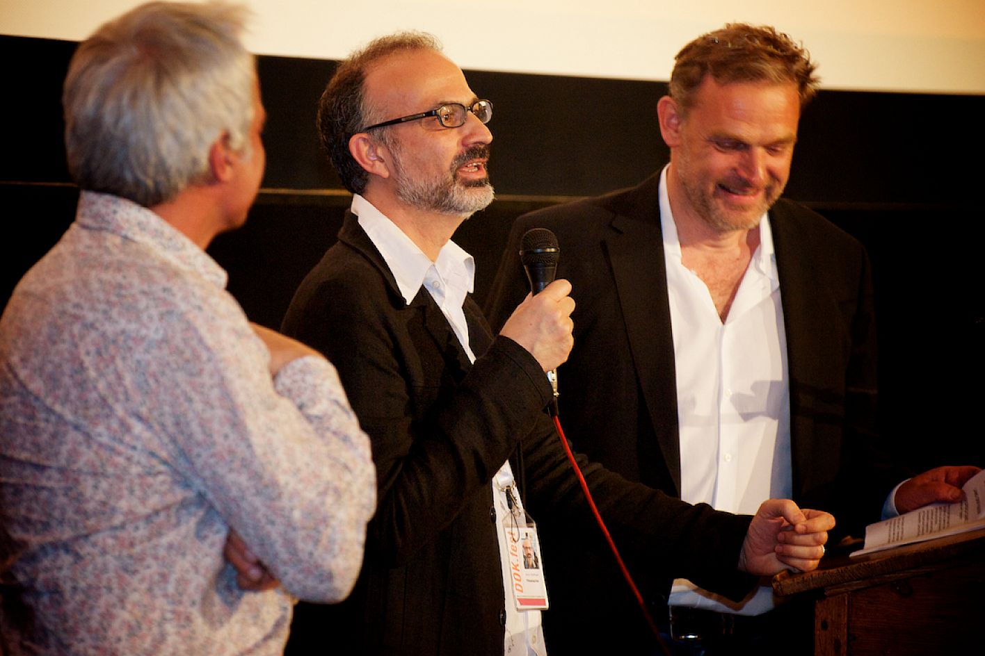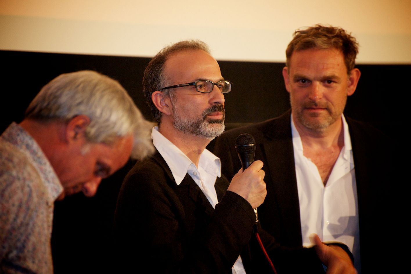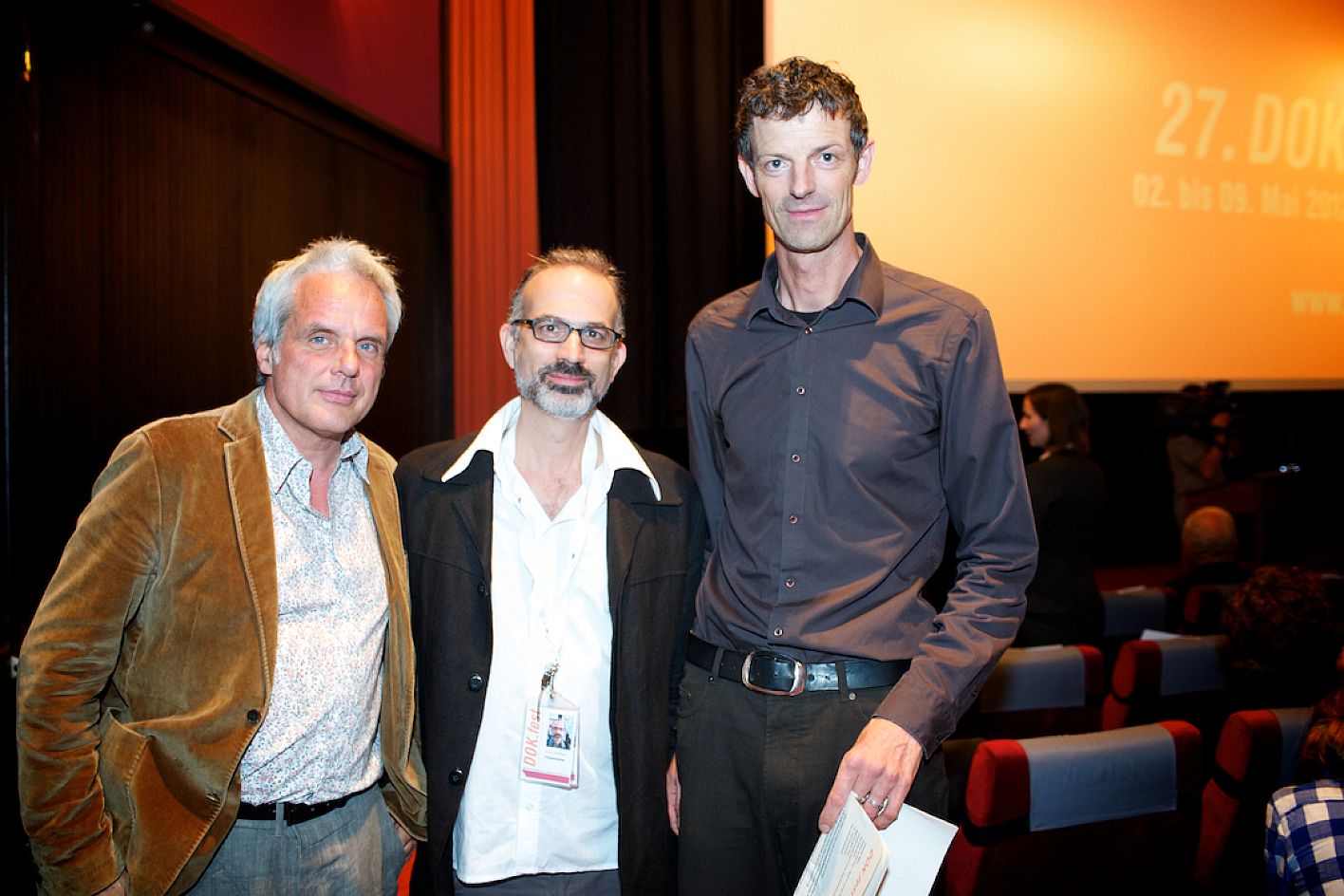 Eröffnung DOK.fest 2012, City Kino, v.l.n.r.: Thomas Kufus (Produzent zeroone), Arnon Goldfinger (Regisseur Eröffnungsfilm: "The flat") und Moritz Holfelder (DOK.fest/BR) / Copyright DOK.fest - Rainer Möller