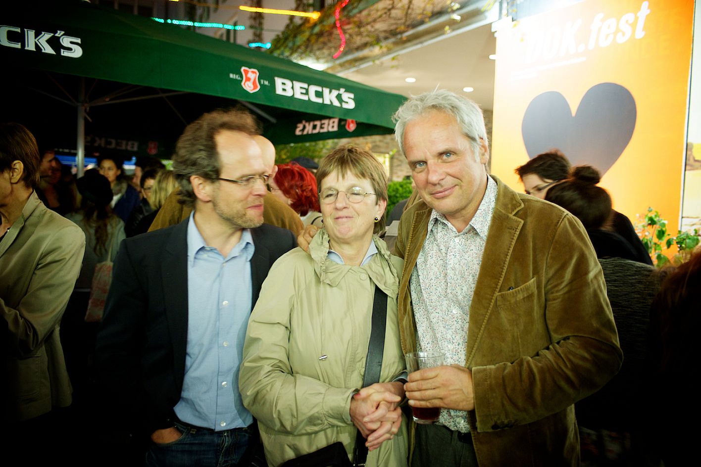 Eröffnung DOK.fest 2012, Innenhof City Kinos, v.l.n.r.: Claas Danielsen (DOK Leipzig Festivalleitung), Ulla Weßler (DOK.fest / Filmstadt München) und Thomas Kufus (zeroone) / Copyright DOK.fest - Rainer Möller