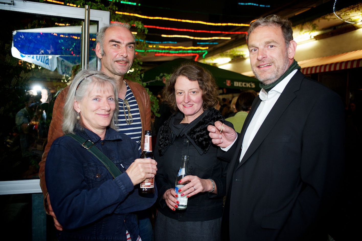 Eröffnung DOK.fest 2012, Innenhof City Kinos, v.l.n.r.: Prof. Heiner Stadler (HFF), Andrea Kuhn (DOK.guest Kuratorium), Francine Brücher (Swiss Films), Jerome Brunaud (Brunaud sales) / Copyright DOK.fest - Rainer Möller