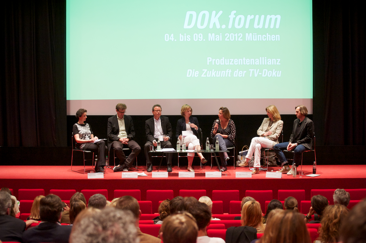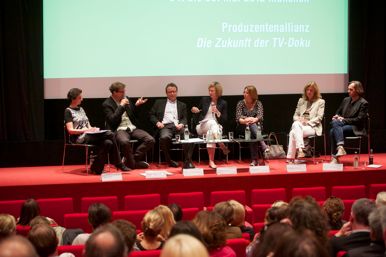 2012 DOK.forum: Produzentenallianz DIE ZUKUNFT der TV-DOKU, HFF München v.l.n.r.: Dr. Katja Wildermuth (MDR Redaktionsleiterin), Dagmar Biller (Produzentin und Geschäftsführerin TANGRAM International GmbH / Vorstandsvorsitzende der Sektion Dokumentation der Produzentenallianz), Prof. Dr. Klaus Schaefer (Geschäftsführer FilmFernsehFonds Bayern), Claudia Tieschky (Moderatorin / Medienredakteurin Süddeutsche Zeitung), Florian Falkenstein (Vice President Reportage & Factual Dokutainment), Petra Felber (BR), Dietmar Lyssy (Journalist), Daniel Sponsel (Festivalleiter und Geschäftsführer DOK.fest München) / Copyright DOK.fest - Rainer Möller