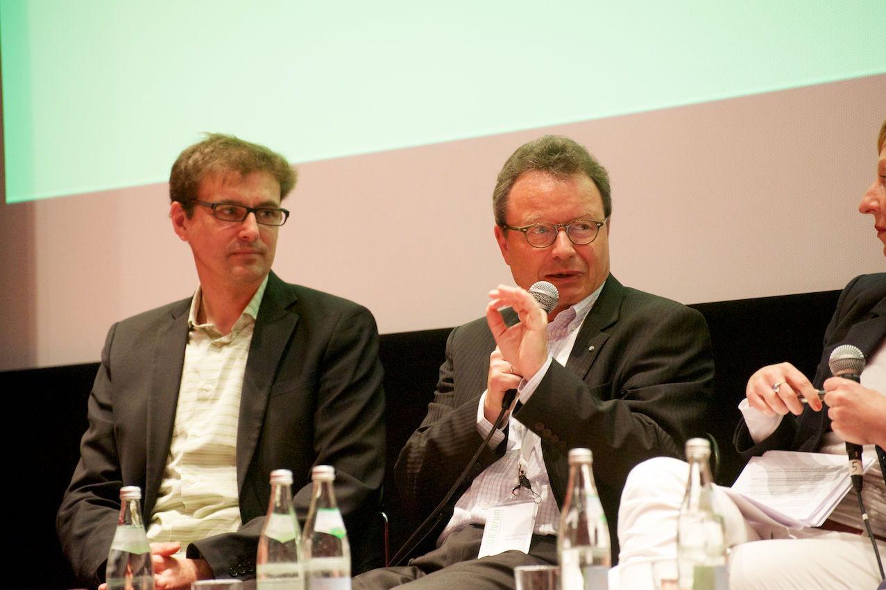 2012 DOK.forum: Produzentenallianz DIE ZUKUNFT der TV-DOKU, HFF München v.l.n.r.: Prof. Dr. Klaus Schaefer (Geschäftsführer FilmFernsehFonds Bayern), Claudia Tieschky (Moderatorin / Medienredakteurin Süddeutsche Zeitung) / Copyright DOK.fest - Rainer Möller