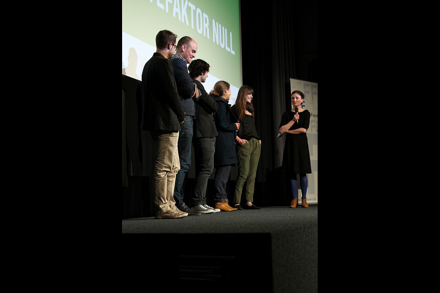 Das Team vom Eröffnungsfilm ERNTEFAKTOR NULL und Nora Moschüring (re., DOK.forum) / Copyright DOK.fest - Katharina Kirisics