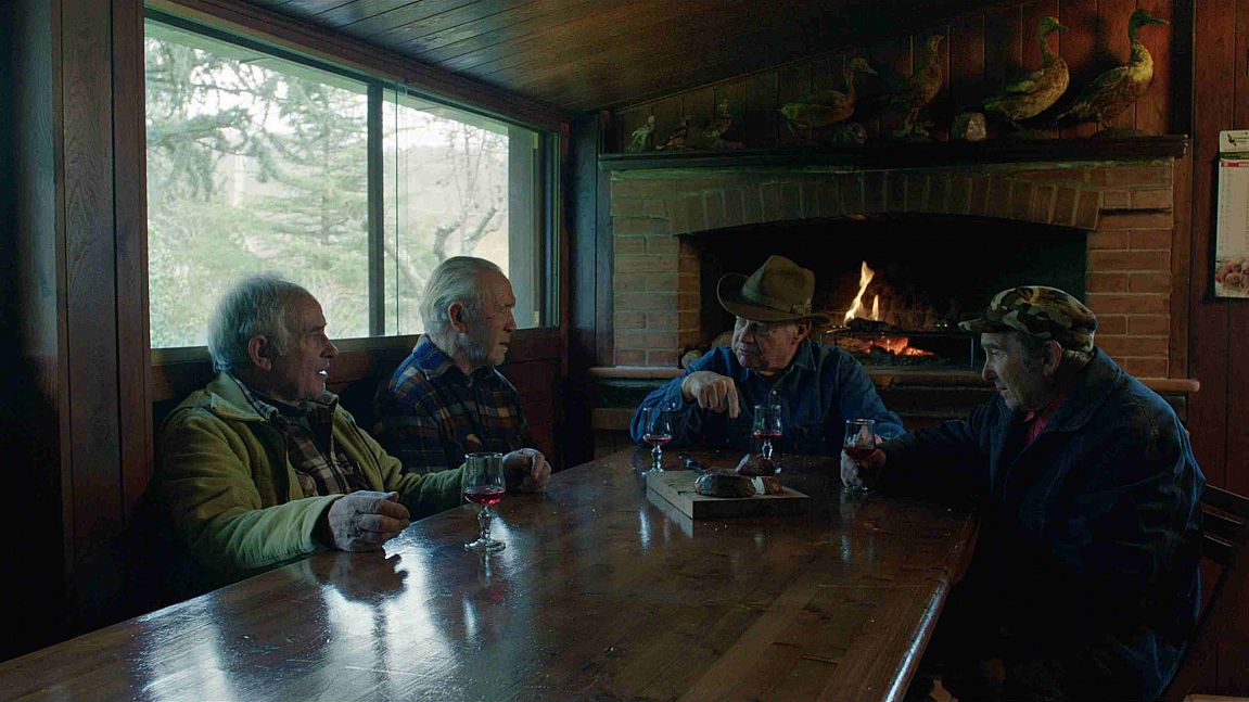 A group of hunters meet in a hunting lodge. The men have grown old and recall that there was once a hermit in a cave in the woods where they hunted wild boar. Or perhaps he is still there?