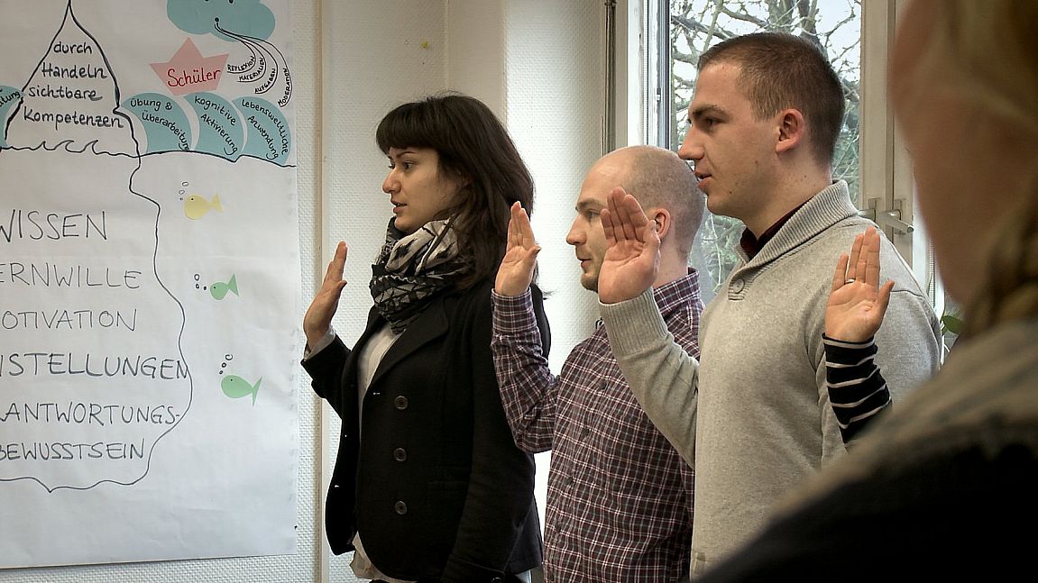 Wissen, Motivation, Verantwortungsbewusstsein – das sollen die Berliner Lehramtsstudenten Anna, Katja und Ralf, die gerade ihr zweijähriges Referendariat an einer Schule angetreten haben, mitbringen. Zum ersten Mal stehen sie vor einer Klasse, müssen sich in ihrer Rolle als Lehrer behaupten und sind doch selbst noch Lernende – eine seltsame und oft frustrierende Zwittersituation. „Was für ein Lehrer will ich sein?“, fragen sie sich immer wieder und schwanken zwischen Freude und Frust, Idealismus und Zweifeln an ihrem künftigen Beruf und sich selbst. ZWISCHEN DEN STÜHLEN lässt sich viel Zeit für Beobachtungen, ist ganz nah dran an den Protagonisten und macht eindrücklich die Kluft zwischen pädagogischer Theorie und schulischer Praxis erfahrbar. Monika Haas
